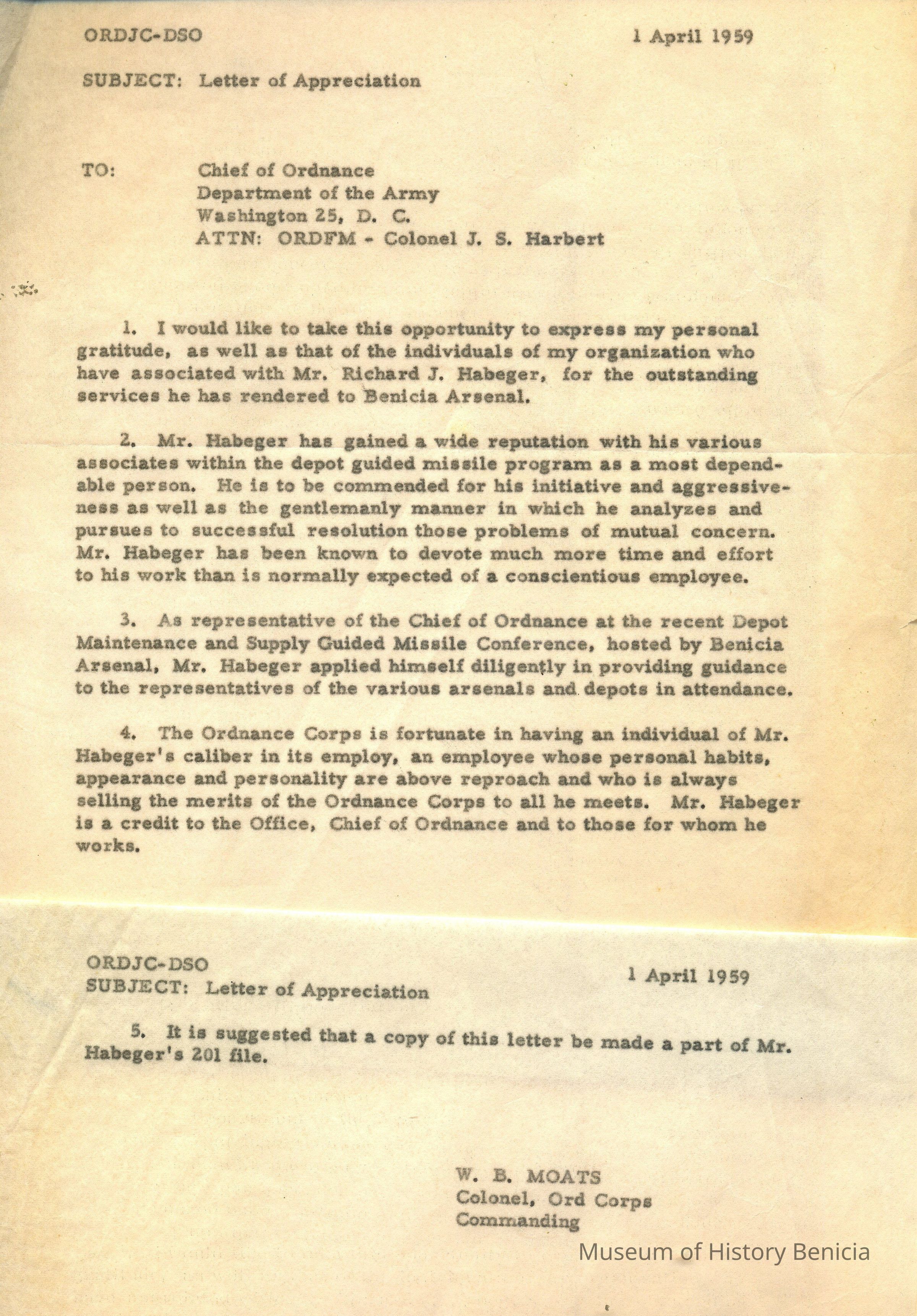 Letter of Appreciation dated April 1, 1959, for service and reputation of Mr. Richard J. Habeger written by W.B. Moats, Colonel, Ordnance Corps, Commanding; sent to Chief of Ordnance, Dept. of the Army, Washington 25, D.C. Attn: Colonel J.S. Harbert.Collection
