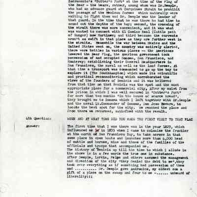 He responds that a one mile section was transferred to Dr. Semple of which General Vallejo reserved some plots for himself and the net profits from the "fary boats (sic)".