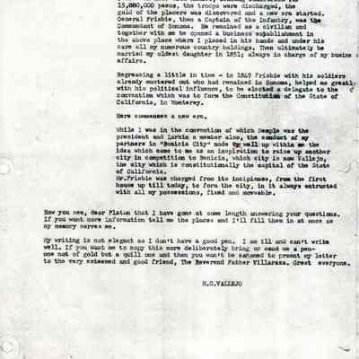 The letter then discusses the constitutional convention, establishment of the city of Vallejo, General Frisbie's involvement with Vallejo and marriage to his daughter, etc.Collection