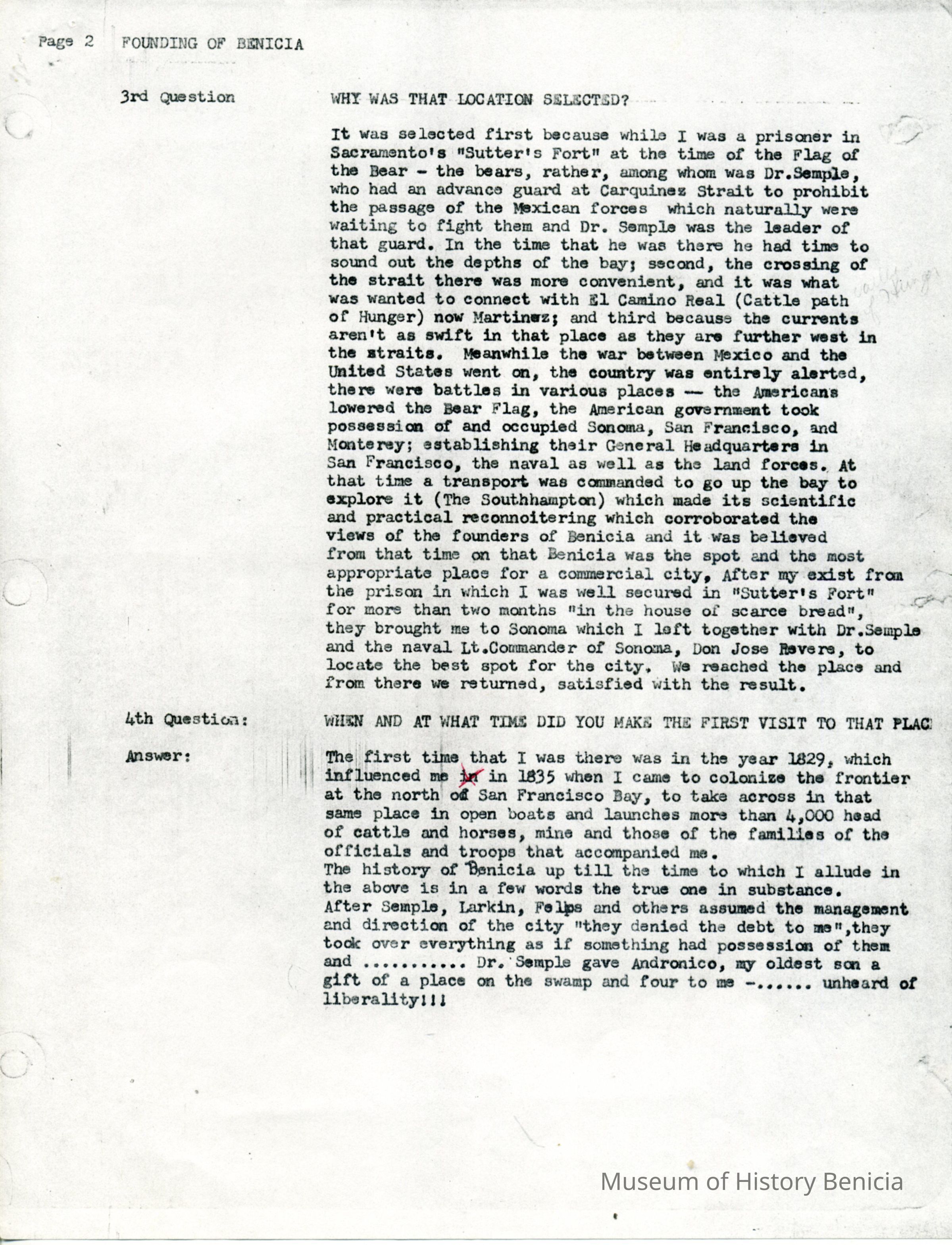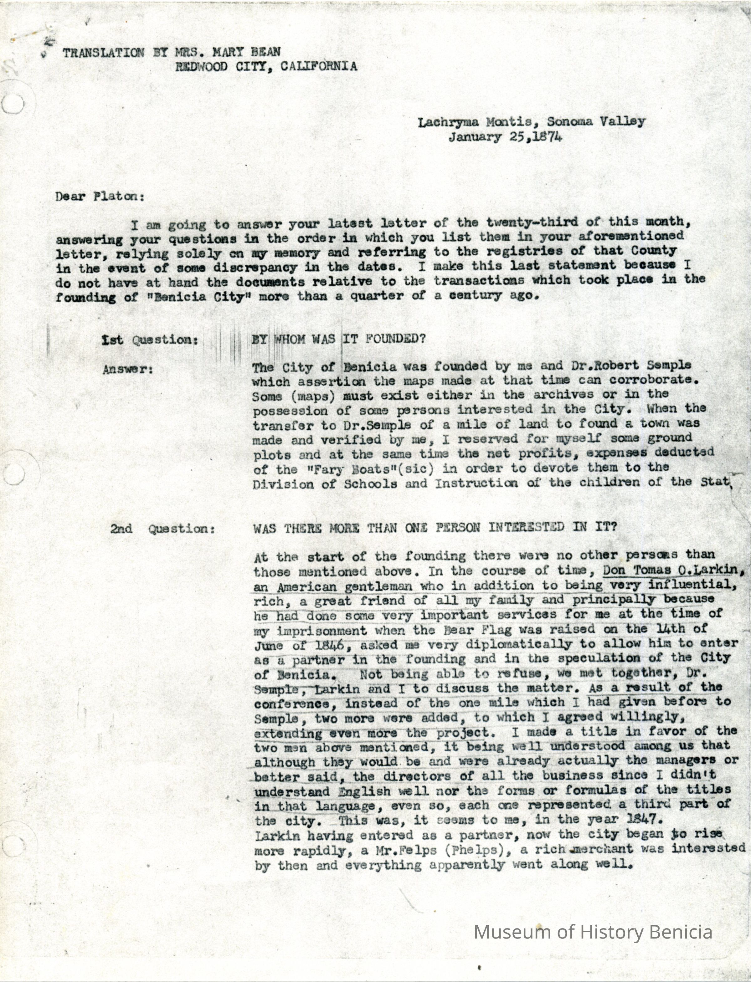 This is a copy of the translation of a letter from General M.G. Vallejo to his son Dr. Platon. It is a response to Dr. Platon regarding some questions he asked General Vallejo about his recollection of the establishment of the city of Benicia. General Vallejo answers 4 major questions: