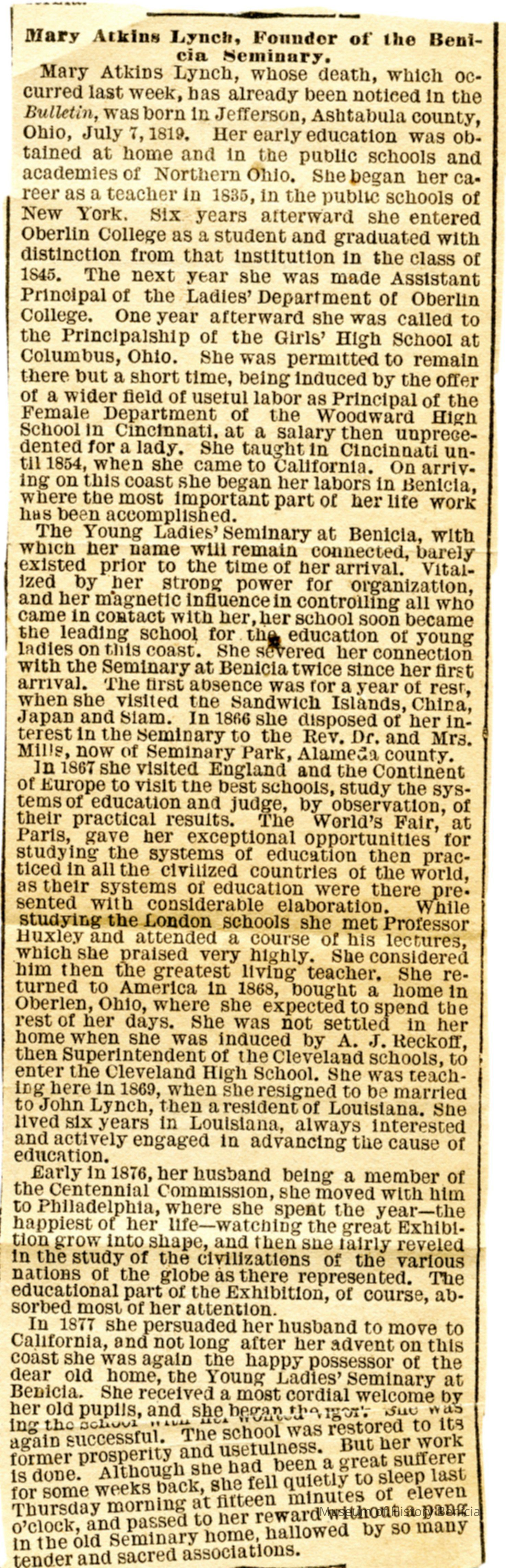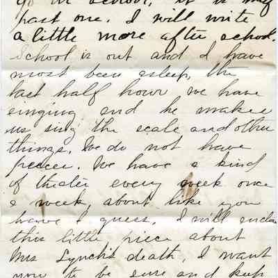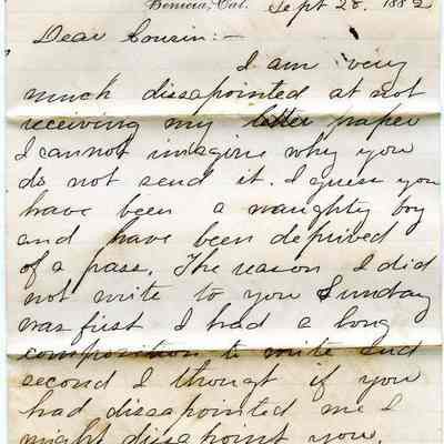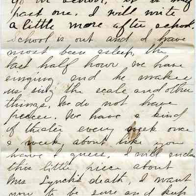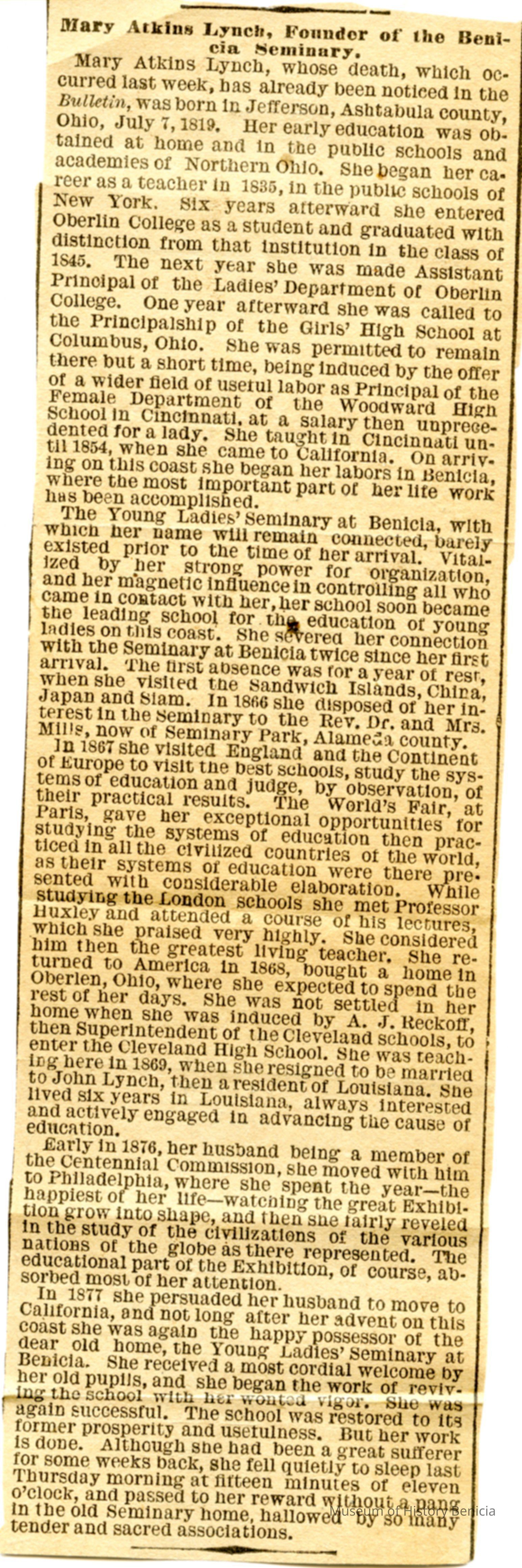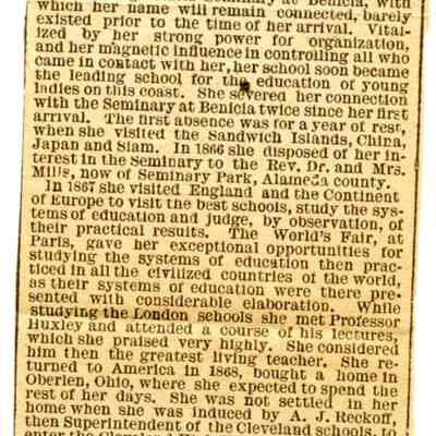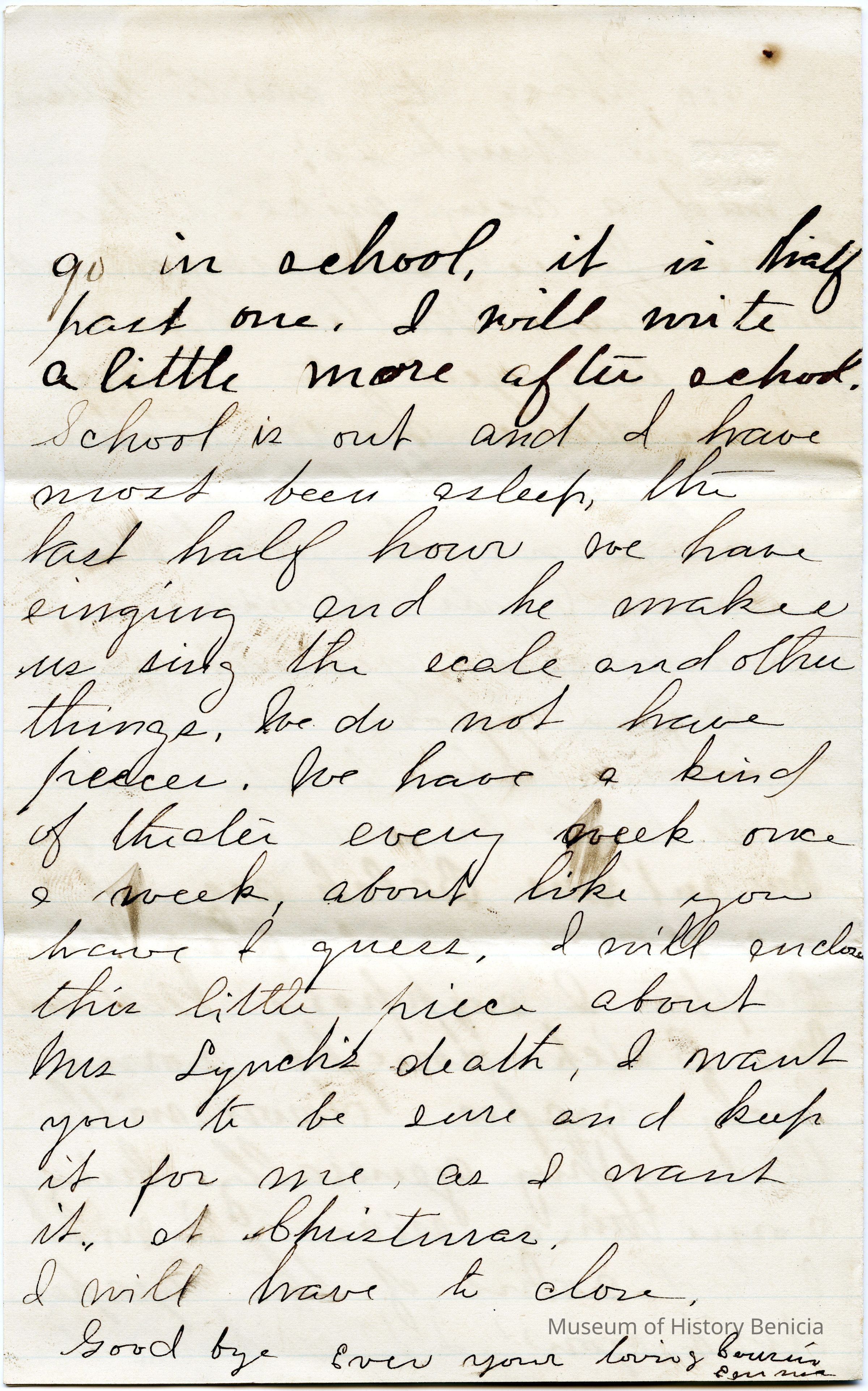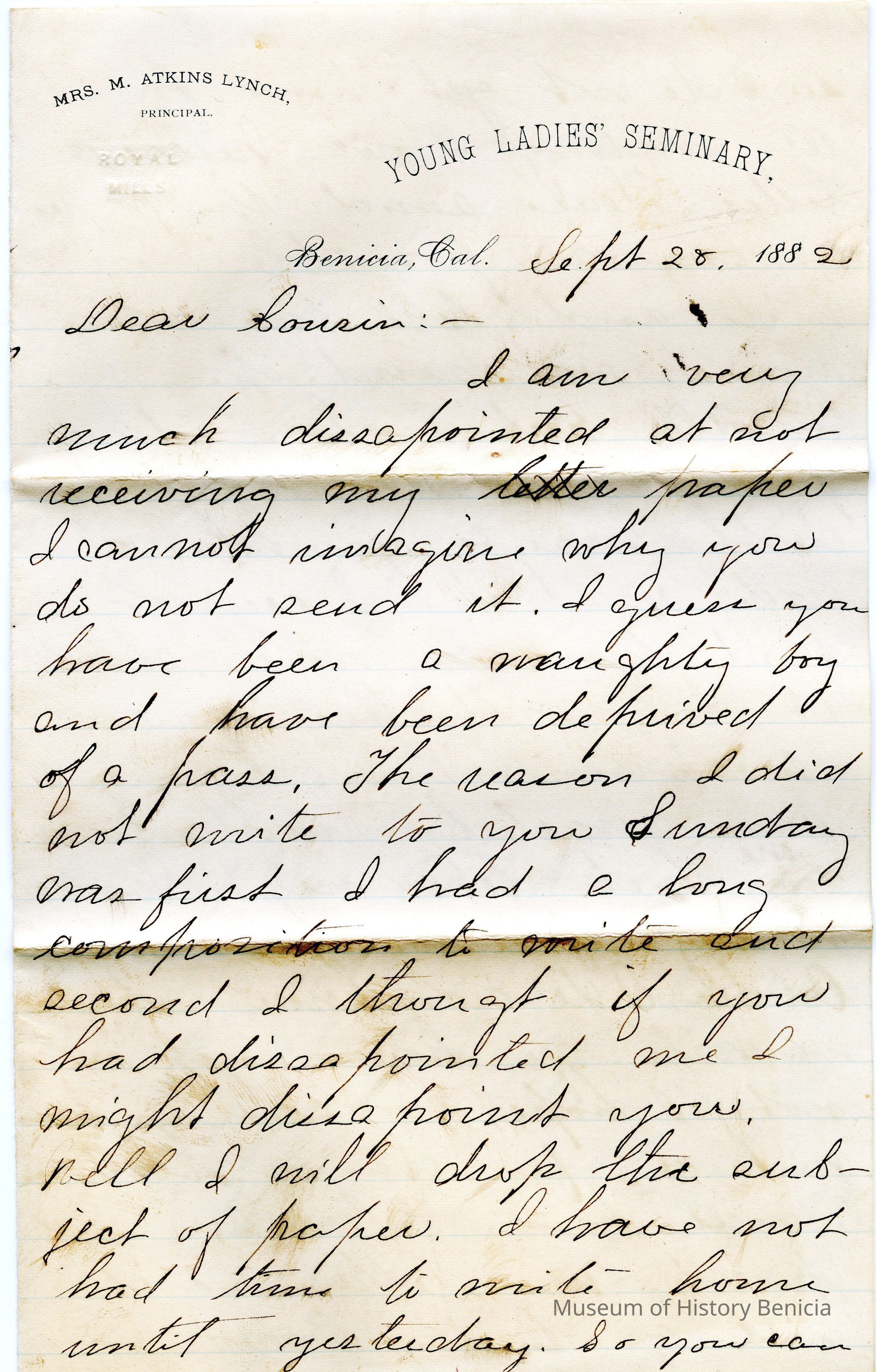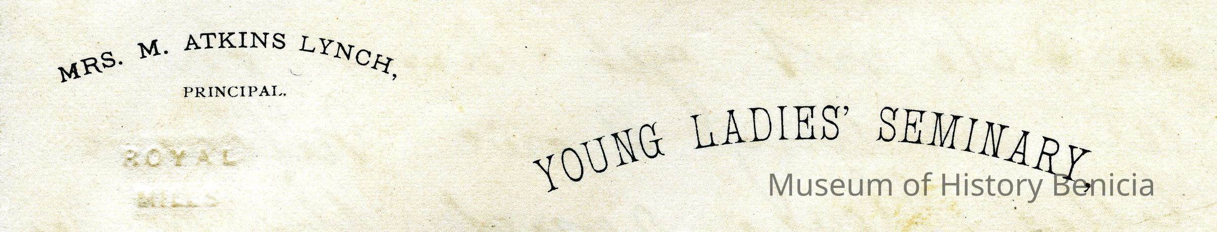 This is a letter from Emma at the Young Ladies Seminary in Benicia to her cousin at the California Military Academy in Oakland. The letter is on YLS stationary. She is very interested in getting back a paper of hers that he has. Besides this, she talks about her family, going home at their next vacation, activities at her school, her father's law suit, etc. One important thing that she mentions is the death of the school's head, Mrs. M. Atkins Lynch, and she encloses her obituary. Her cousin is Mr. William H. Sharp of The Dalles Oregon.