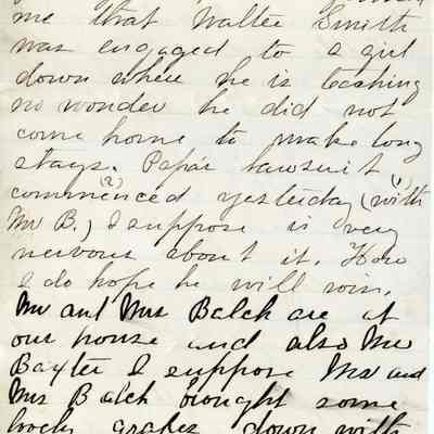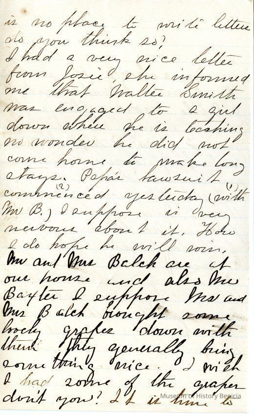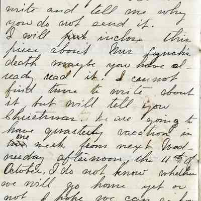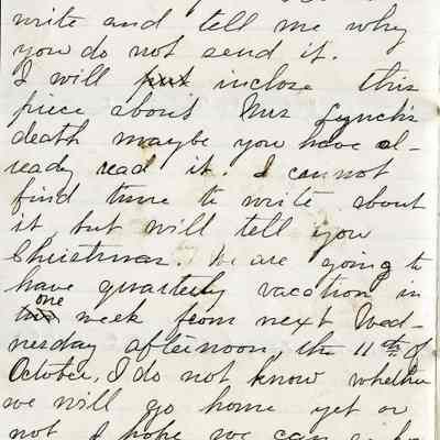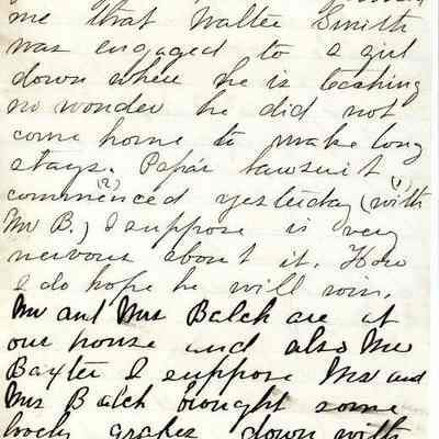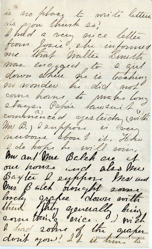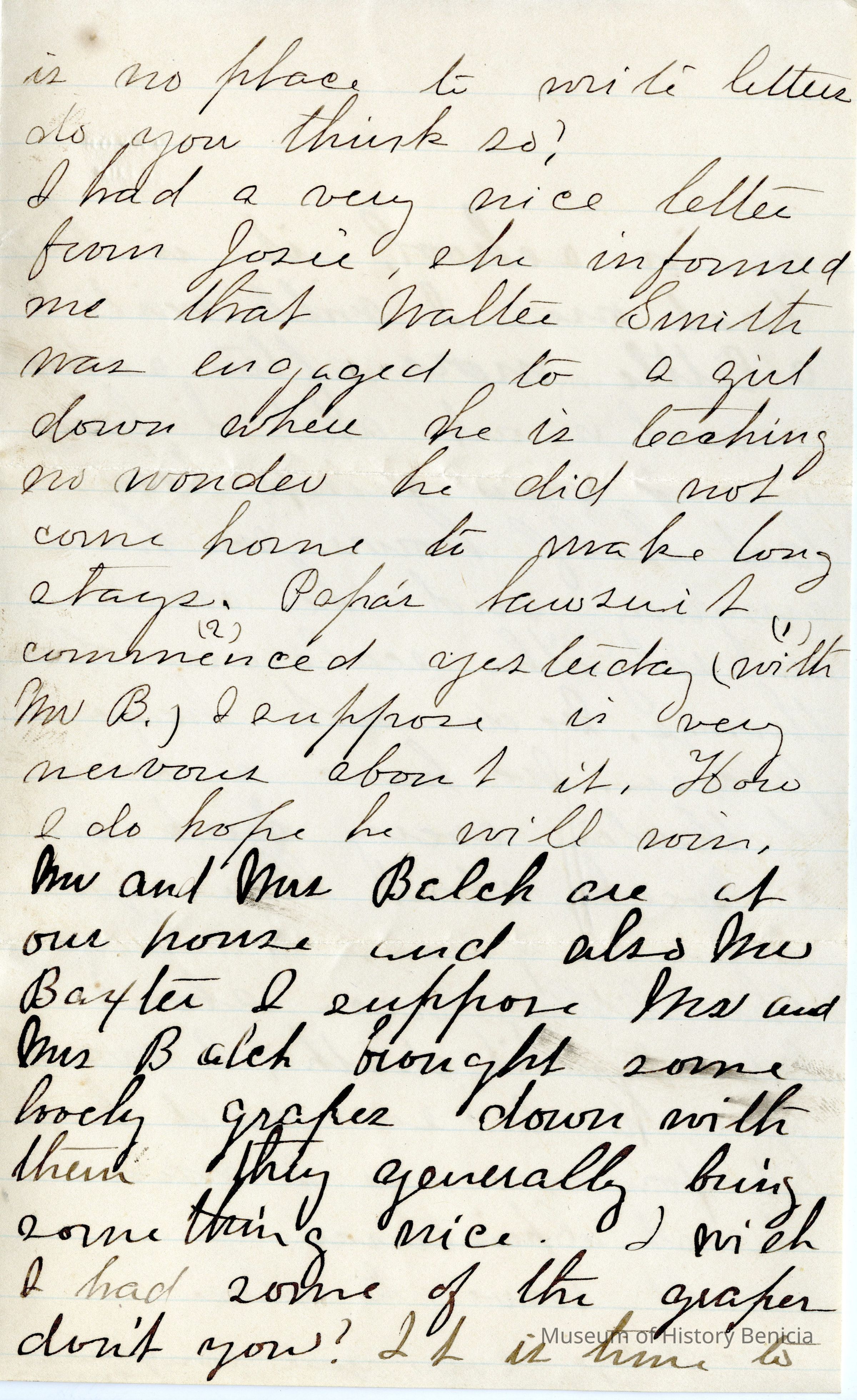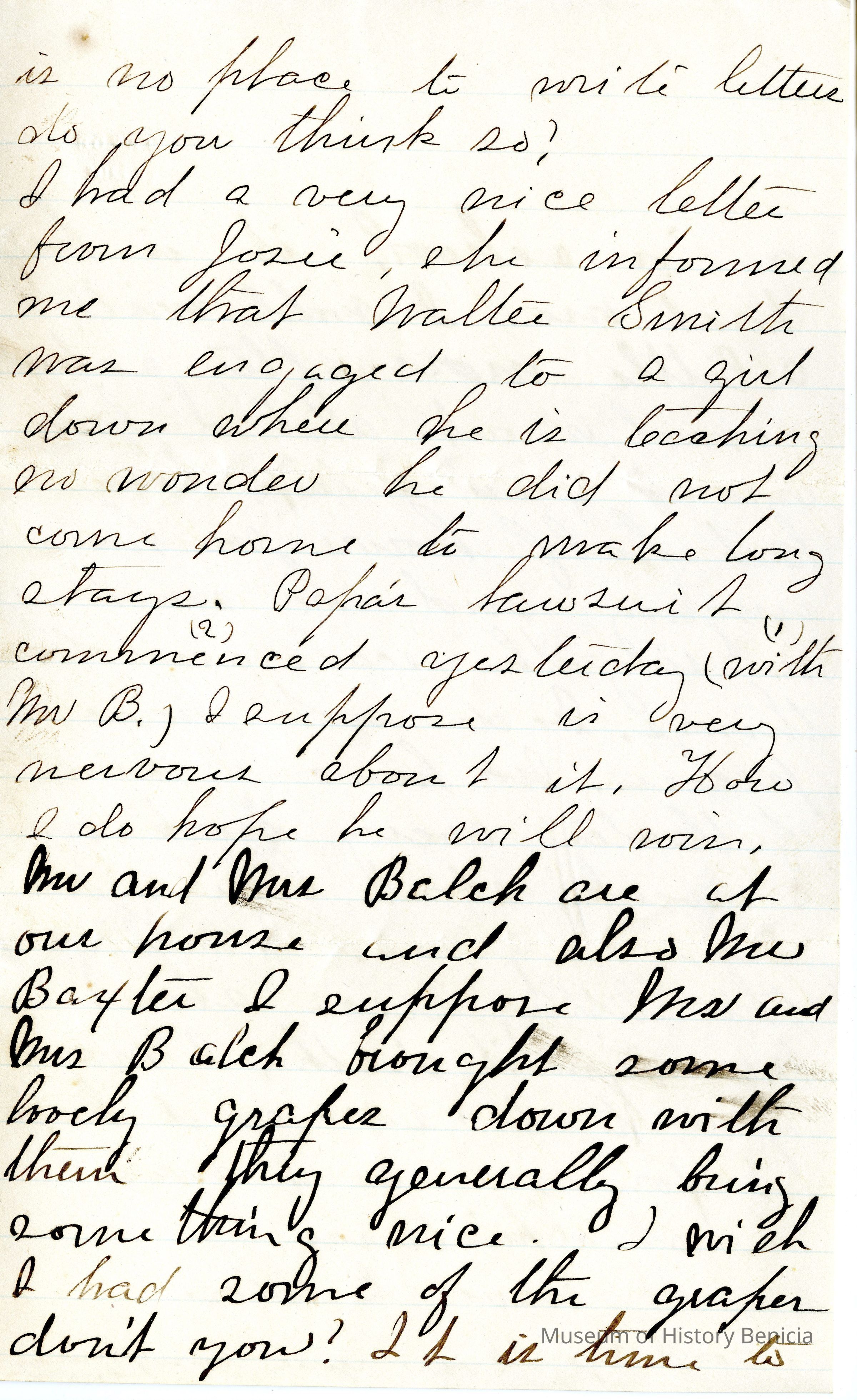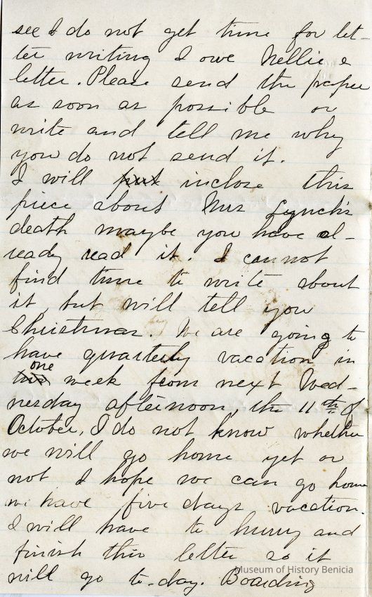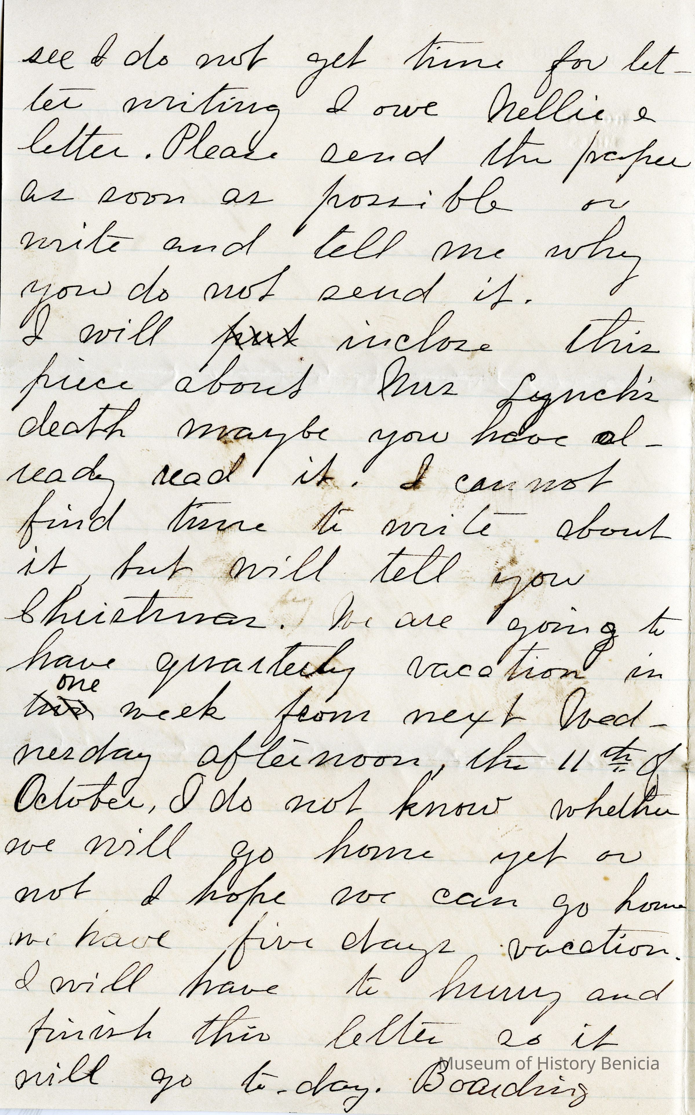 This is a letter from Emma at the Young Ladies Seminary in Benicia to her cousin at the California Military Academy in Oakland. The letter is on YLS stationary. She is very interested in getting back a paper of hers that he has. Besides this, she talks about her family, going home at their next vacation, activities at her school, her father's law suit, etc. One important thing that she mentions is the death of the school's head, Mrs. M. Atkins Lynch, and she encloses her obituary. Her cousin is Mr. William H. Sharp of The Dalles Oregon.