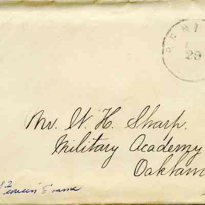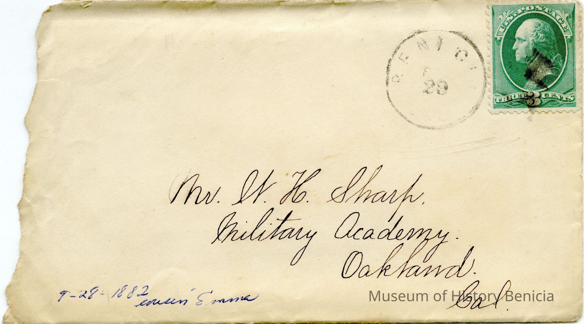 I Believe this to be a letter from Emma Rhoda Sharp Wood (1867 - 1943) from Castoria, San Joaquin, CA. in the 1880 census. Her parents are Peter George Sharp and Elizabeth A. Wood from Ohio. She is writing to her cousin William Henry Sharp (1863 - 1943) who was at school at the California Military Academy in Oakland but living in The Dalles, Oregon at the time. His father was Phillip Thomas Sharp. Peter and Phillip plus another brother came to California in 04/1849 as part of a mining company for the Gold Rush. Emma's older sister Sophia Wood Sharp (1865 - 1903) was also a student at the YLS.Collection