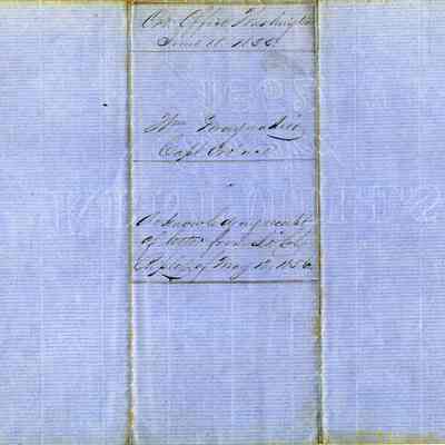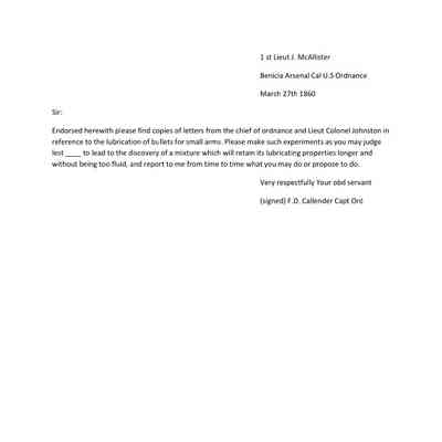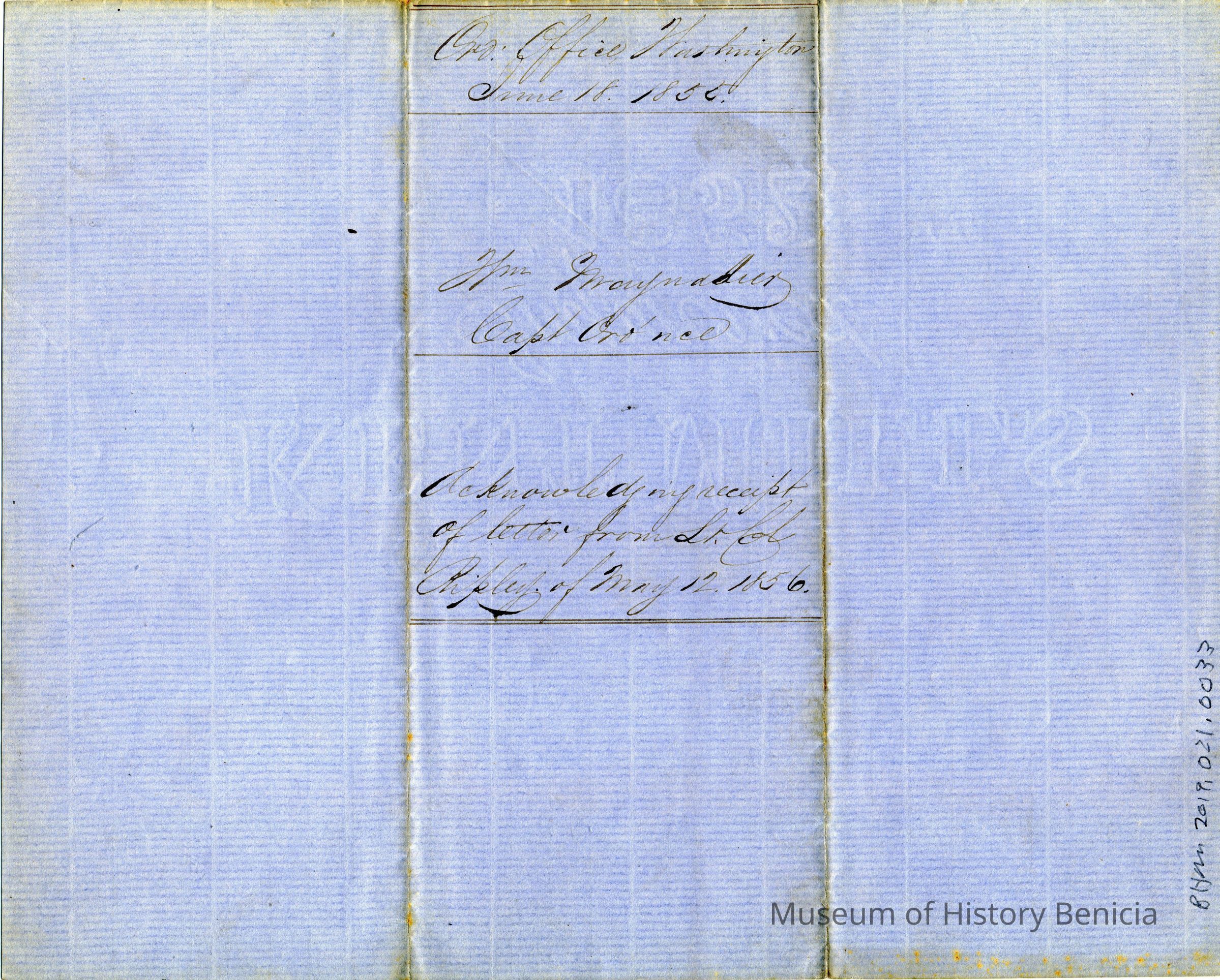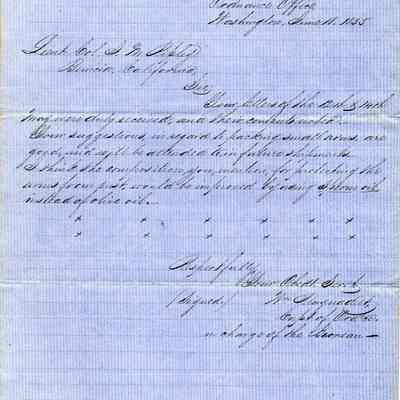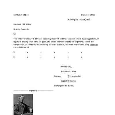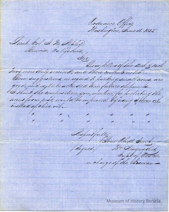 This is a letter from William Maynadier, Captain of Ordnance in Washington D.C. to Lt. Colonel J.M. Ripley in Benicia. Ripley is being recognized for his suggestion to ship small arms in oil to prevent rusting. The only change is that Maynadier suggests using Sperm oil instead.Collection