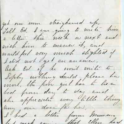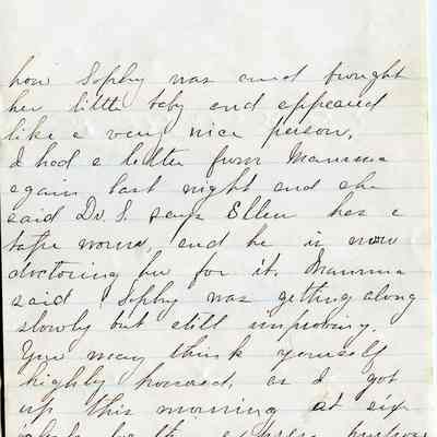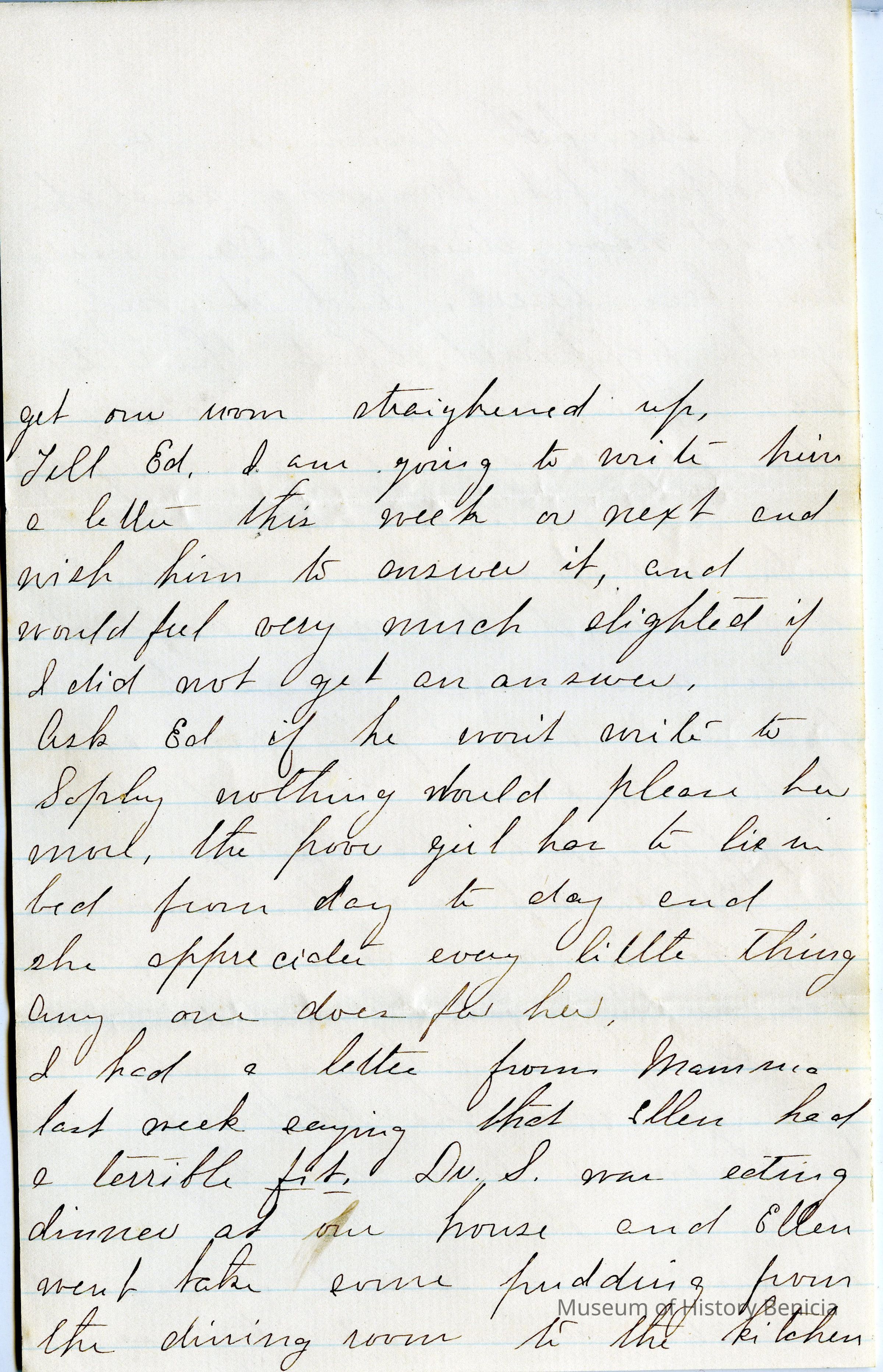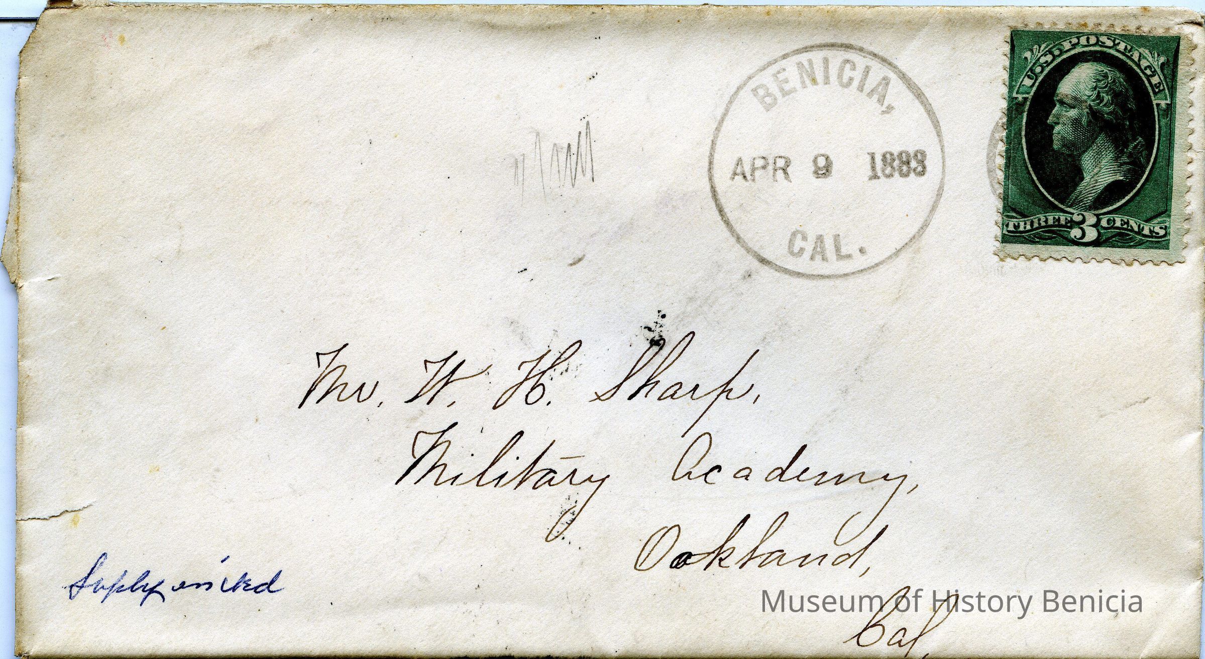 I Believe this to be a letter from Emma Rhoda Sharp Wood (1867 - 1943) from Castoria, San Joaquin, CA. in the 1880 census. Her parents are Peter George Sharp and Elizabeth A. Wood from Ohio. She is writing to her cousin William Henry Sharp (1863 - 1943) who was at school at the California Military Academy in Oakland but living in The Dalles, Oregon at the time. His father was Phillip Thomas Sharp. Peter and Phillip plus another brother came to California in 04/1849 as part of a mining company for the Gold Rush. Emma's older sister Sophia Wood Sharp (1865 - 1903) was also a student at the YLS. Note that she died in 1903 and is buried at the Stockton Rural Cemetery. Can't find her death certificate so not sure what the cause of death was.Collection