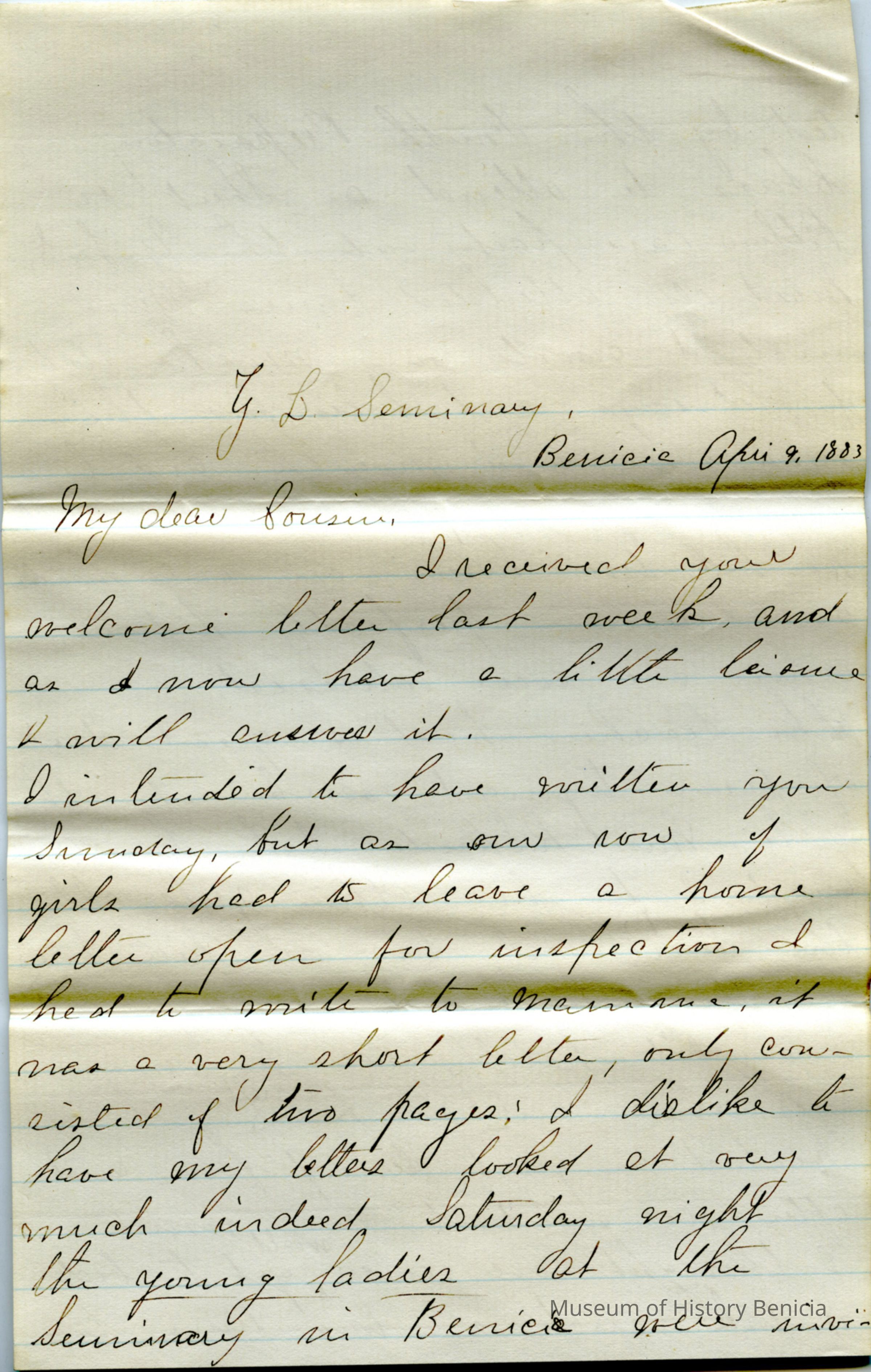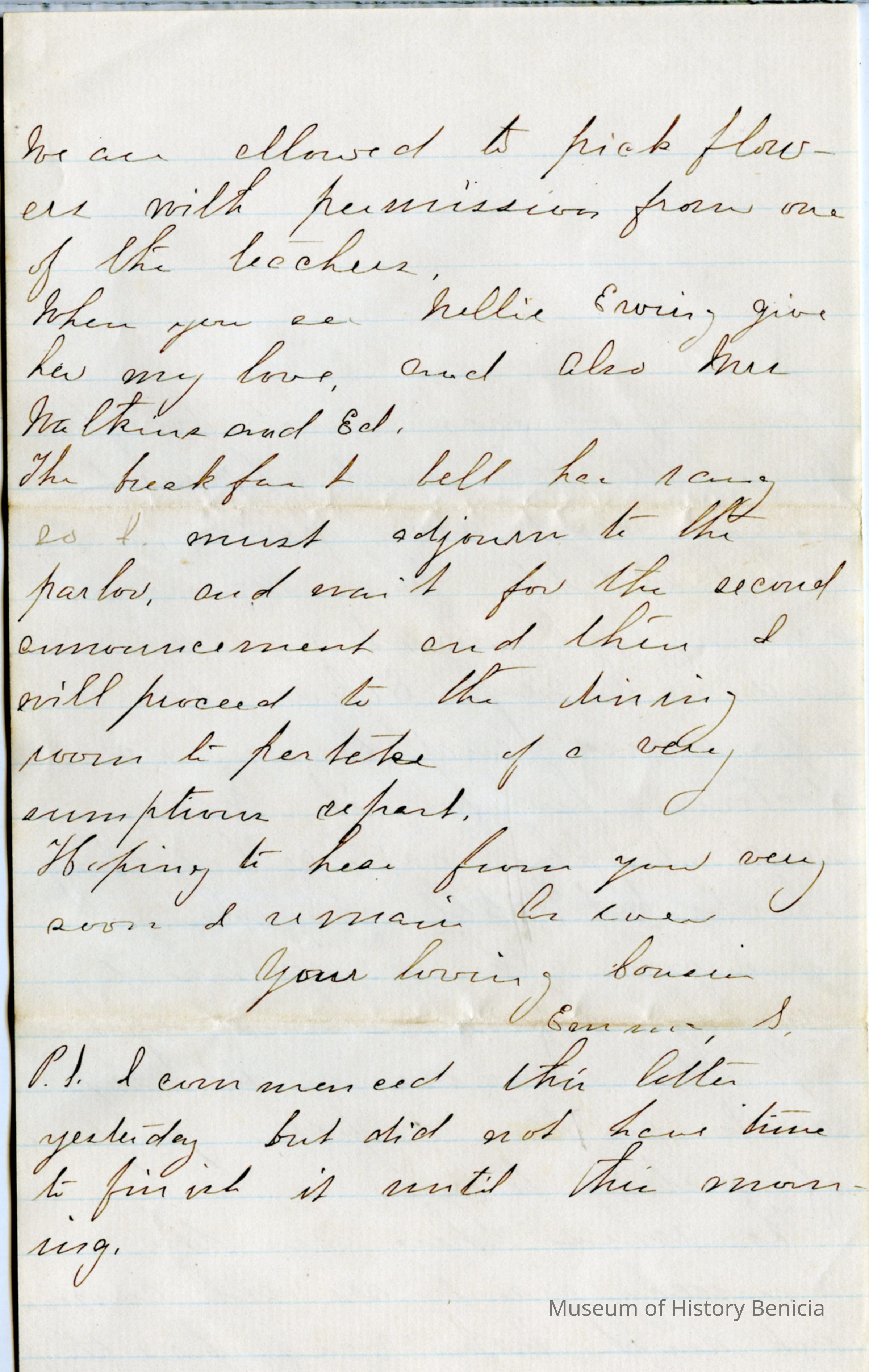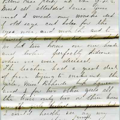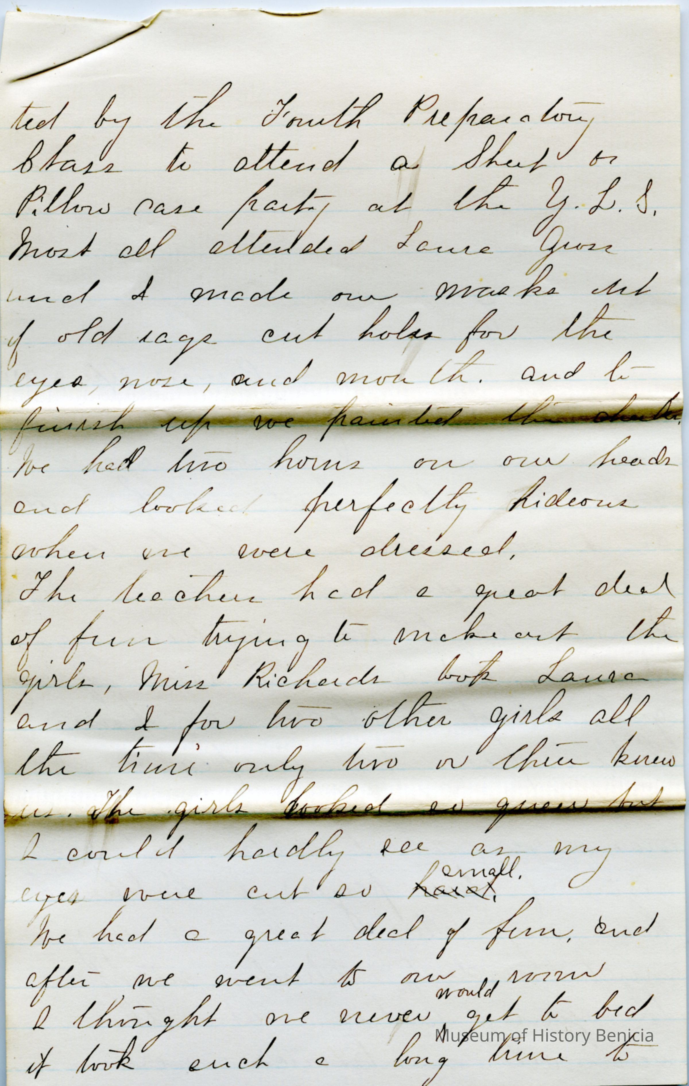 This is a letter from Emma at the Young Ladies Seminary in Benicia to her cousin at the California Military Academy in Oakland. Her cousin is Mr. William H. Sharp of The Dalles Oregon. Emma mentions how letters they write have to be left open for inspection and how much she hates that. She talks of the girls from the fourth prepatory class inviting them to a "sheet or pillow case party. She and Laura Gross used rags as masks with eye, nose and mouth holes cut in them. They painted their faces and wore horns on their head. The teachers tried to identify the girls but Miss Richards mistook her and Laura for two other girls.