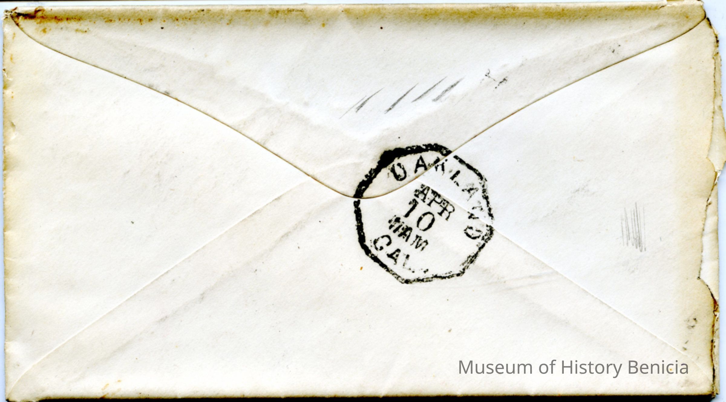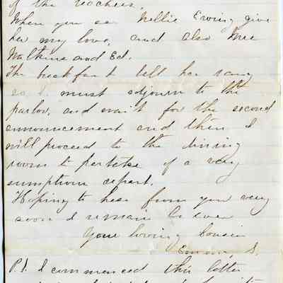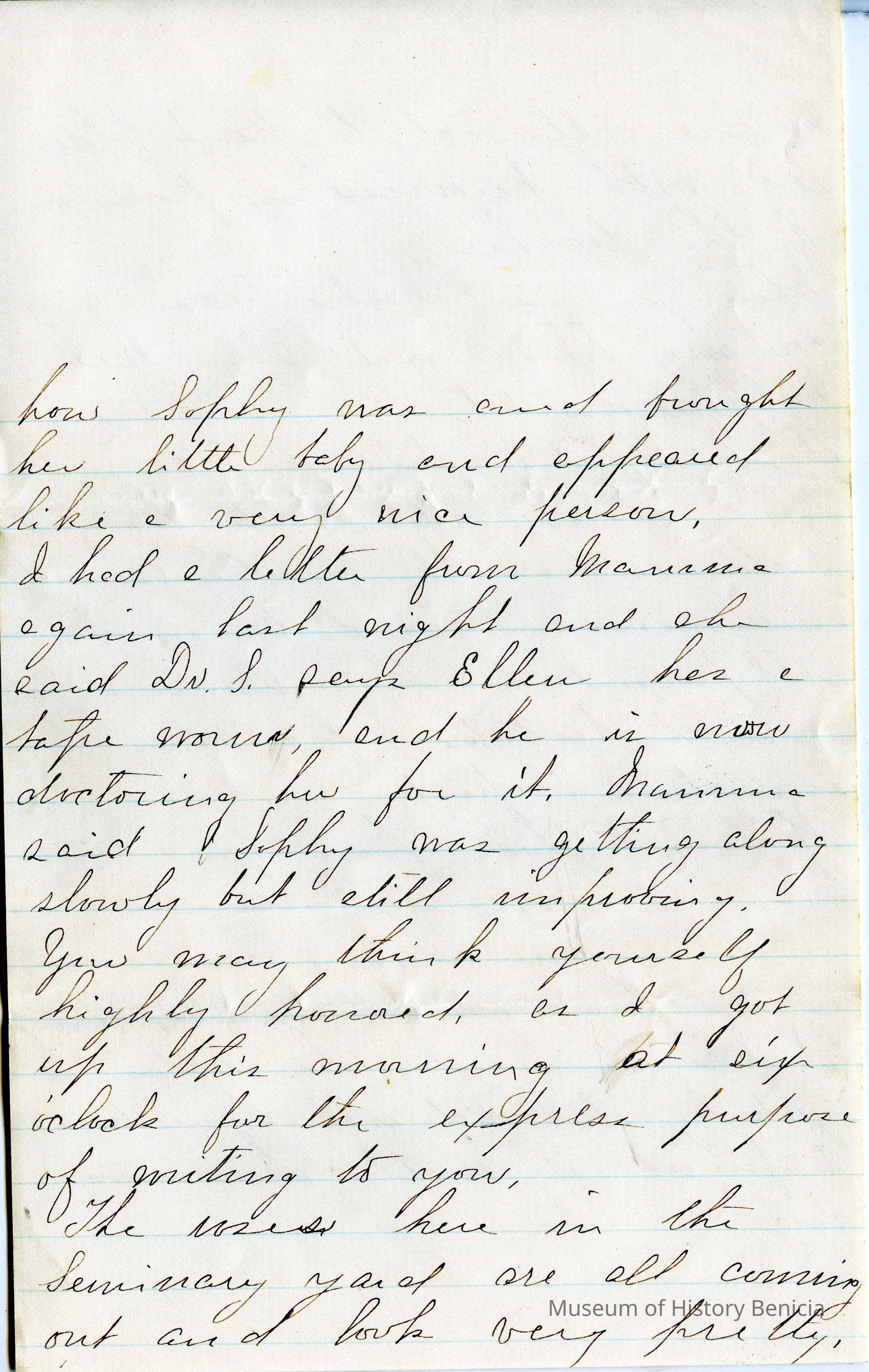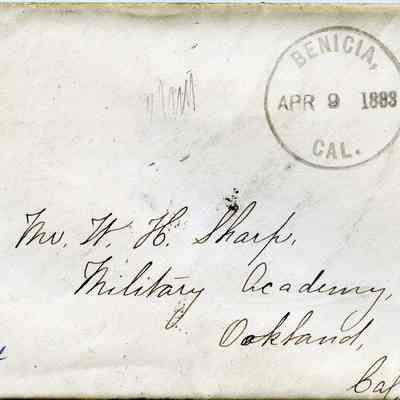 This is a letter from Emma at the Young Ladies Seminary in Benicia to her cousin at the California Military Academy in Oakland. Her cousin is Mr. William H. Sharp of The Dalles Oregon. Emma mentions how letters they write have to be left open for inspection and how much she hates that. She talks of the girls from the fourth prepatory class inviting them to a "sheet or pillow case party. She and Laura Gross used rags as masks with eye, nose and mouth holes cut in them. They painted their faces and wore horns on their head. The teachers tried to identify the girls but Miss Richards mistook her and Laura for two other girls.
