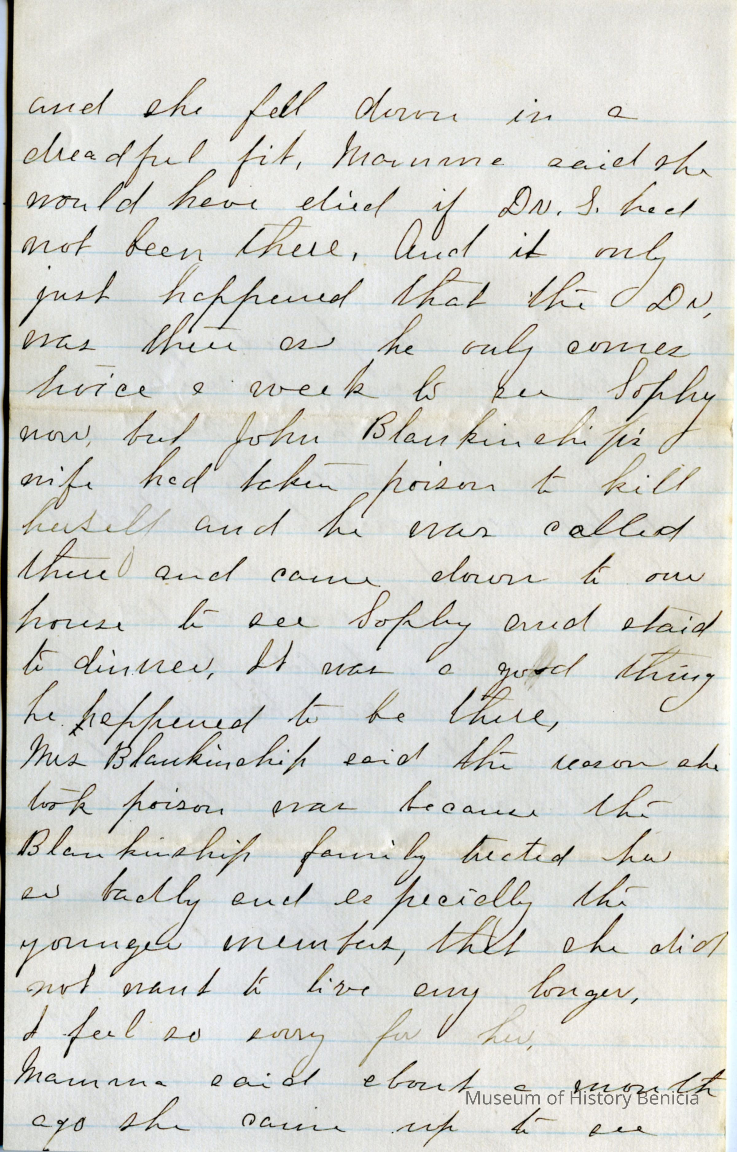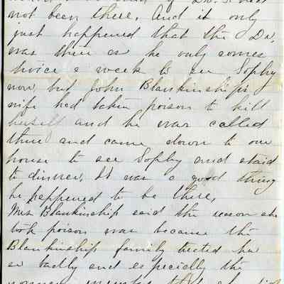 Emma tells of her Mother saying that Ellen had a fit and luckily Dr. S was having dinner at their house when it happened. The doctor was there because he had been called to the John Blakenship house because John's wife had taken poison to kill herself. Mrs. Blakenship said she tried to kill herself because the Blakenship family treated her so badly. The cause of Ellen's "fit" was a tape worm.