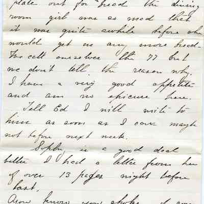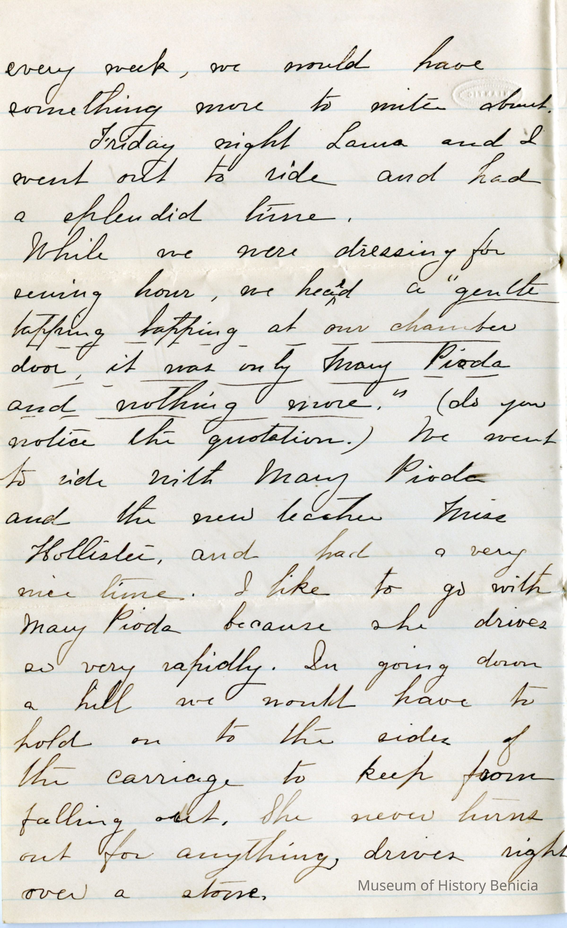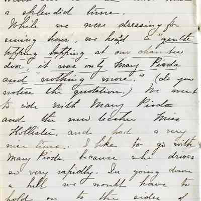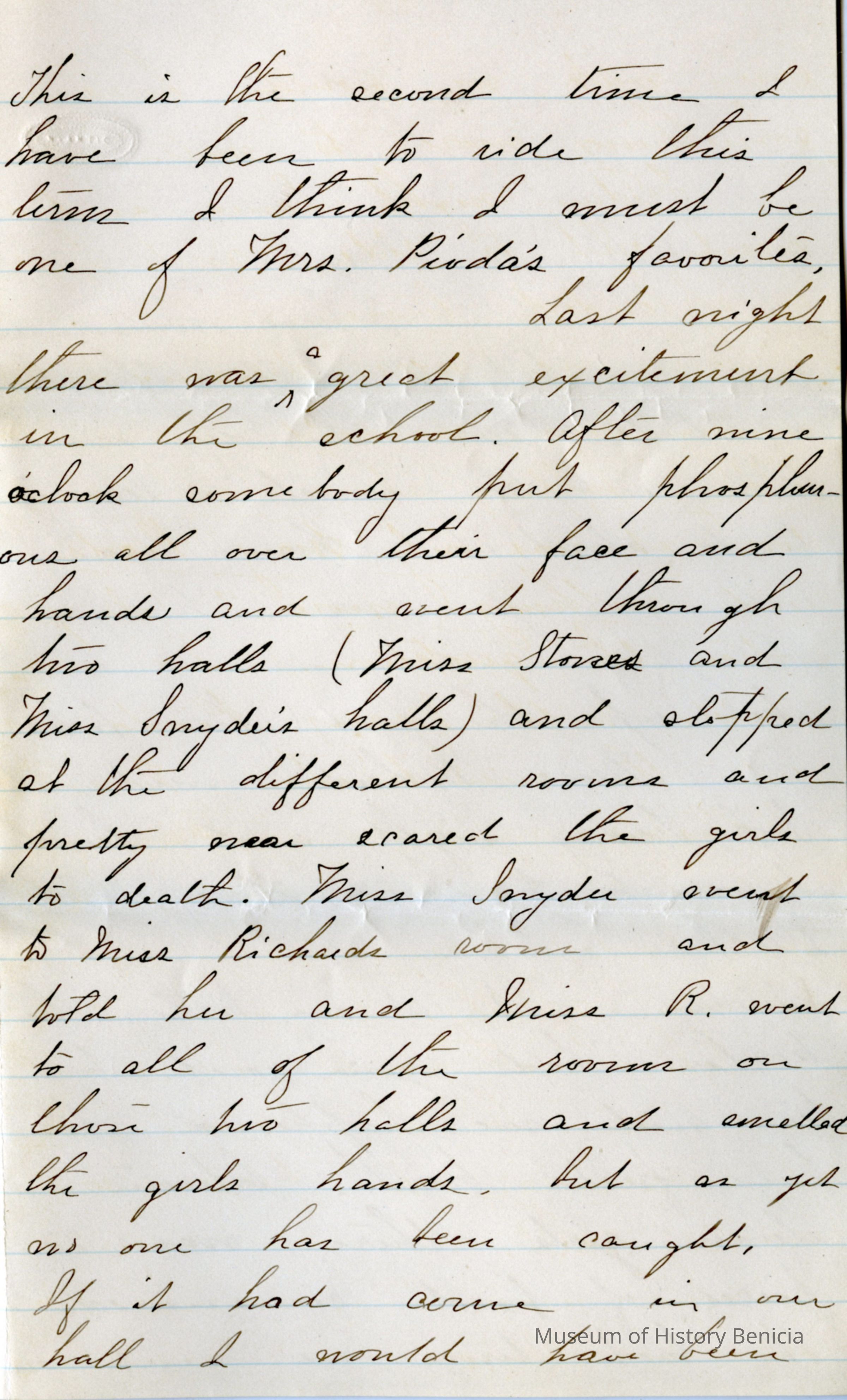 Emma thanks her cousin for the long letter about the "Conclave". (Not sure what this refers to but it must have taken place just before 09/12/1883.) Emma complains about girls not being allowed to go downtown every week. She talks of taking a ride with Mary Pioda and the "new" teacher Miss Hollister. She describes the ride as being very "rapid" and Mary driving so as she needed to hang on to the carriage. She then describes how someone put phosphorus over their face and went through two halls at night (Miss Stones and Miss Snyder's). They tried to find the culprite by smelling each girls hands.