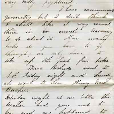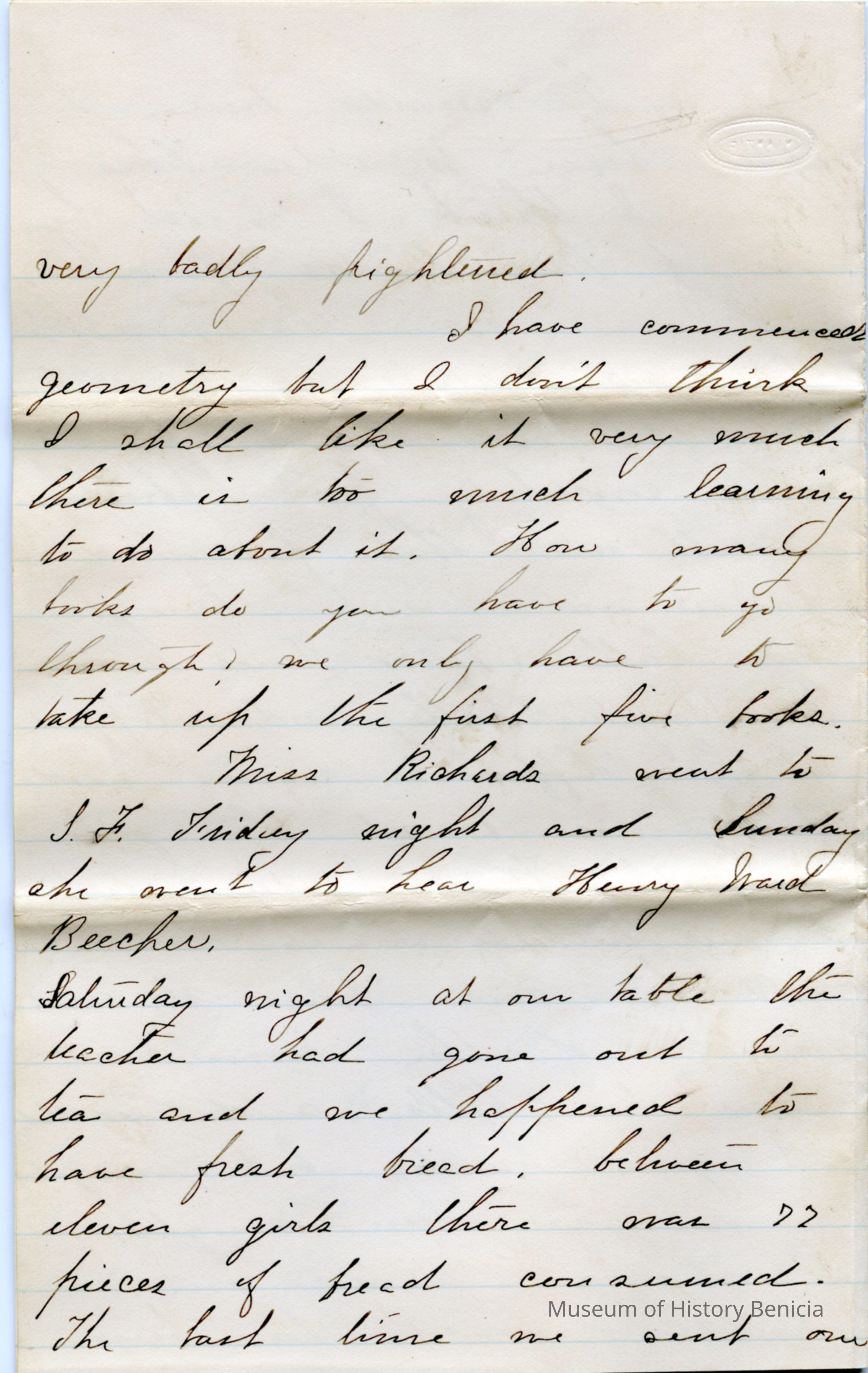 She mentions that one teacher, Miss Richards, went to San Francisco Friday night to hear Henry Ward Beecher.