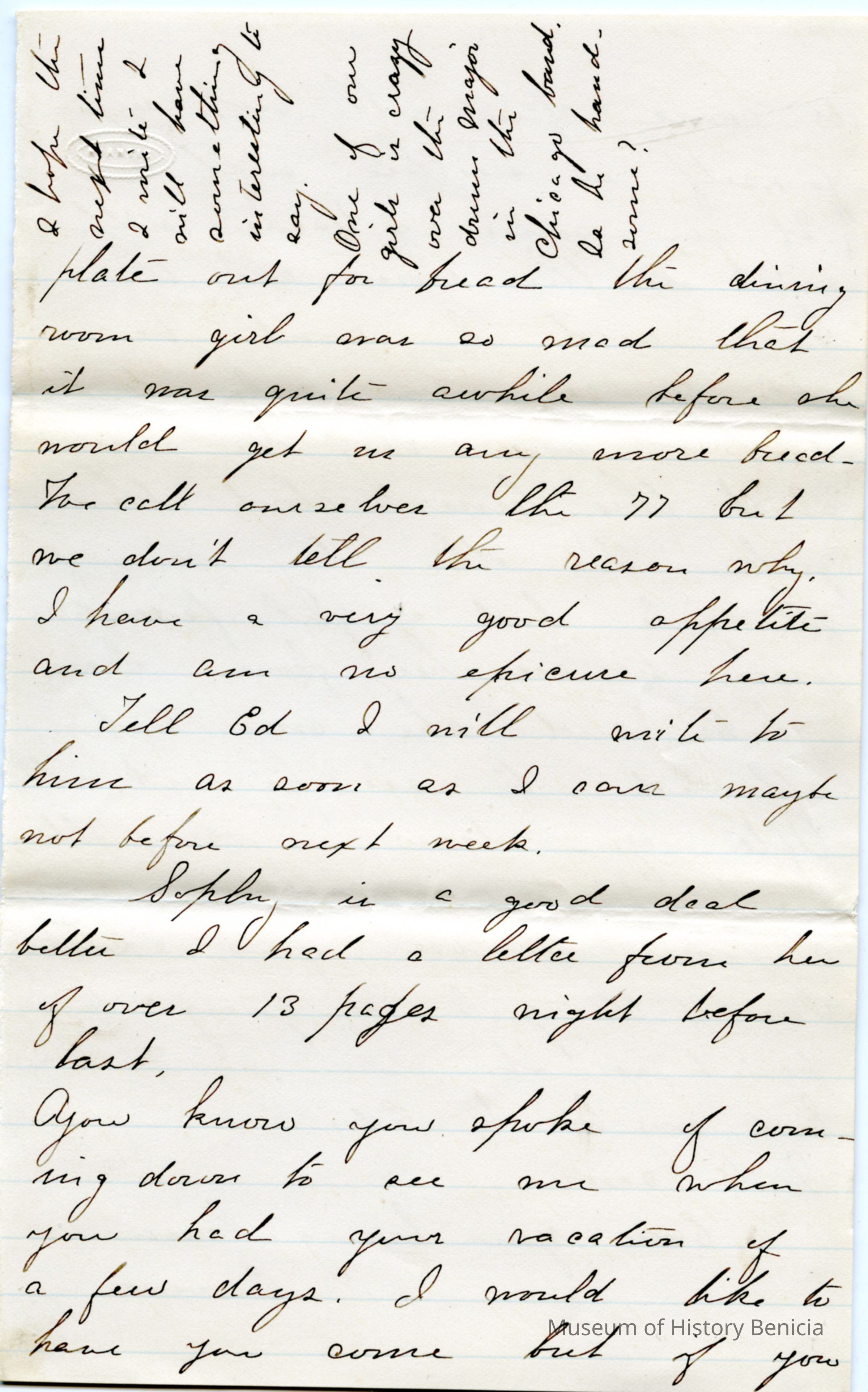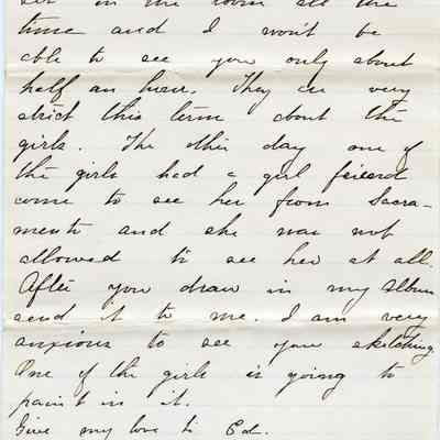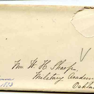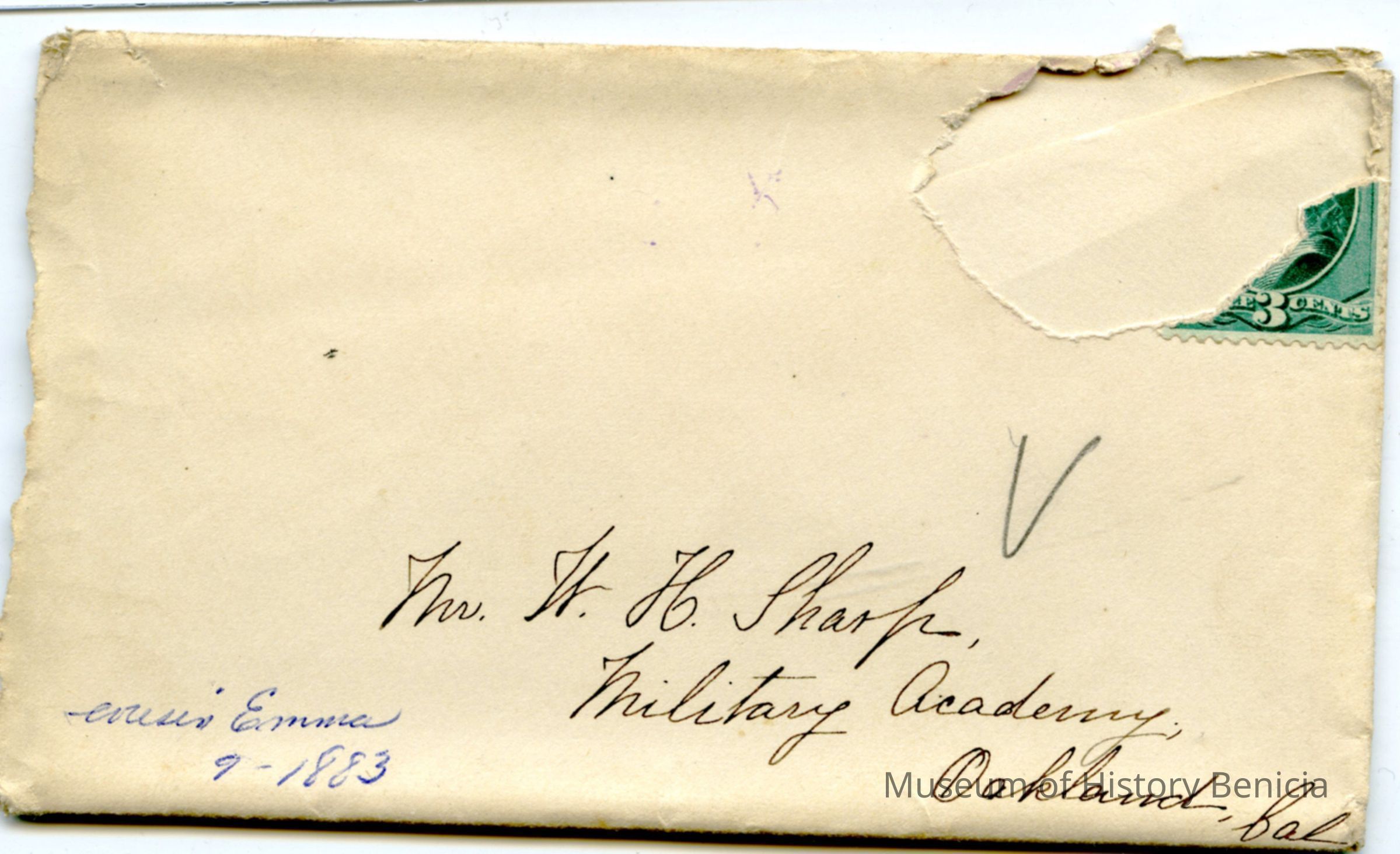 I Believe this to be a letter from Emma Rhoda Sharp Wood (1867 - 1943) from Castoria, San Joaquin, CA. in the 1880 census. Her parents are Peter George Sharp and Elizabeth A. Wood from Ohio. She is writing to her cousin William Henry Sharp (1863 - 1943) who was at school at the California Military Academy in Oakland but living in The Dalles, Oregon at the time. His father was Phillip Thomas Sharp. Peter and Phillip plus another brother came to California in 04/1849 as part of a mining company for the Gold Rush. Emma's older sister Sophia Wood Sharp (1865 - 1903) was also a student at the YLS. Note that she died in 1903 and is buried at the Stockton Rural Cemetery. Can't find her death certificate so not sure what the cause of death was.Collection