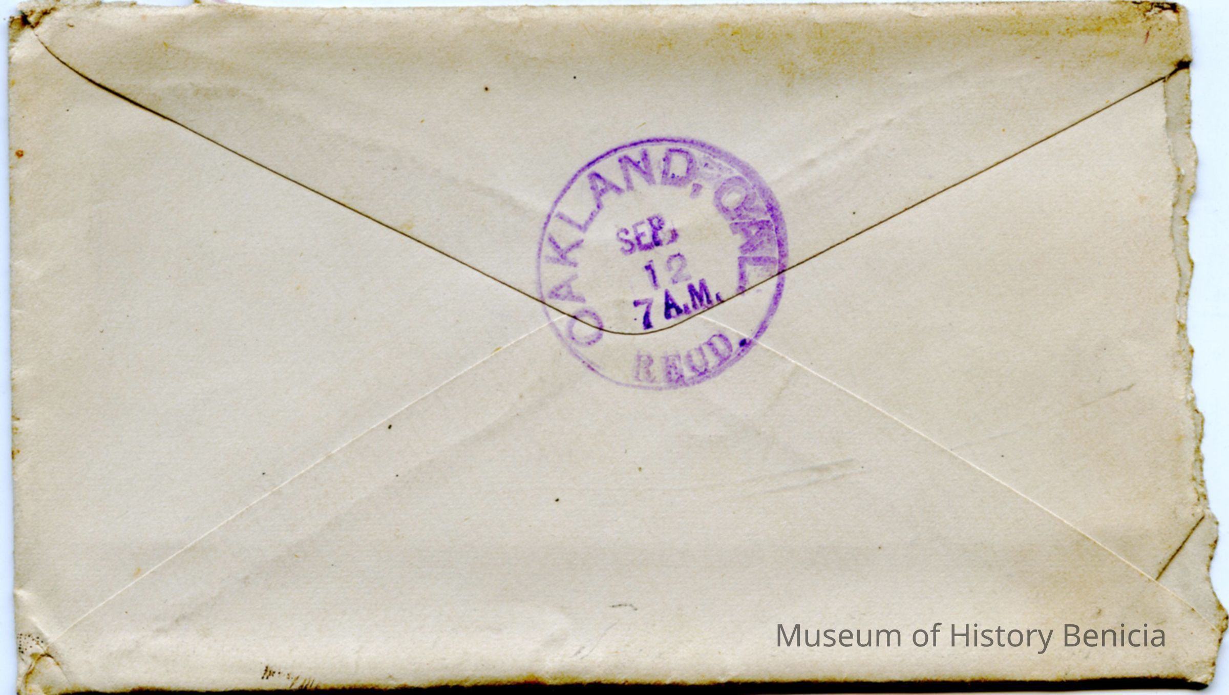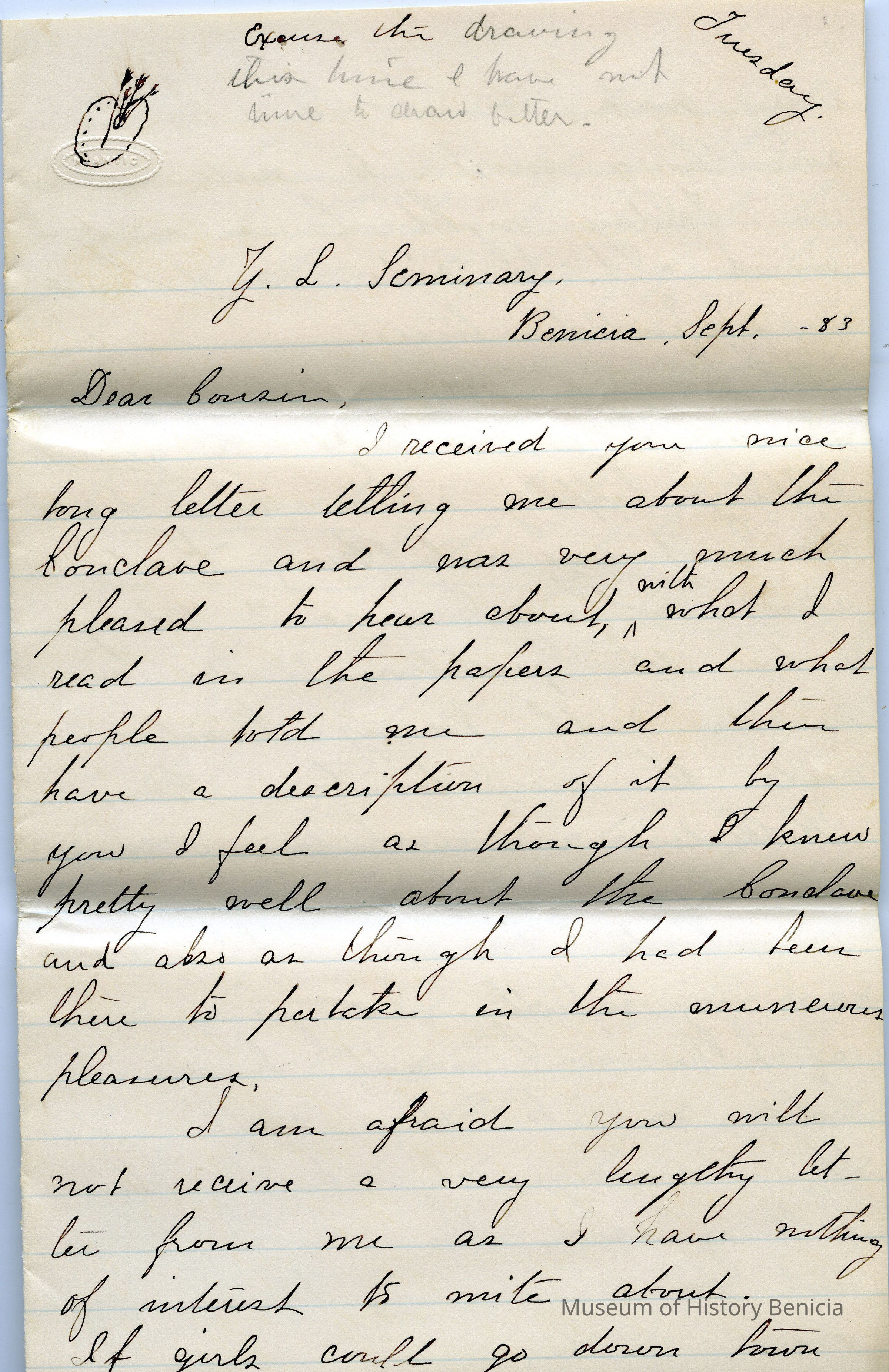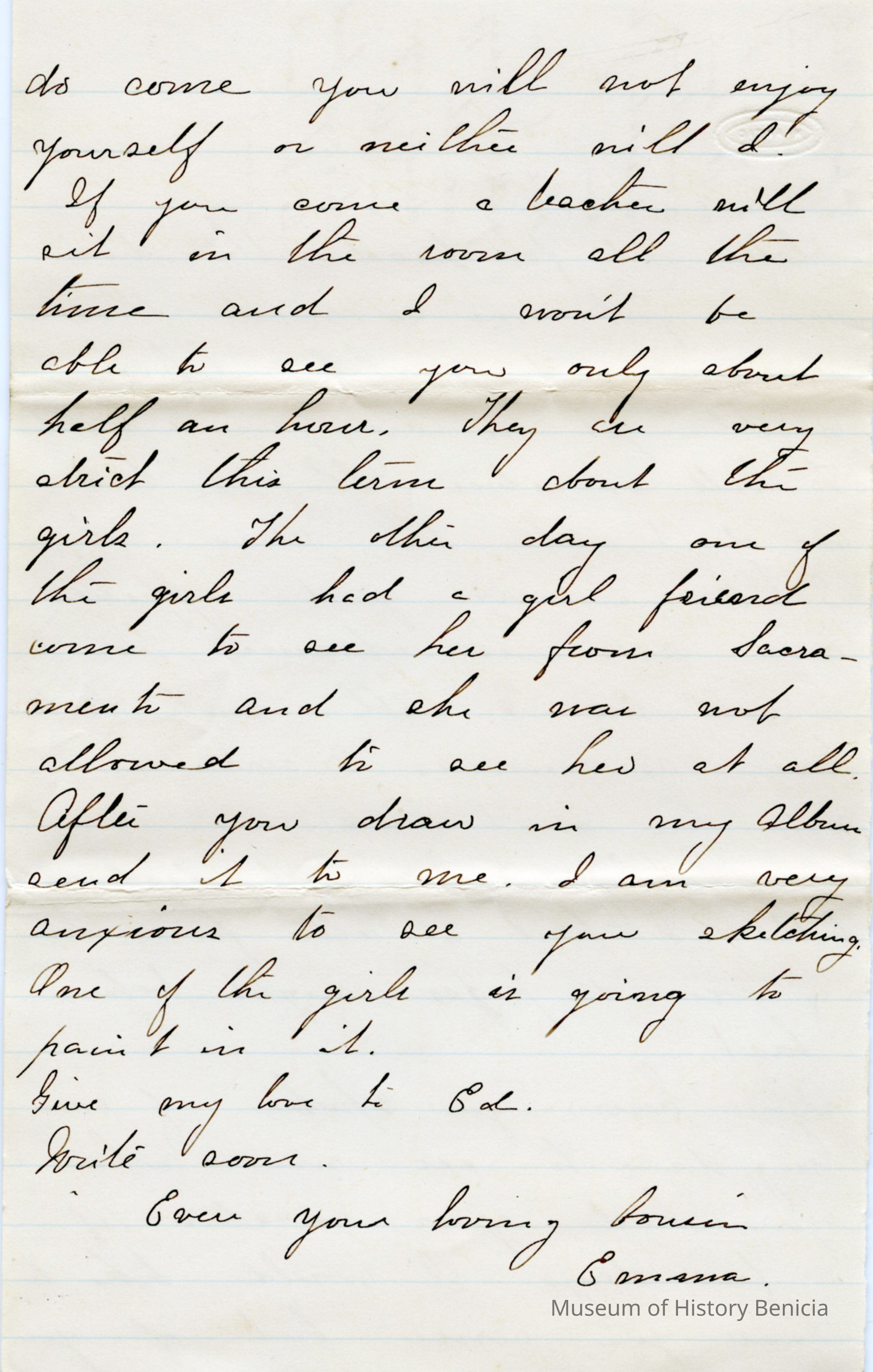 This is a letter from Emma at the Young Ladies Seminary in Benicia to her cousin at the California Military Academy in Oakland. Her cousin is Mr. William H. Sharp of The Dalles Oregon.