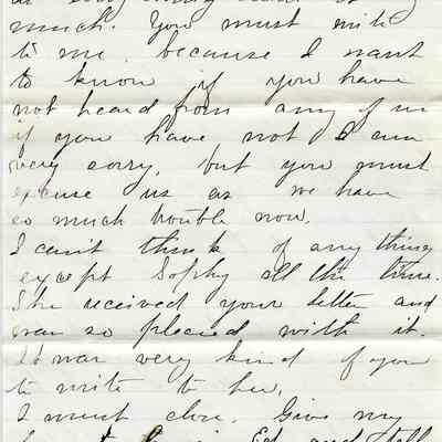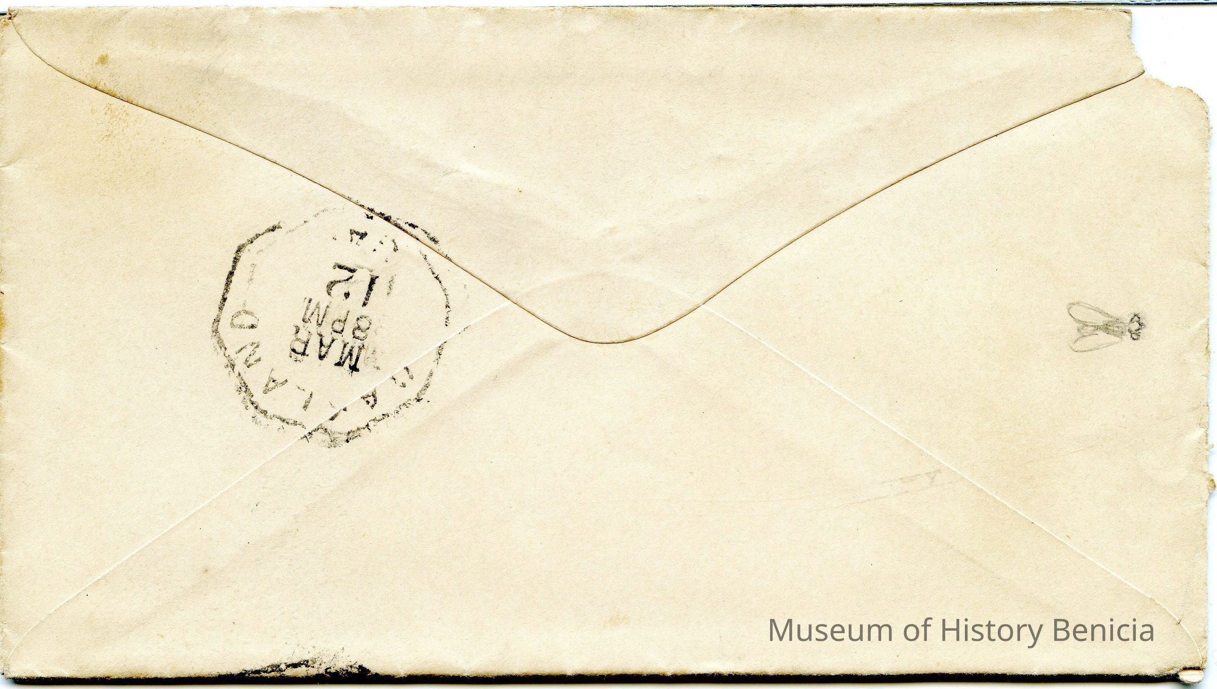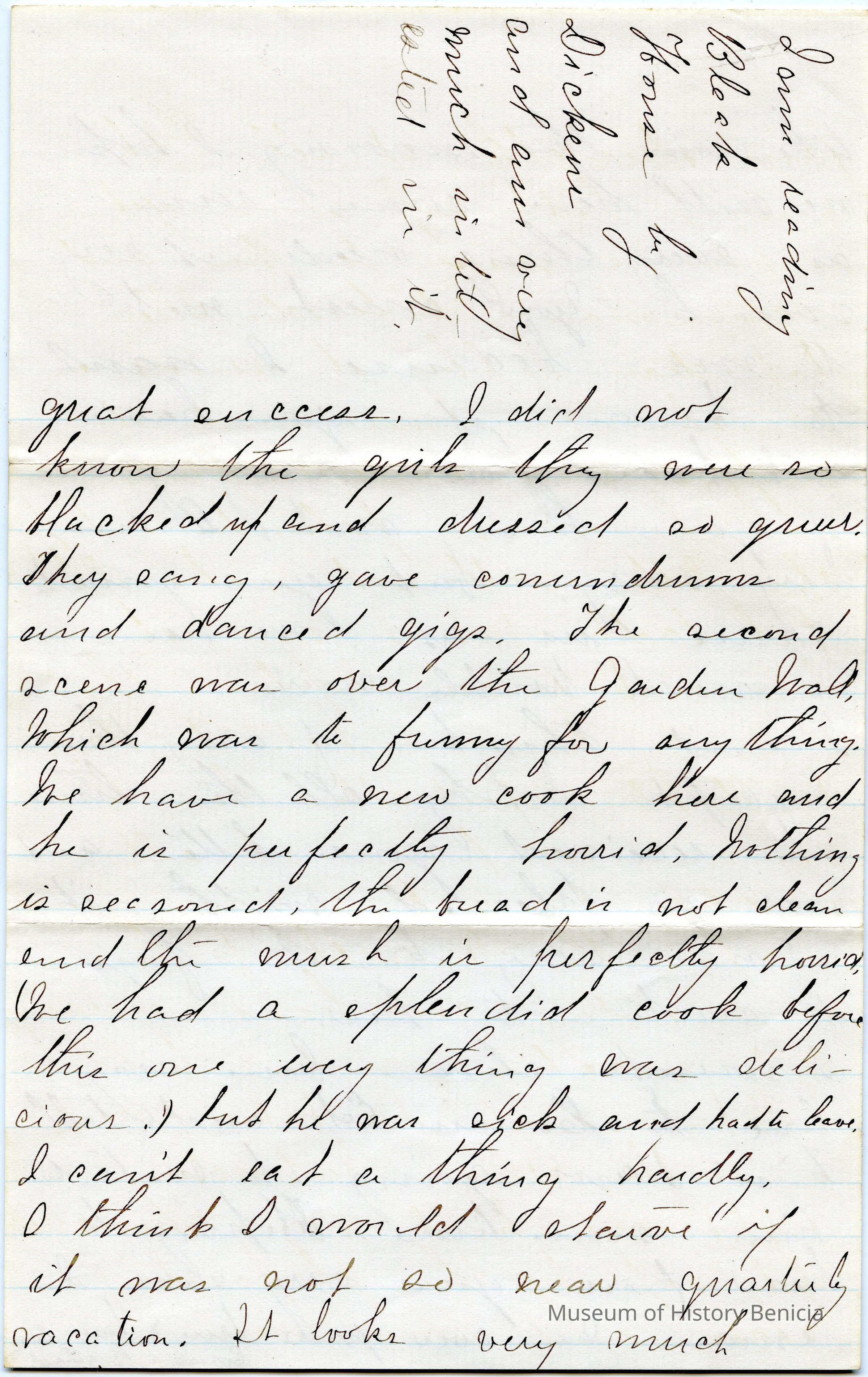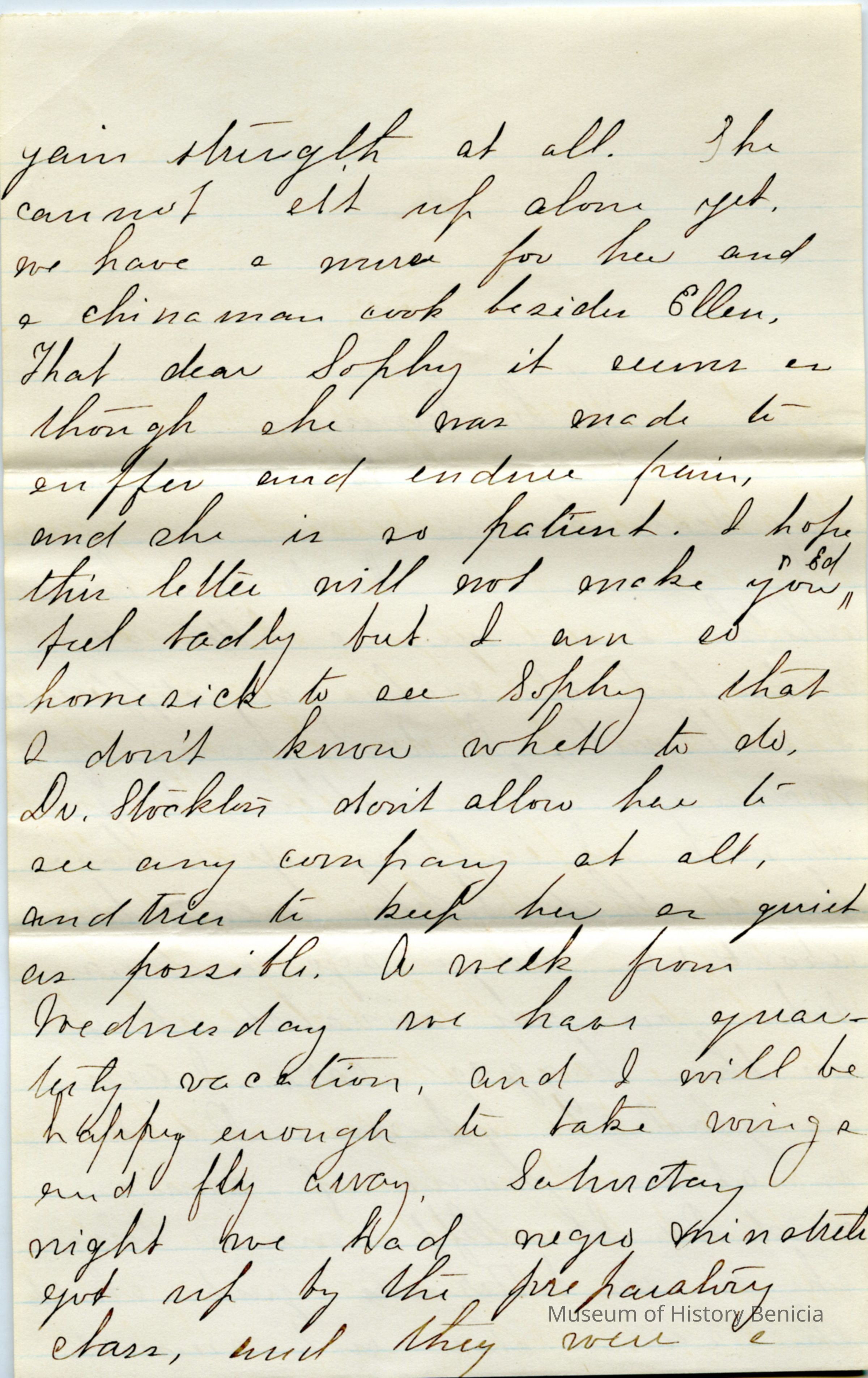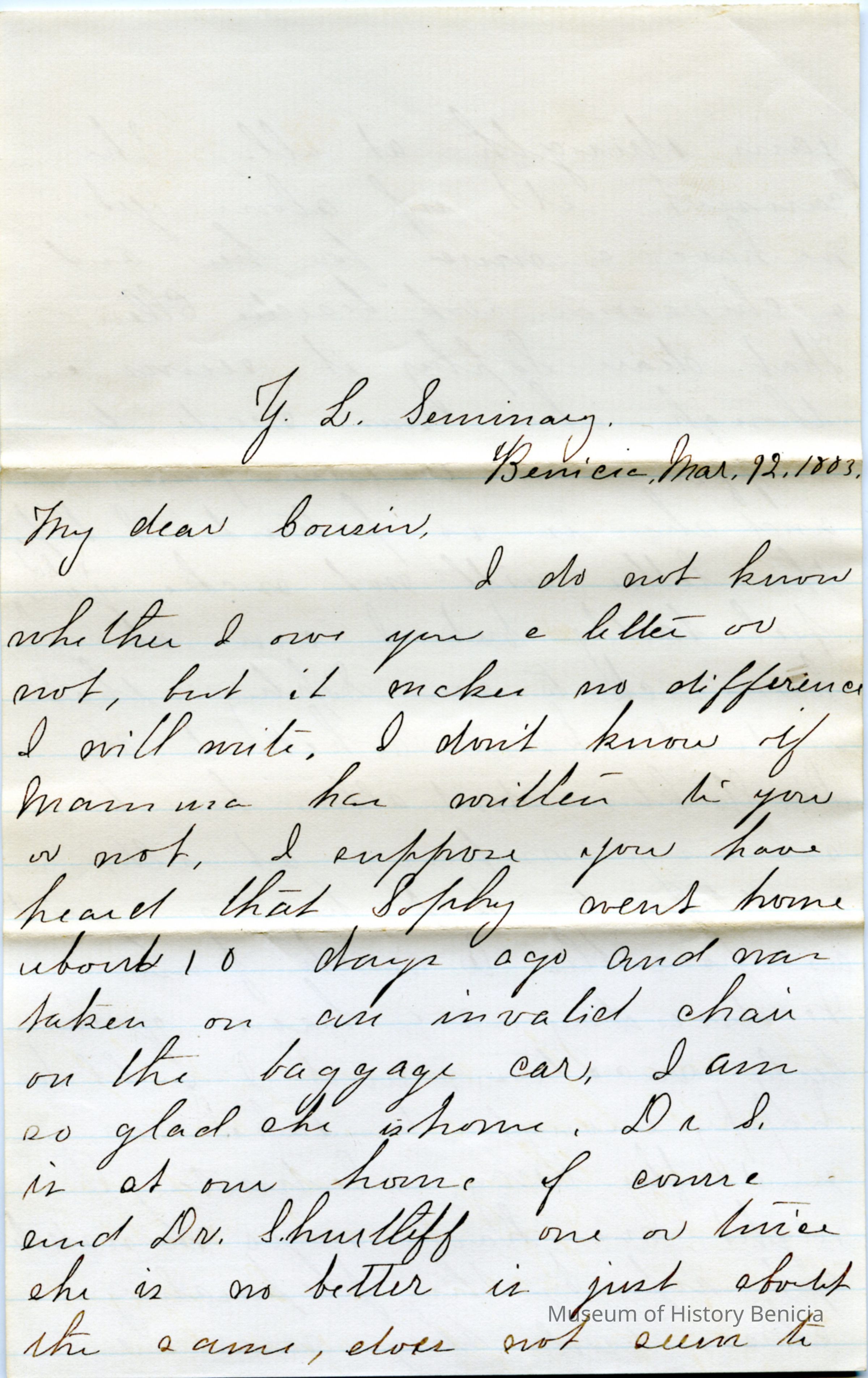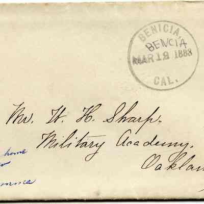 This is a letter from Emma at the Young Ladies Seminary in Benicia to her cousin at the California Military Academy in Oakland. Her cousin is Mr. William H. Sharp of The Dalles Oregon. Emma mentions her sister Sophy also being at school with her. In the letter she tells her cousin that Sophy went home in the "invalid chair" on the baggage car of the train. The letter says Sophy has a nurse and a "Chinaman" cook and is resting in bed. The letter also describes a "Negro minstrel" at the school. It seems the show was put on by one of the classes dressed in blackface. She closes with love to cousin Ed who must be at the military academy with William.