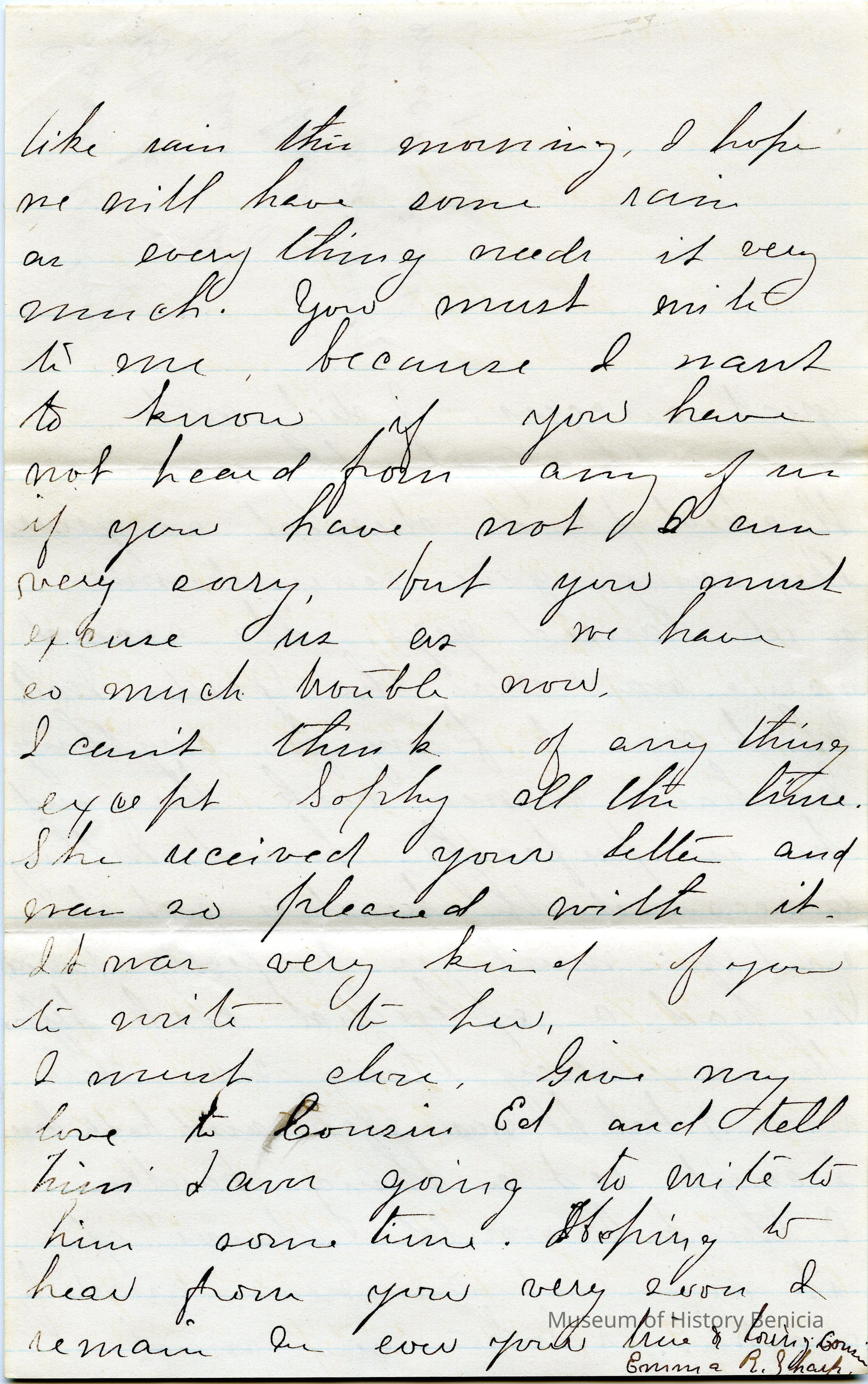 I Believe this to be a letter from Emma Rhoda Sharp Wood (1867 - 1943) from Castoria, San Joaquin, CA. in the 1880 census. Her parents are Peter George Sharp and Elizabeth A. Wood from Ohio. She is writing to her cousin William Henry Sharp (1863 - 1943) who was at school at the California Military Academy in Oakland but living in The Dalles, Oregon at the time. His father was Phillip Thomas Sharp. Peter and Phillip plus another brother came to California in 04/1849 as part of a mining company for the Gold Rush. Emma's older sister Sophia Wood Sharp (1865 - 1903) was also a student at the YLS. Note that she died in 1903 and is buried at the Stockton Rural Cemetery. Can't find her death certificate so not sure what the cause of death was.Collection