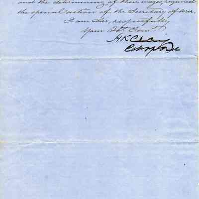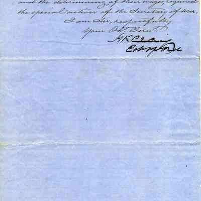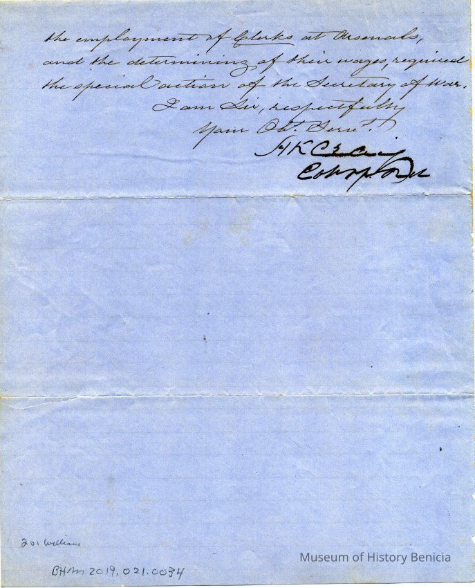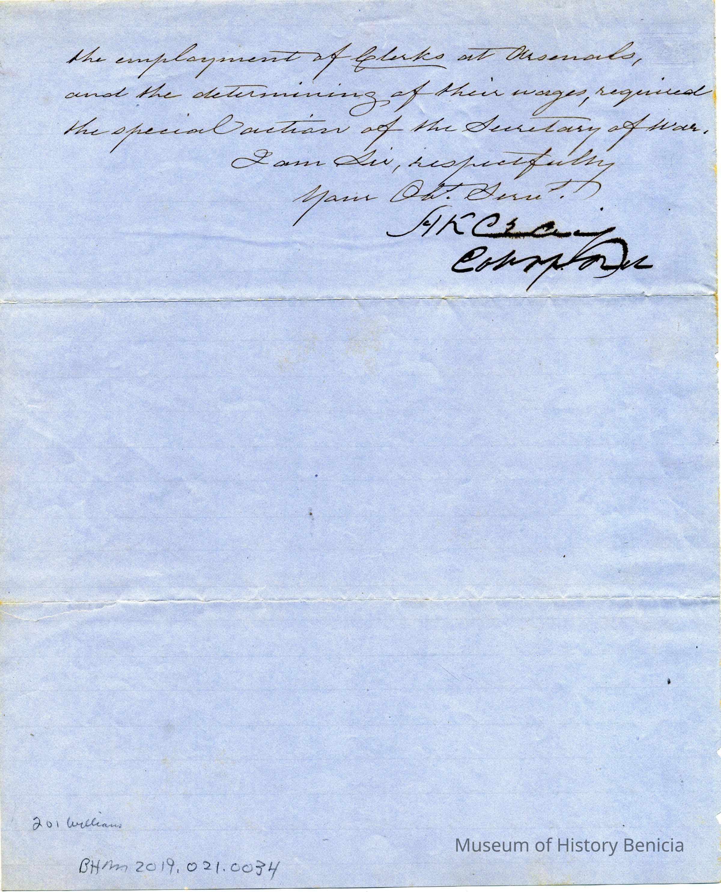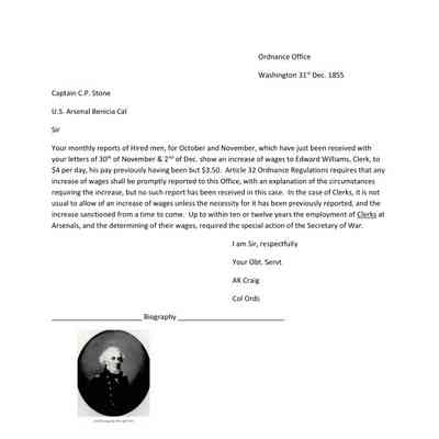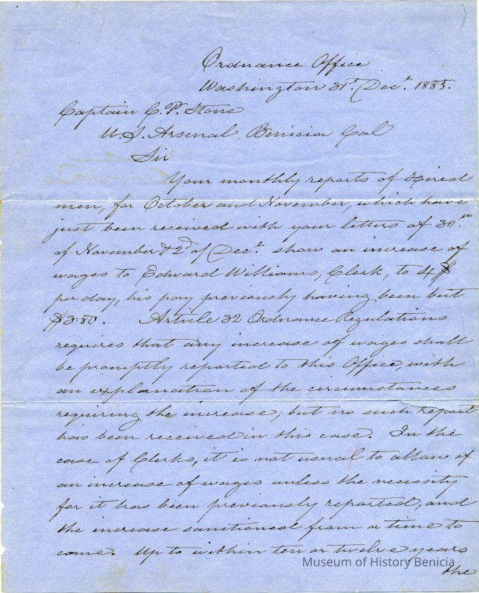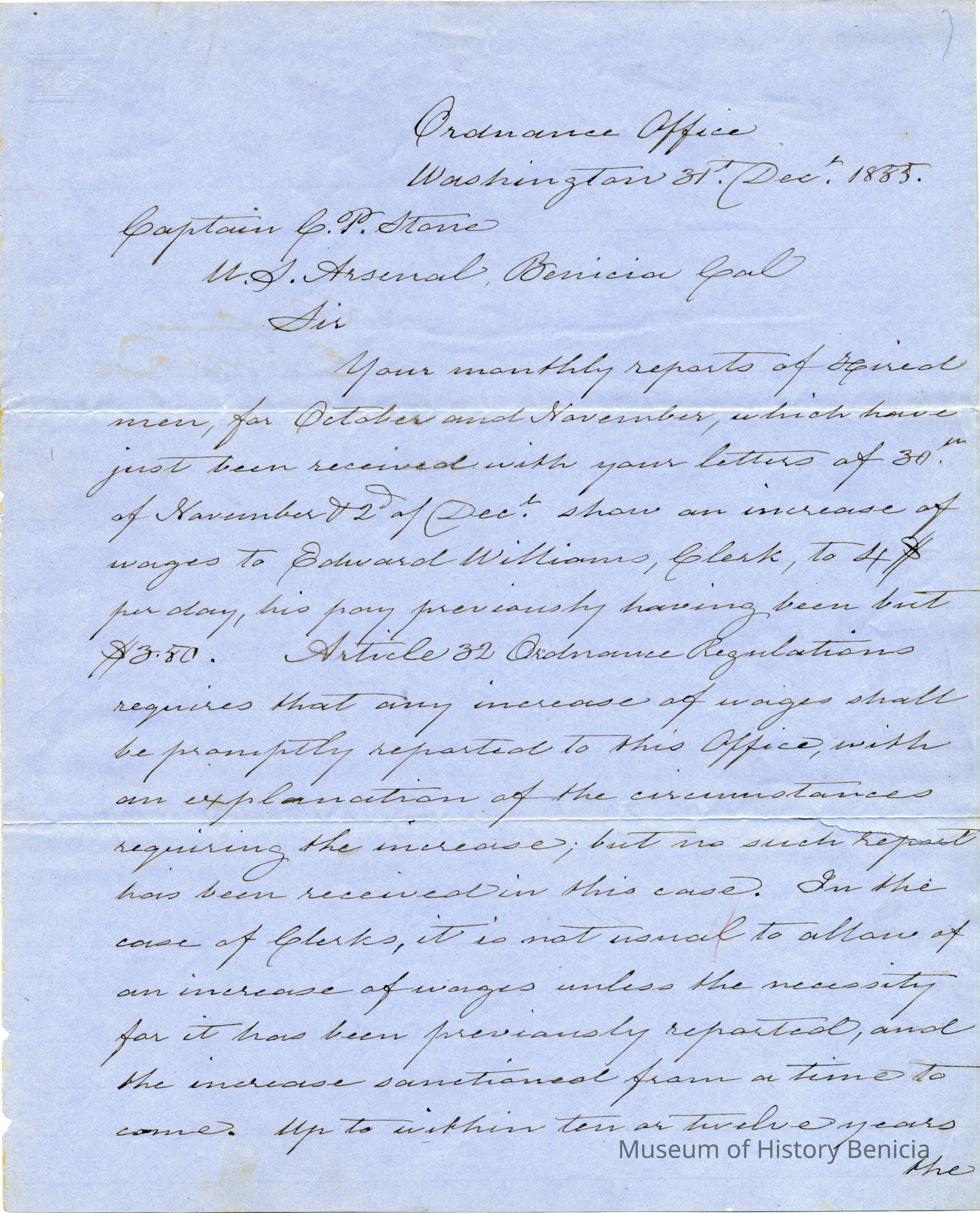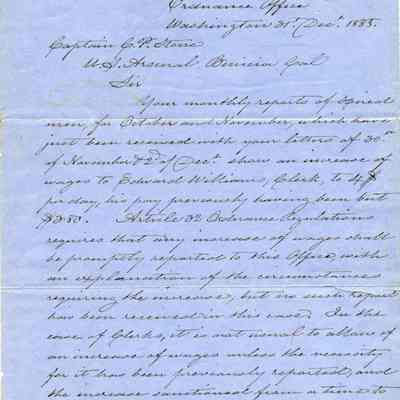 This letter from A,K, Craig in Washington D.C. questions the increased salary for a clerk in Benicia, Edward Williams, from $3.50 to $4.00 per day. The letter says that prior to 10 or 12 years ago the hiring of clerks at arsenals and their wages was a decision made by the Secretary of War.Collection