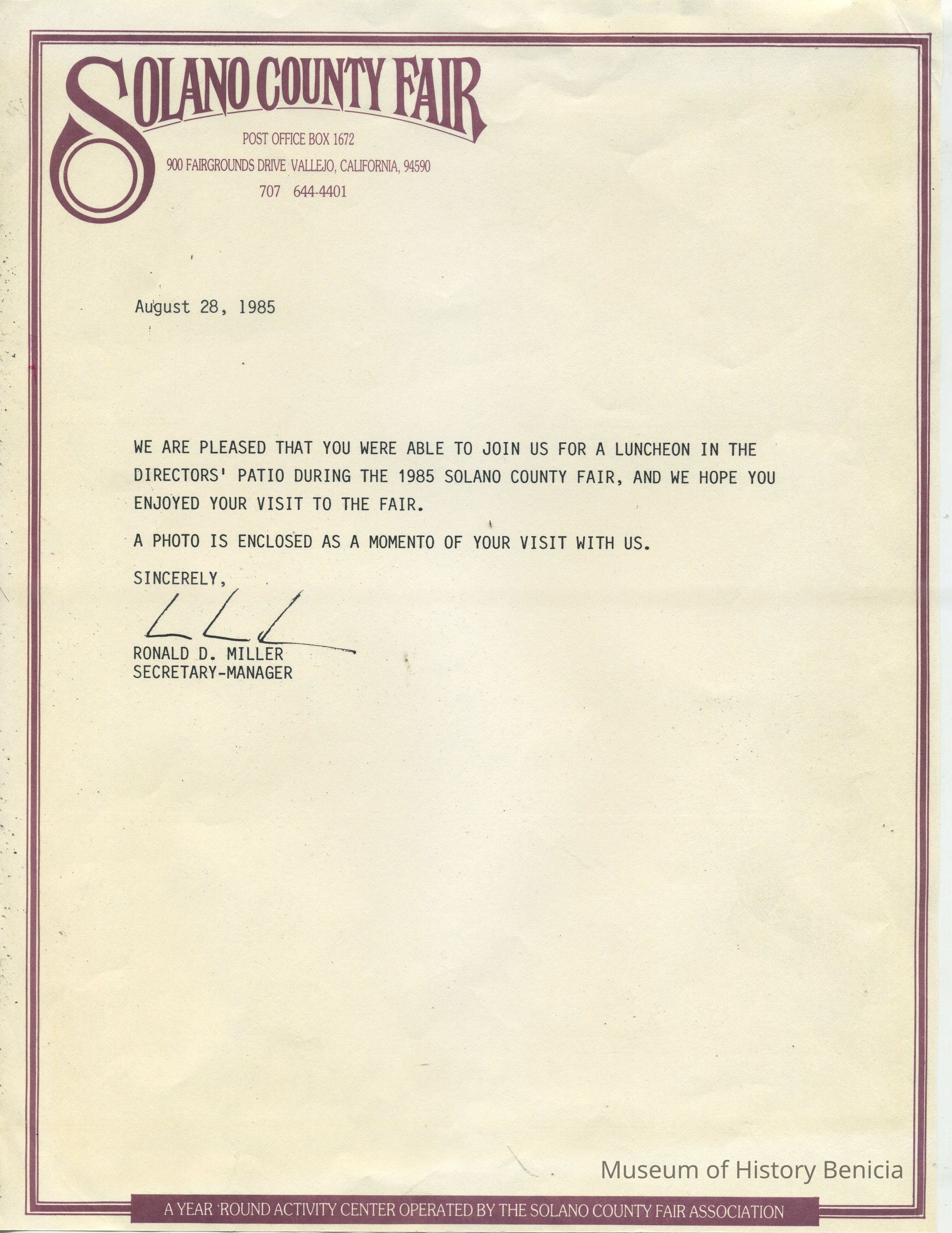 "We are pleased that you were able to join us for a luncheon in the Directors' Patio during the 1985 Solano County Fair, and we hope you enjoyed your visit to the Fair.