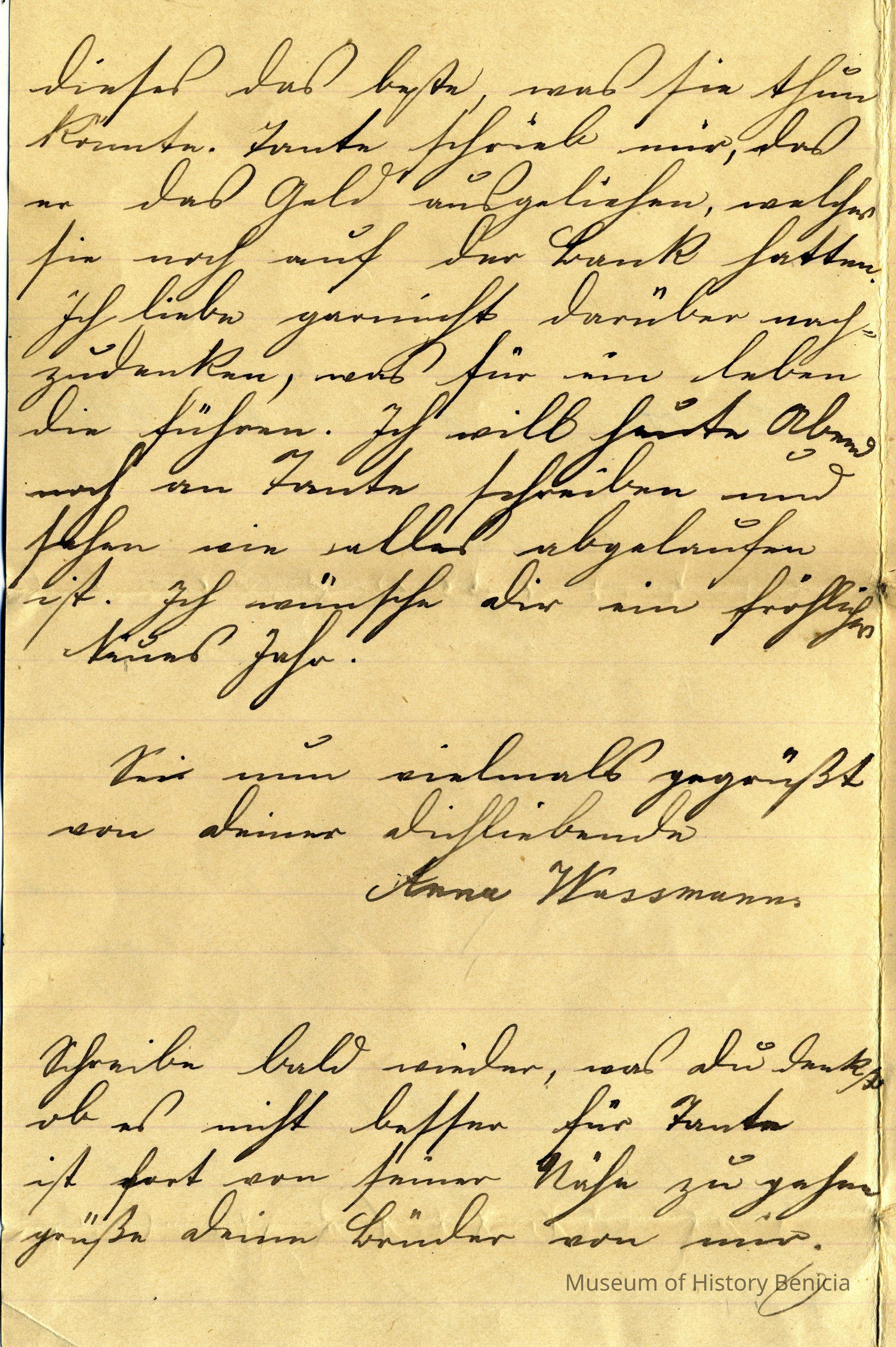 L.Gall is probably Louise Gall who was the sister of Kate Gall Wassmann married to John Wassmann and living in Oregon. The letter is talking about the concern that Anna Wassmann has for Kate. At the time Kate and her husband John were going through a divorce. One of the factors leading up to the divorce was a charge that John had attempted to kill Kate. They were divorced and then John claimed that Kate was insane and she ended up in a mental institution in Salem, Oregon. Her children, Walter G and Frank Henry Wassmann ended up living with Kate's brothers and sister in Benicia. They were Frederick, William and Louise Gall. (Frederick owned a Grocery on First and William was a butcher. Walter Wassmann ended up being a well respected butcher in Benicia.)