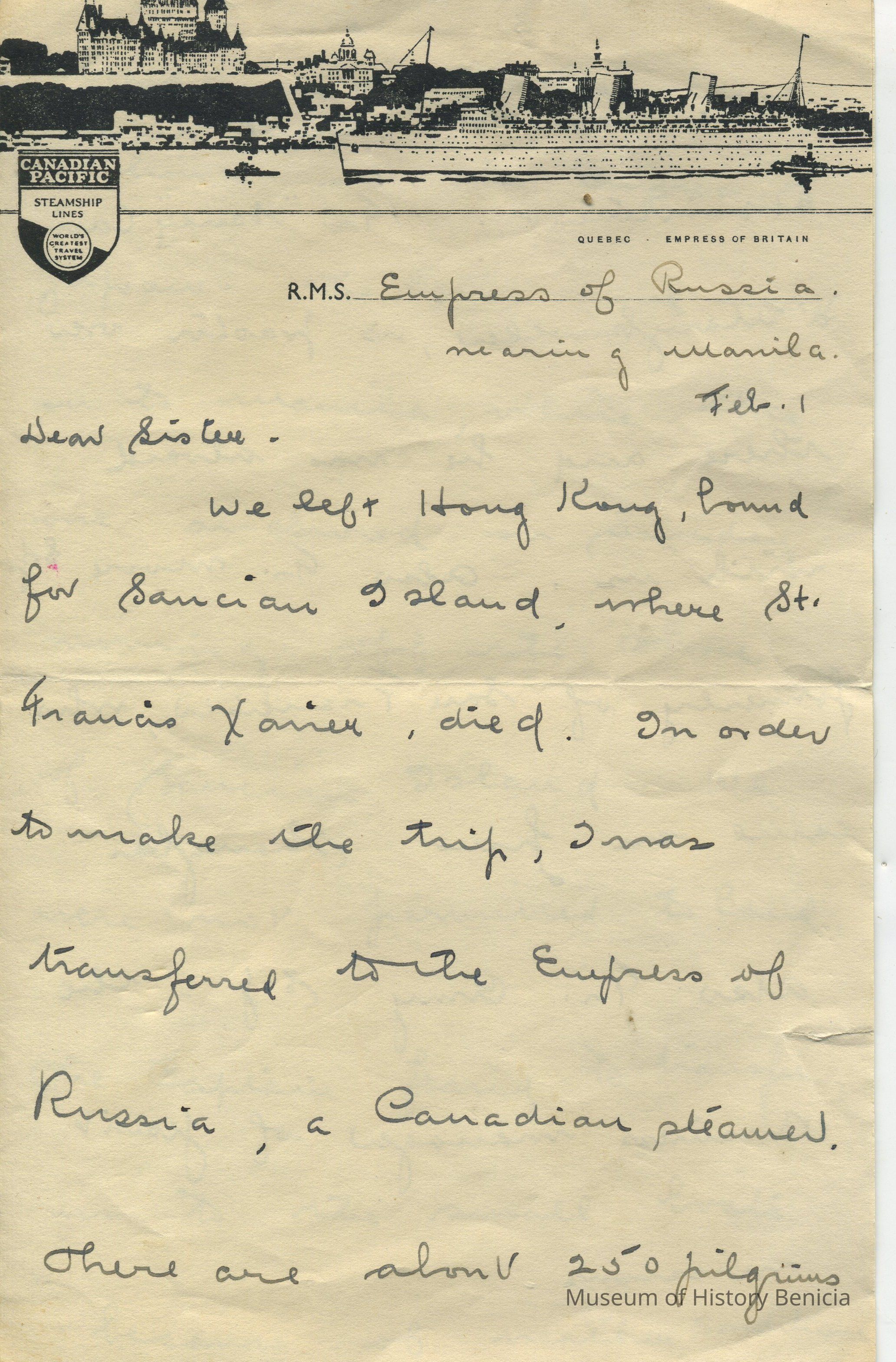 We left Hong Kong, bound for Sancian Island, where St. Francis Xavier died. In order to make the trip, I was transferred to the Empress of Russia, a Canadian steamer. There are about 250 pilgrims aboard, most of whom came to China on the Empress of Japan. The _______ vessel went on to Manila, while this one anchored on Sunday morning off the shore of Sancian Island. We were not permitted to land. The Captain feared to transfer us to the small boats because of weather conditions. There was considerable disappointment. Fr. "Sandy" Cairns, a Maryknoller, is pastor over there and he was aboard with us. Also Fr. Moore SJ formerly of San Francisco, who came on from Shanghai, also Fr. Amy SJ, the business manager of Jesuit Missons. I find the going on this steamer quiet compared with our crowd of pilgrims. Most of these people are Easterners, while vey many of ours are from the West Coast.