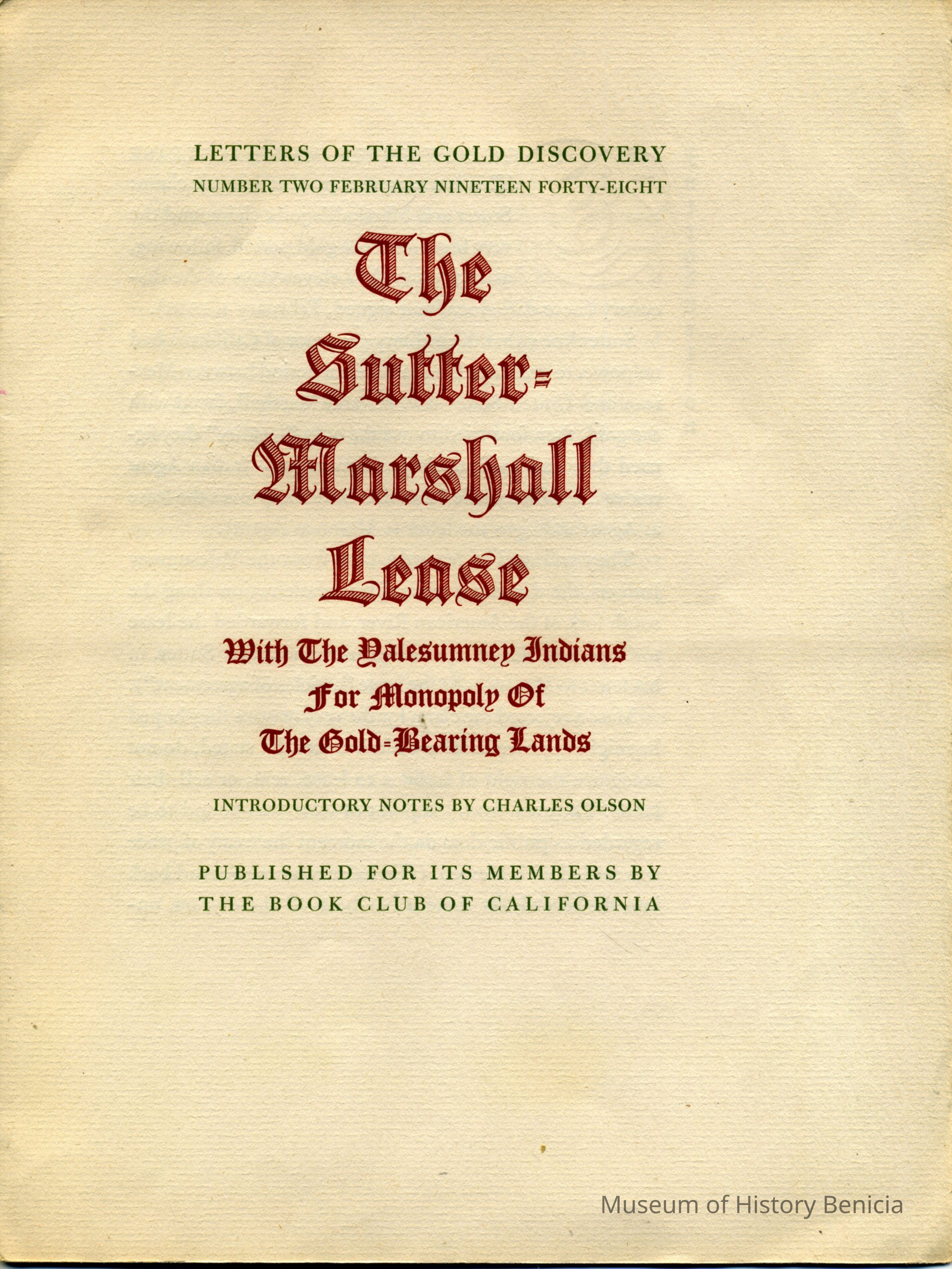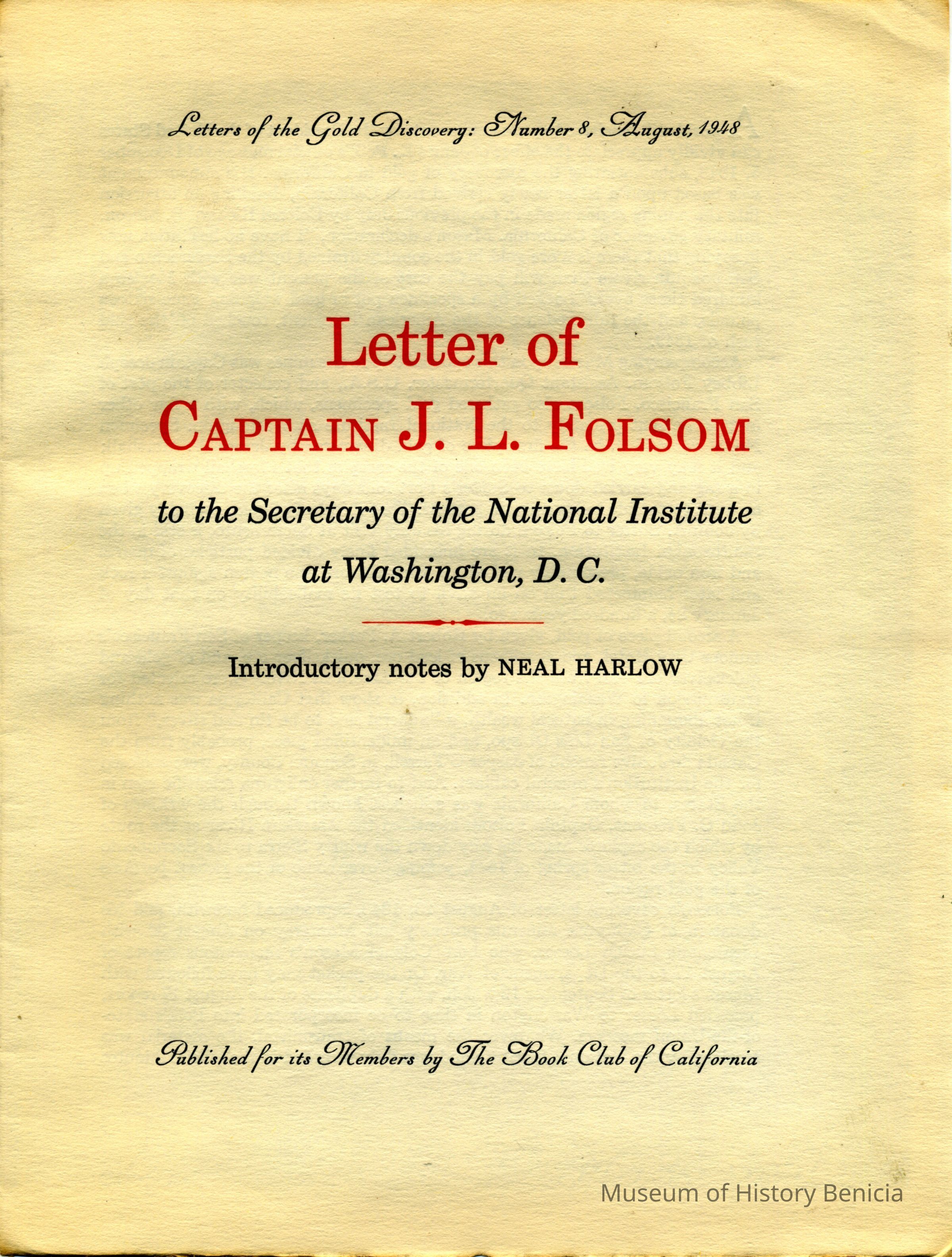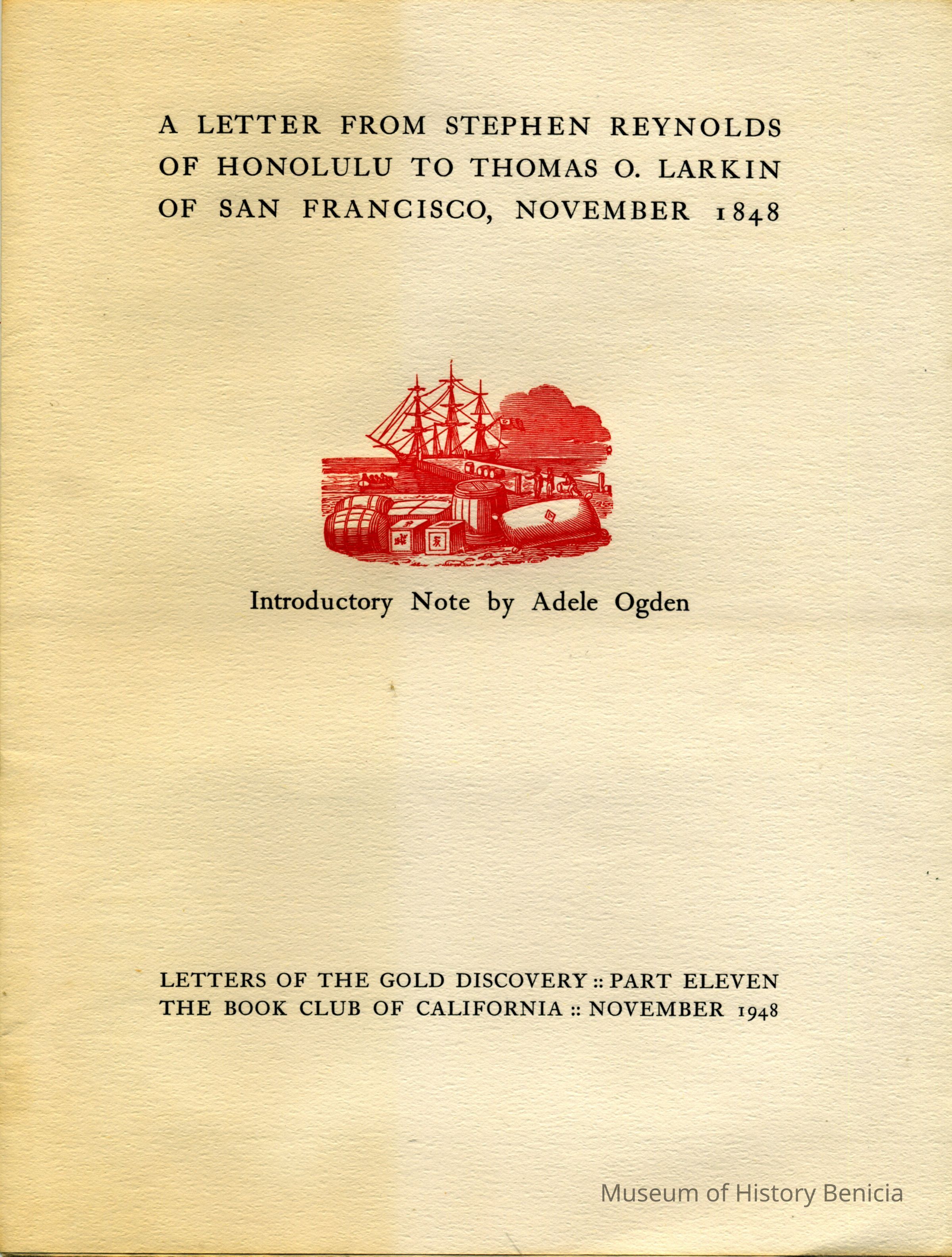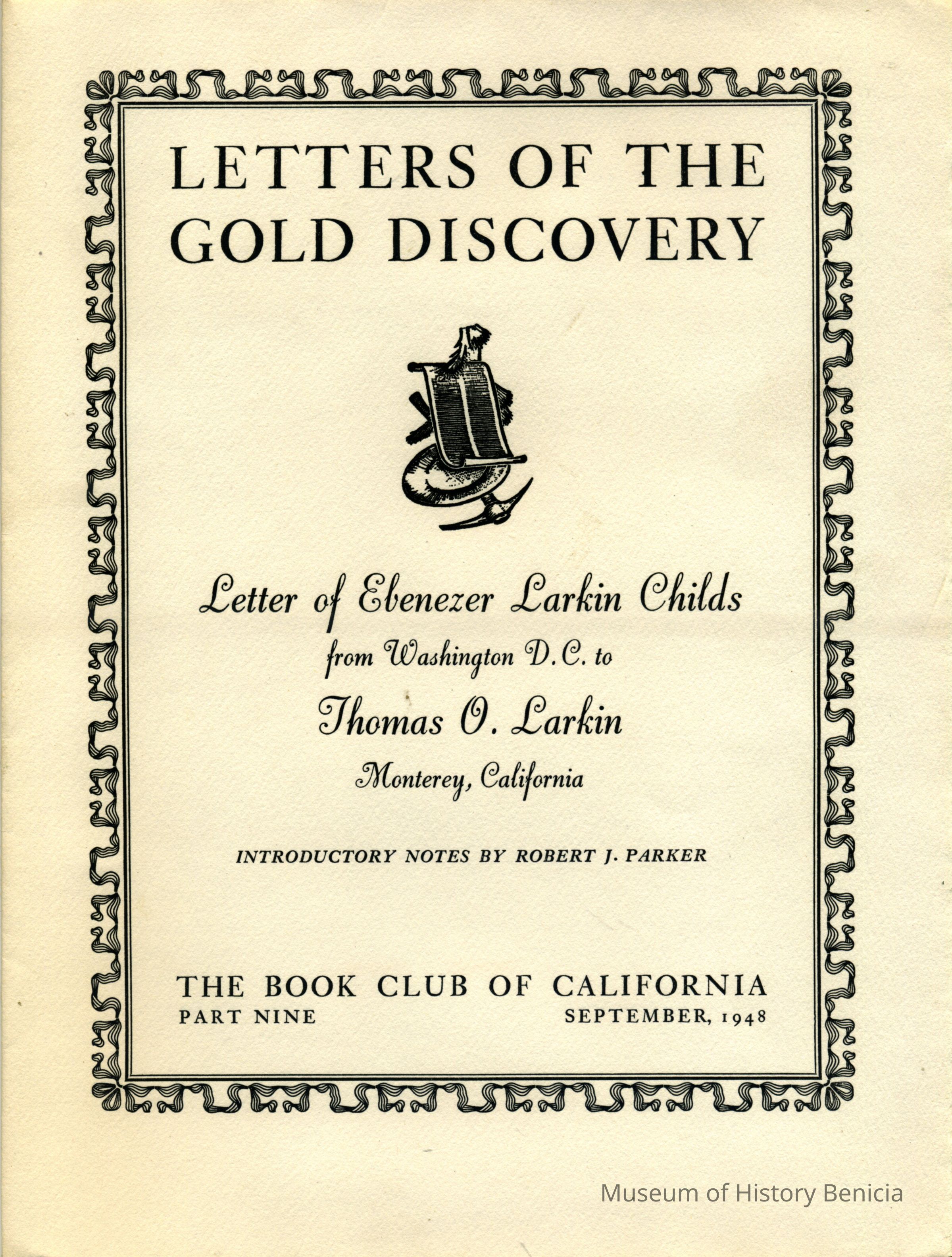 This is a facsimile of a historic letter having to do with the discovery of gold in California. It was a series put out by the Book Club of California in December of 1948. This box contains all twelve letters.