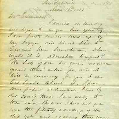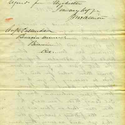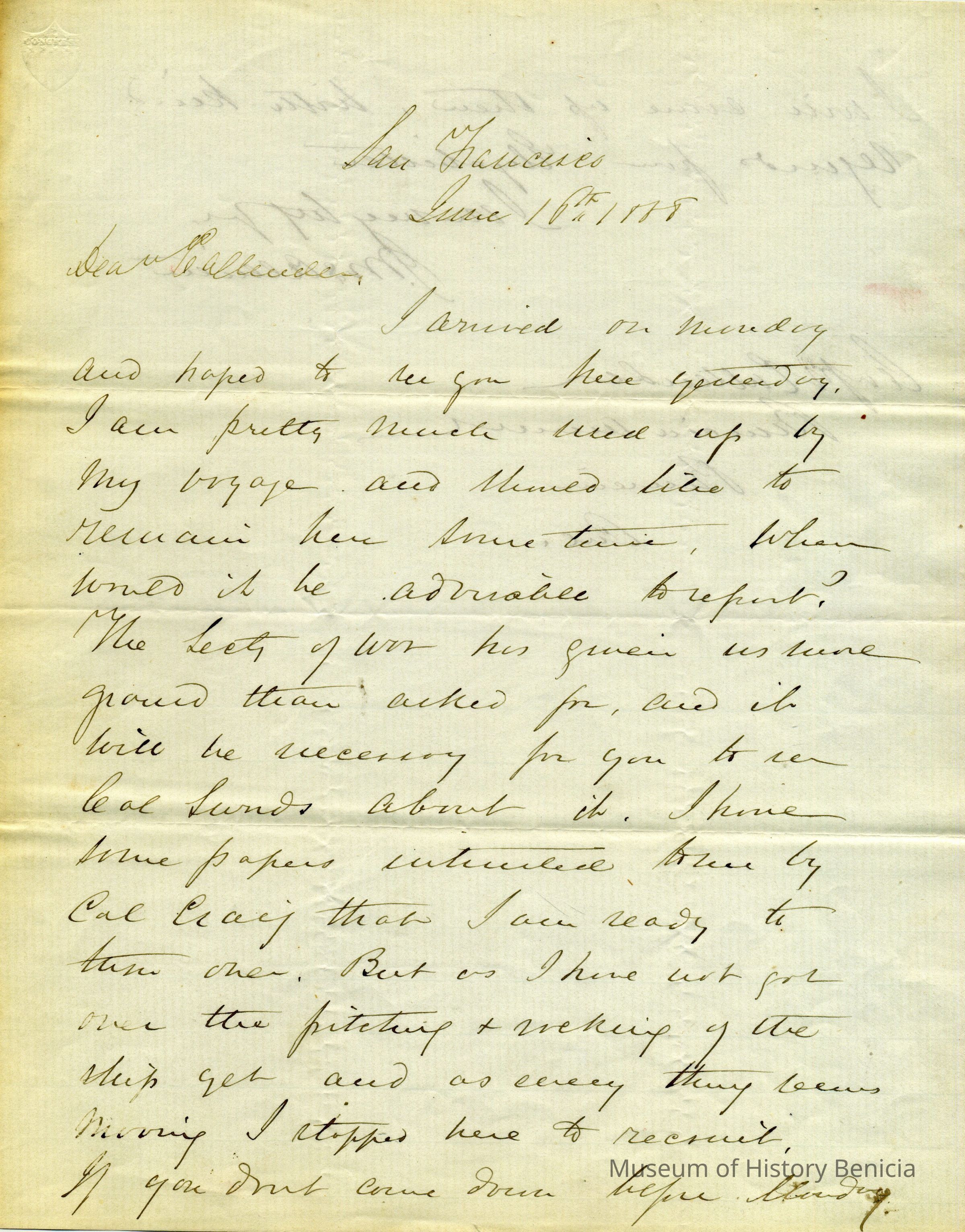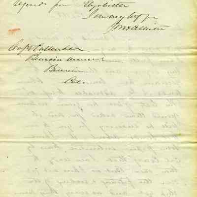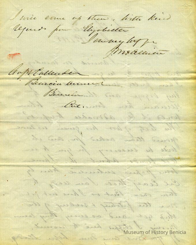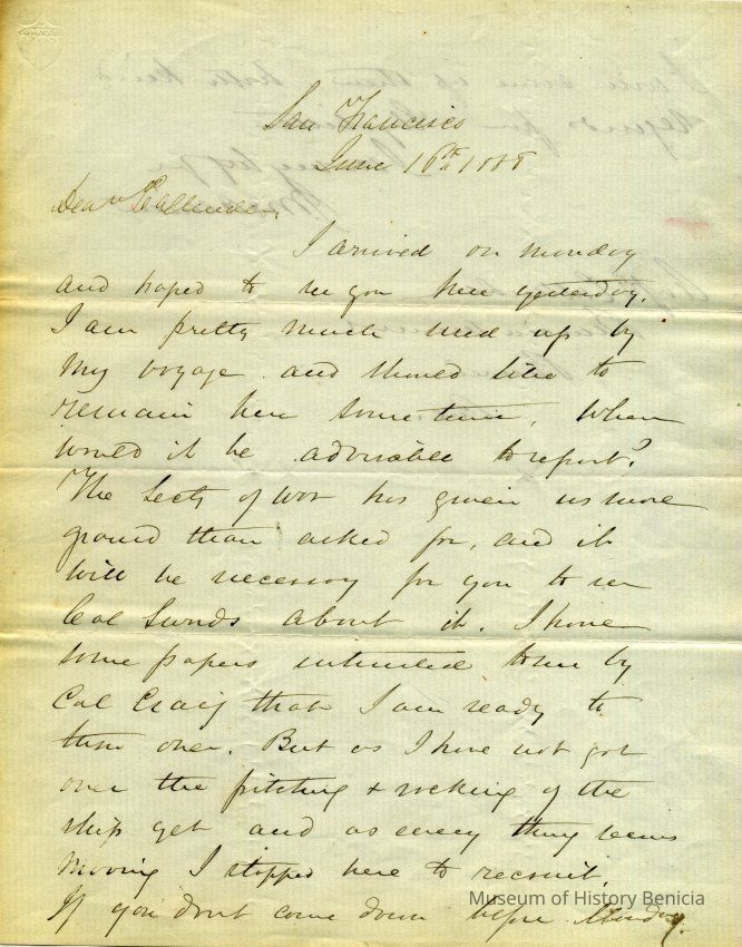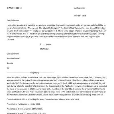 This is a letter from Captain Julian McAllister to Captain Franklin D. Callender, commander of Benicia Arsenal, dated 06/16/1858. McAllister is telling Callender that he has information from the Secretary of War (Jefferson Davis) to be given to the California Lands Commission. He then complains about not having recovered from the ship and says they can meet Thursday.Collection