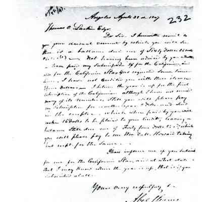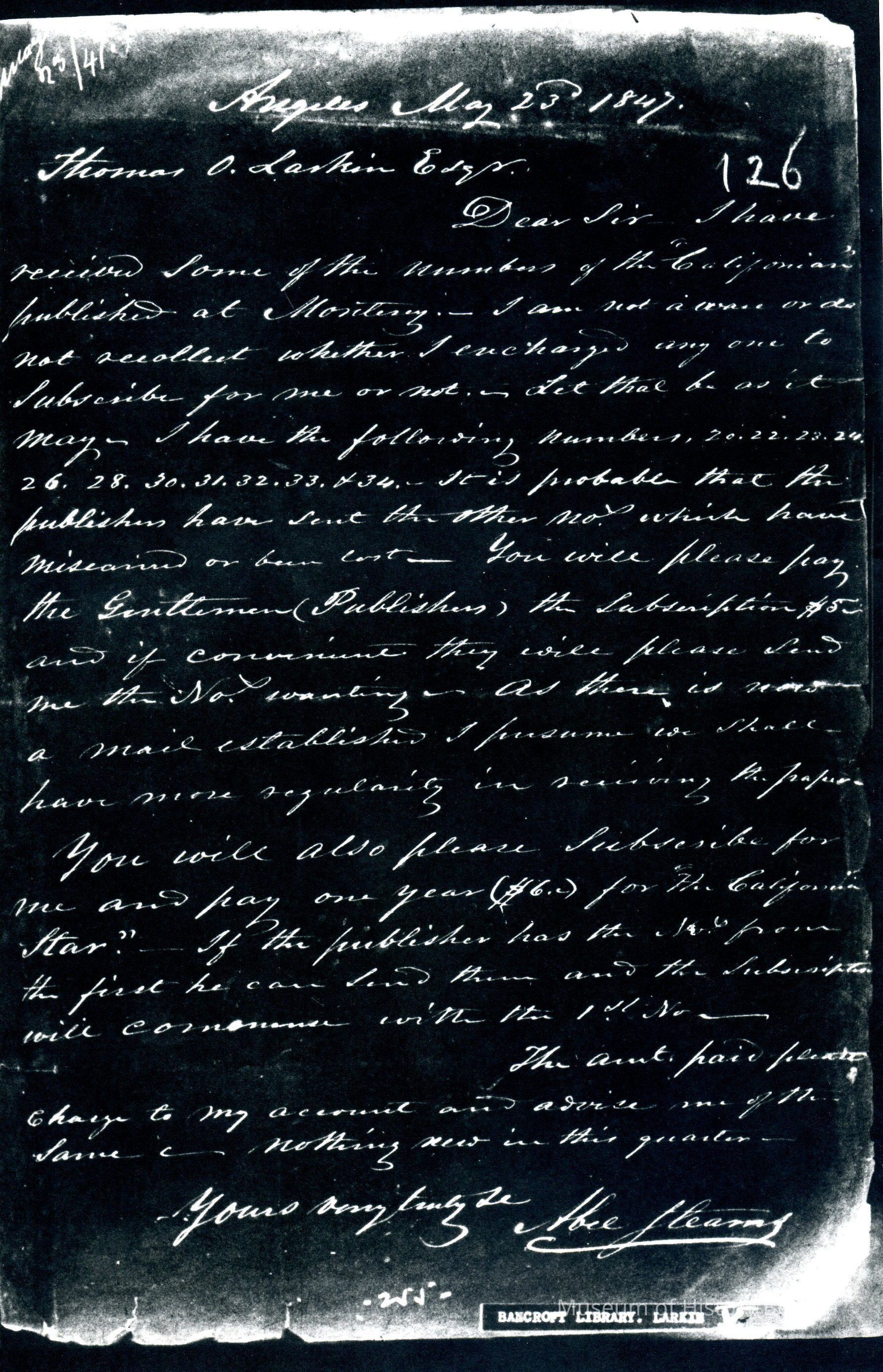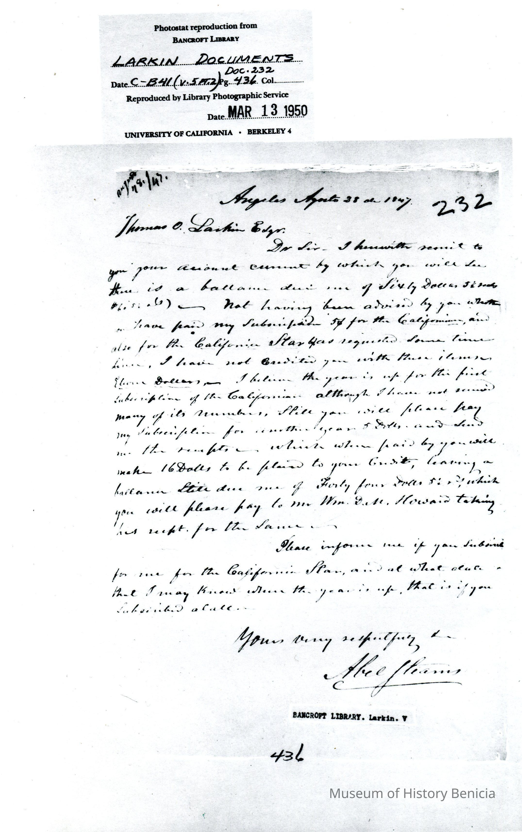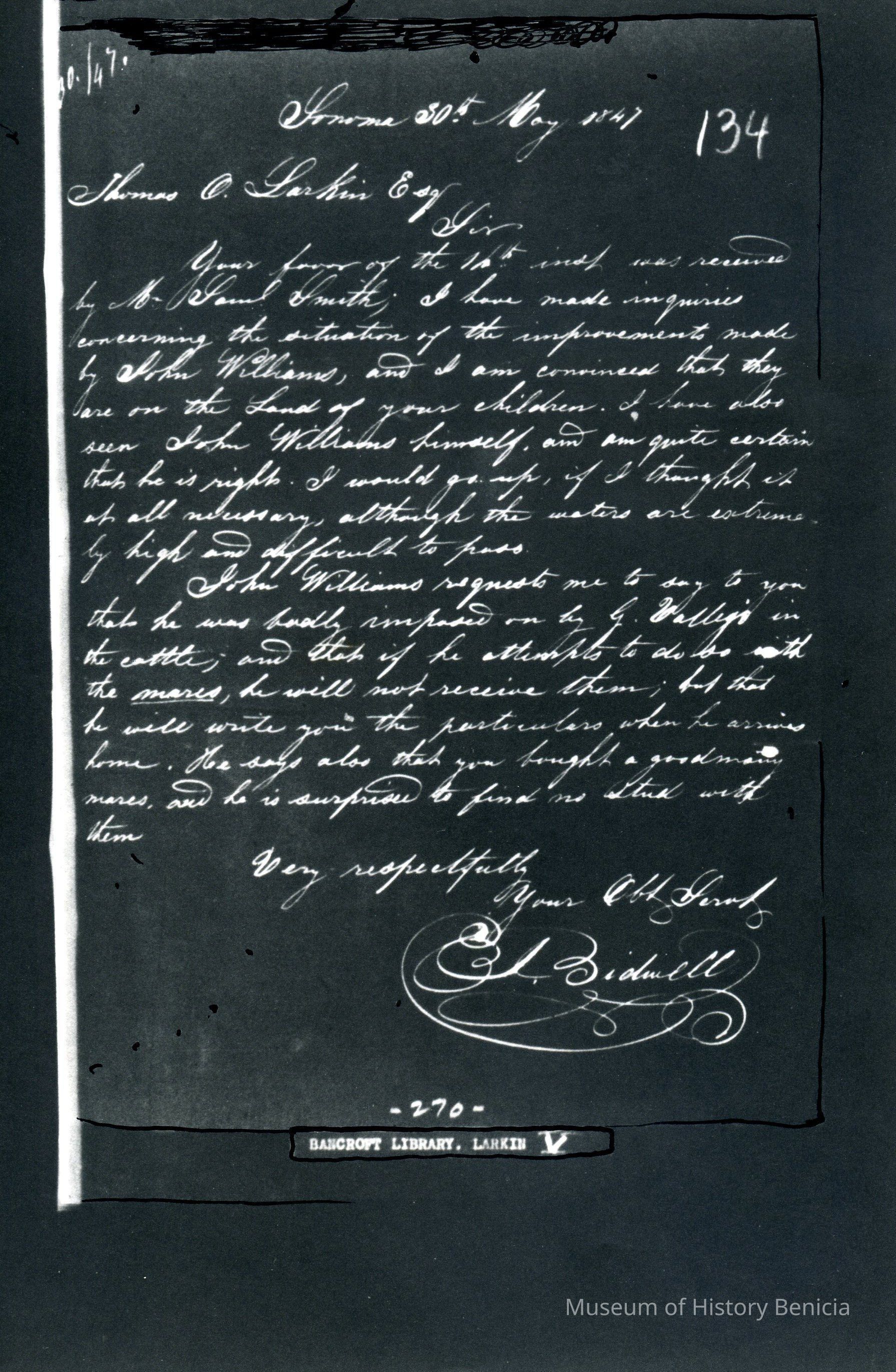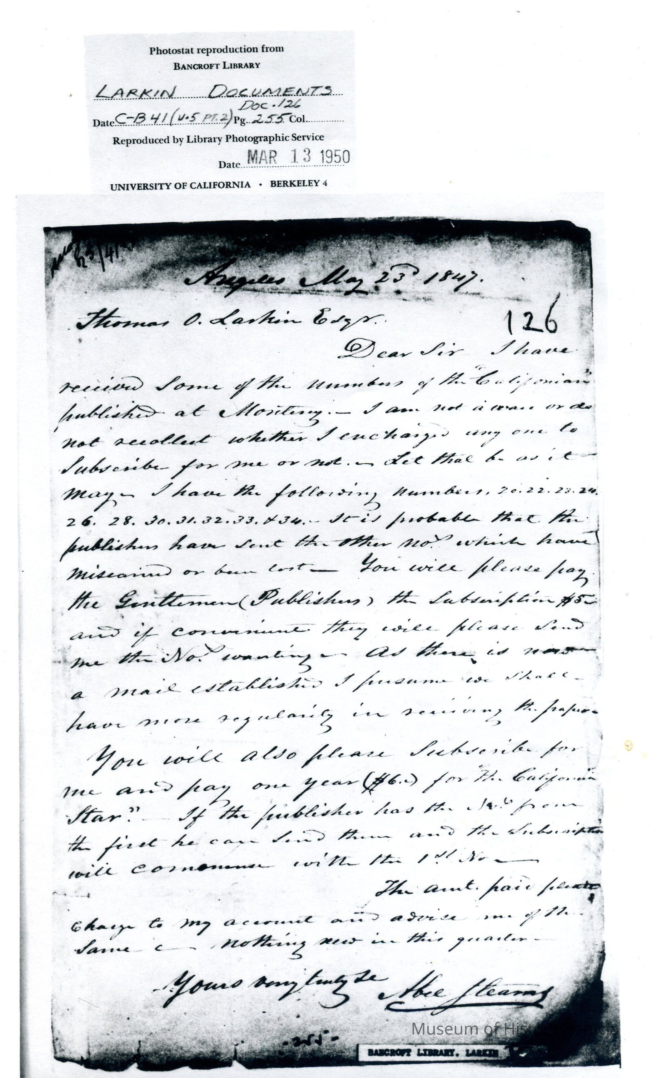 This is included in a collection of letters and documents for a forthcoming book published in 1950. Mr Wohlgemuth was contributing chapters to a four volume history of Free Masonry in California which was published in 1950. He was researching Dr. Robert Semple and events of that era. The volumes are available for reference in the Benicia Public Library.Collection