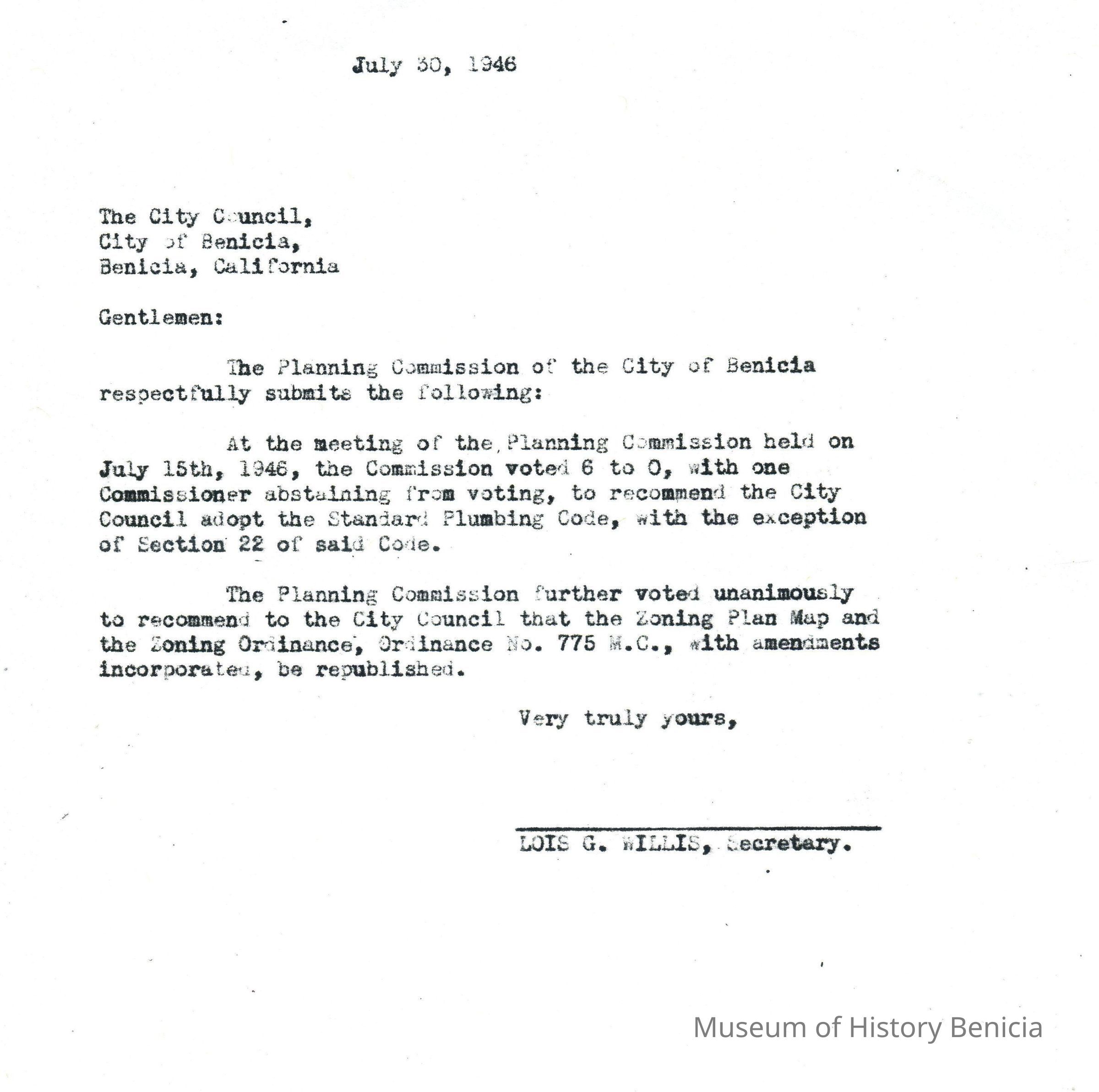 Letter from the secretary (Lois Willis) of the Benicia Planning Commission to the Benicia City Council regarding a 6 to 0 vote on July 15, 1946, to recommend that the City Council adopt the Standard Plumbing Code with the exception of Section 22 of said Code. The Commission also voted unanimously to recommend that the Council republish the Zoning Plan Map and the Zoning Ordinance No. 775 M.C. with amendments.