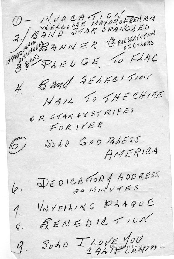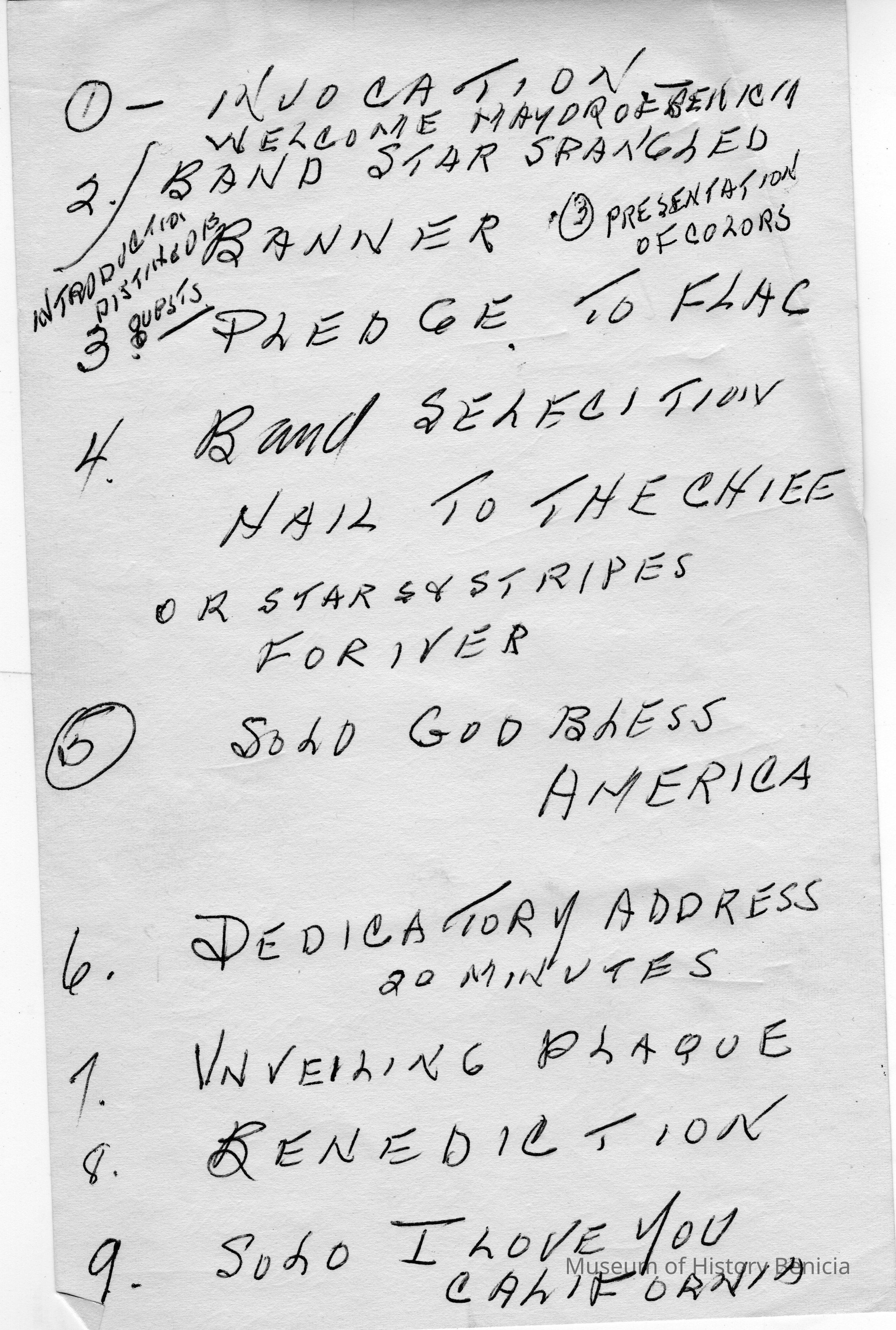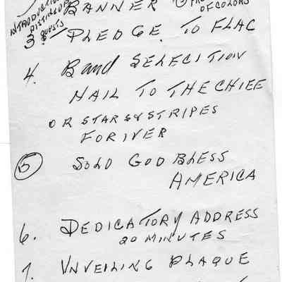 Notes on a dedication ceremony probably by John O'Grady for the Pony Express dedication in 1960. This was found in a booklett on Pony Express Historical Marker.