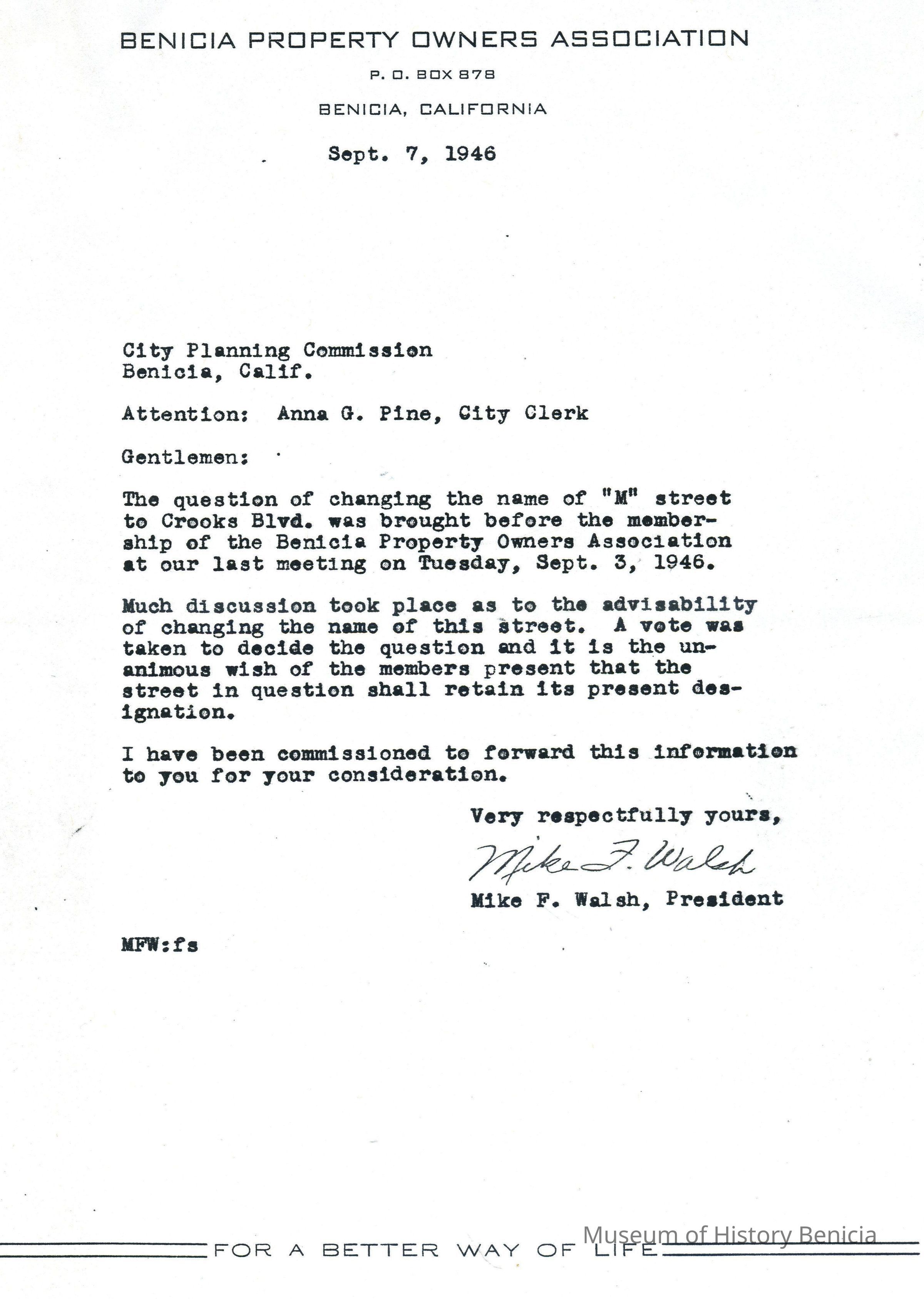 One of a group of Four Letters from September and October 1946 on the subject of changing the name of M Street to Crooks Boulevard.