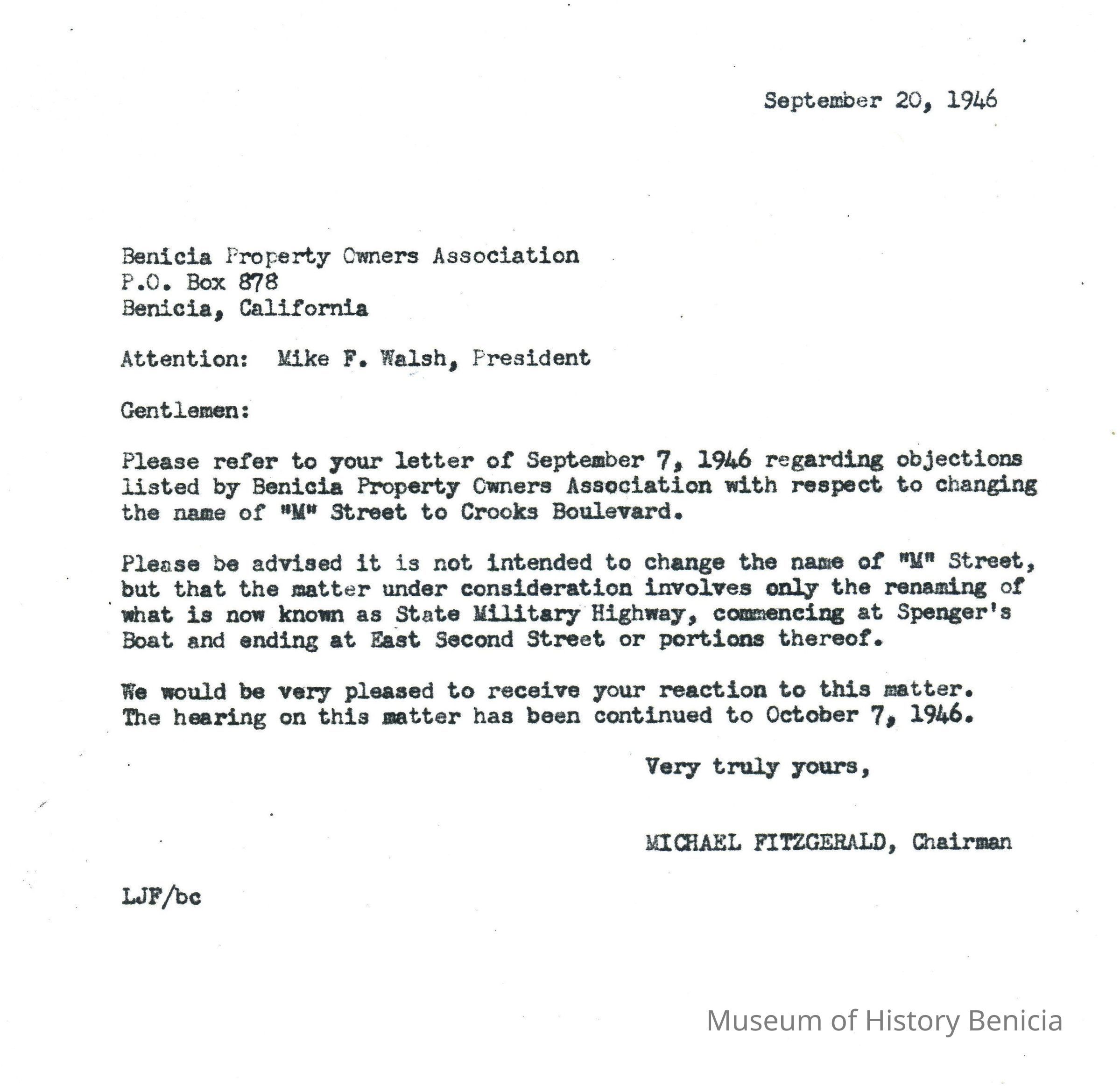 Second of a group of Four Letters from September and October 1946 on the subject of changing the name of M Street to Crooks Boulevard.