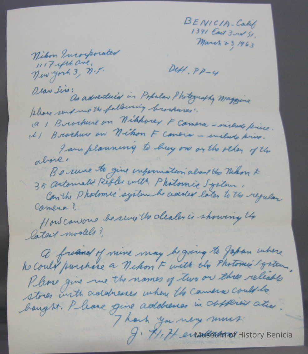 Letter from Joe Henderson to Nikon Inc. Dated 03/23/1963 asking for information on Nikon cameras.