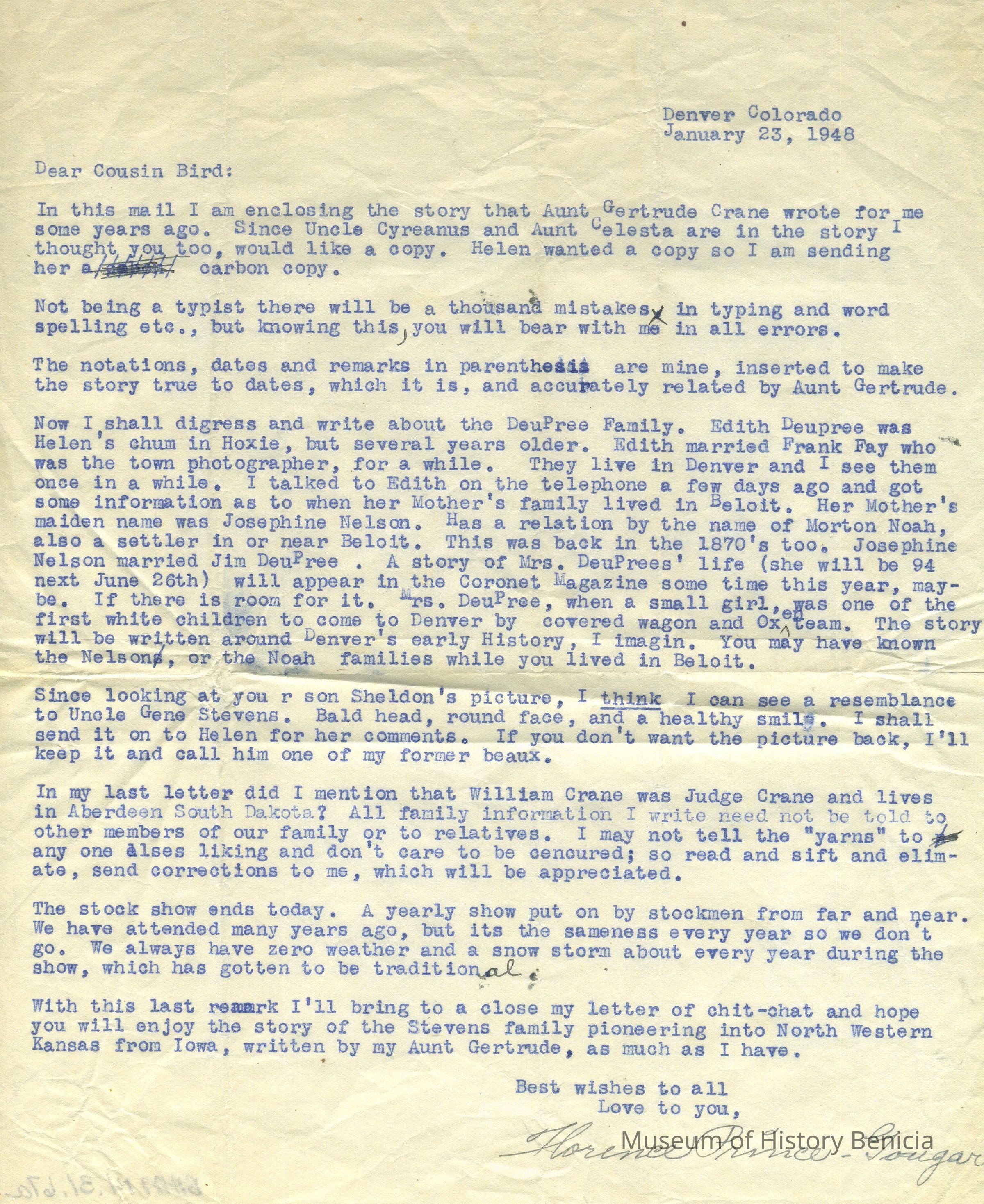 Carbon copy of a typed letter to "Cousin Bird" (Sara Stevens Rankin) from Florence Prince-Gougar from Denver, Colorado on January 23, 1948. Enclosed with the letter are three pages (page 2 is missing) regarding some history of the Stevens Family. The pages are a typed translation as written by Gertrude Crane and dated March 25, 1936. It begins with Olivetta Inez Stevens born in Mass. on January 3, 1855, and it continues with information about the childhoods of several children and some genealogy.