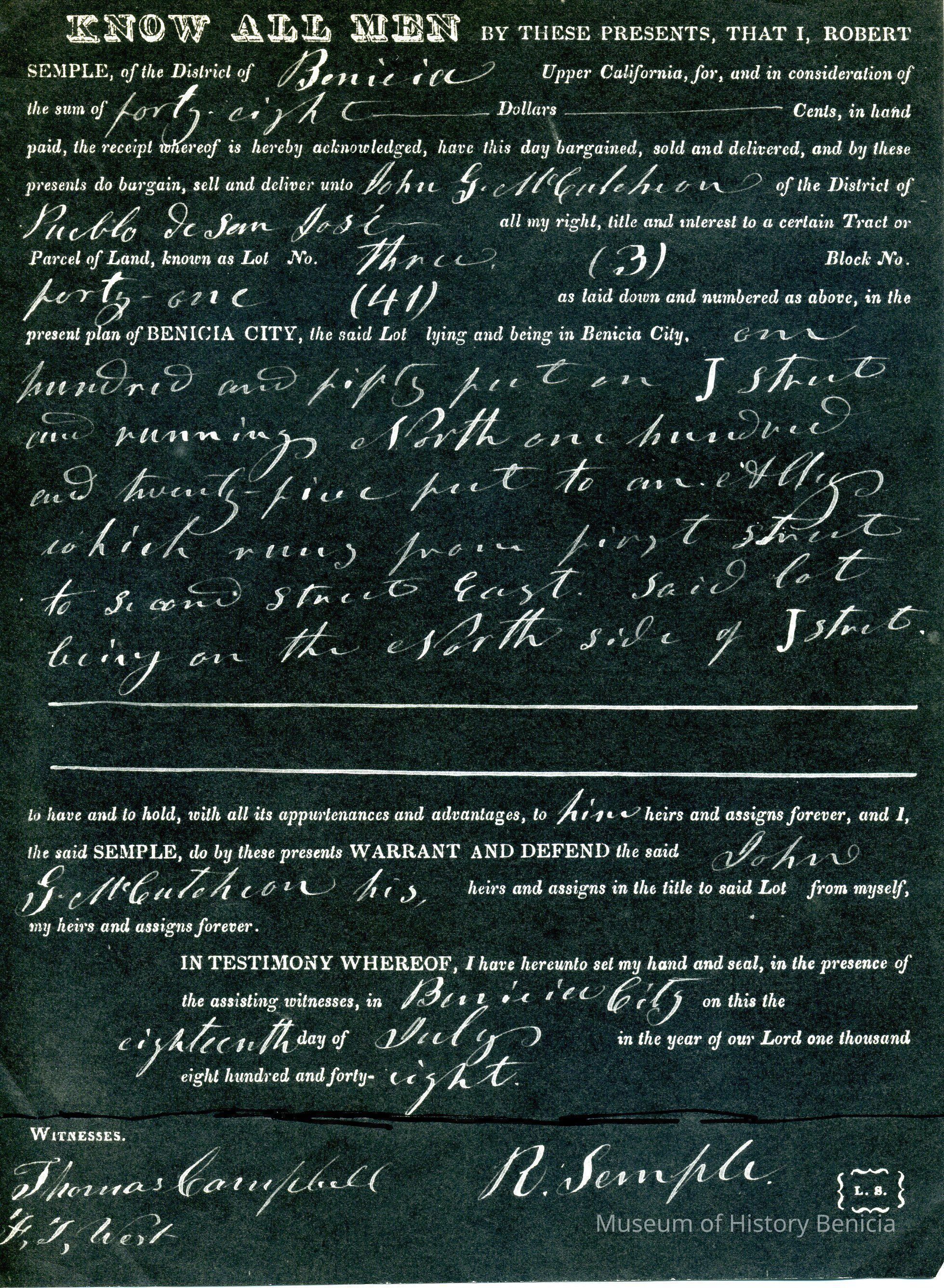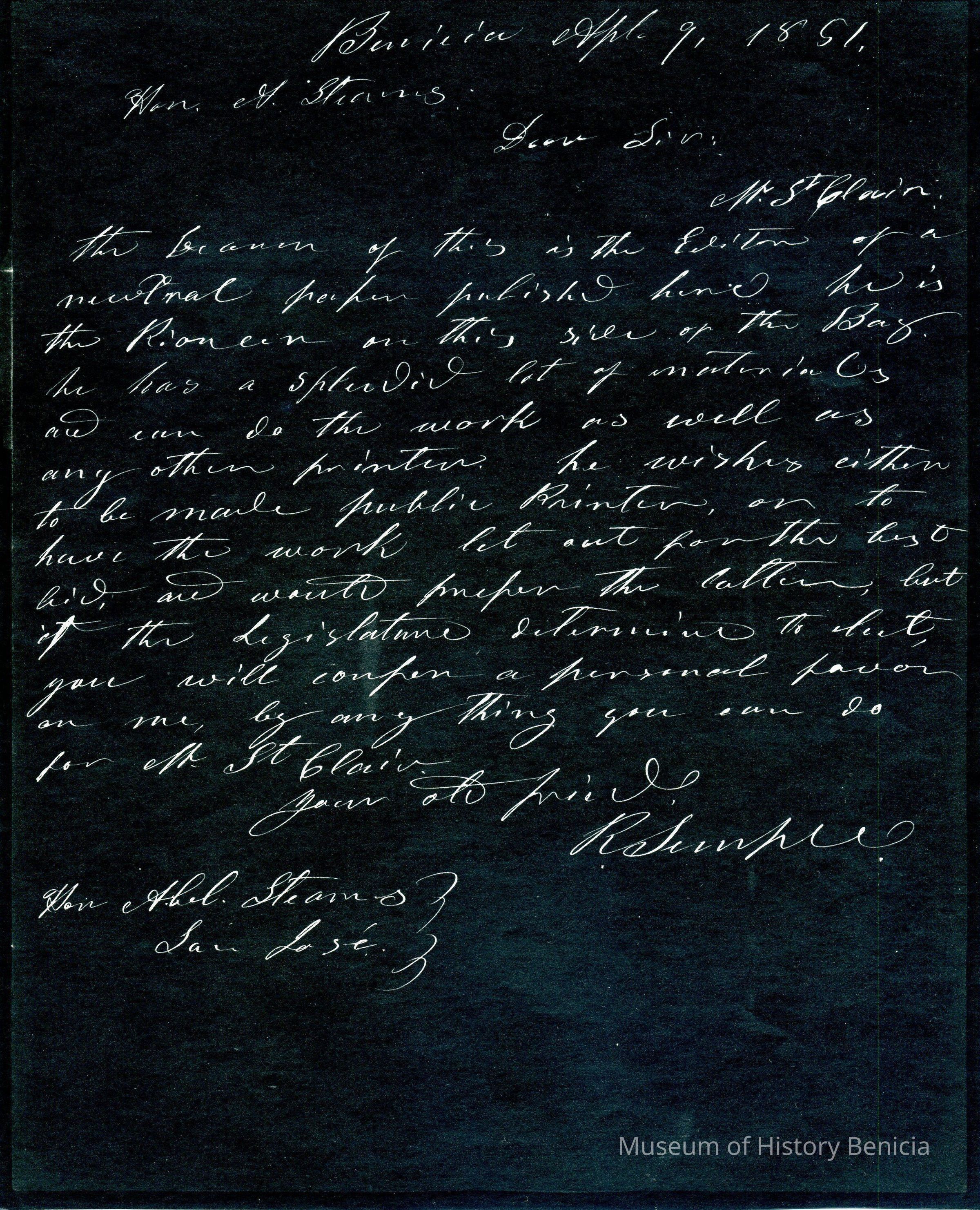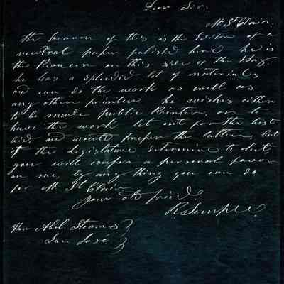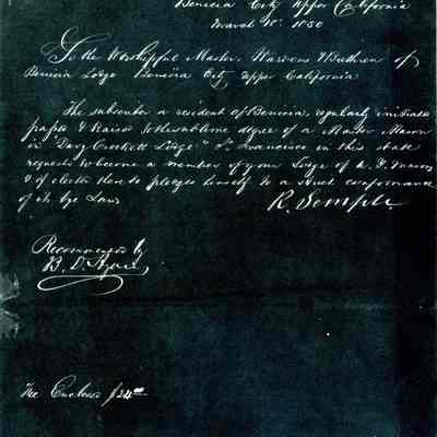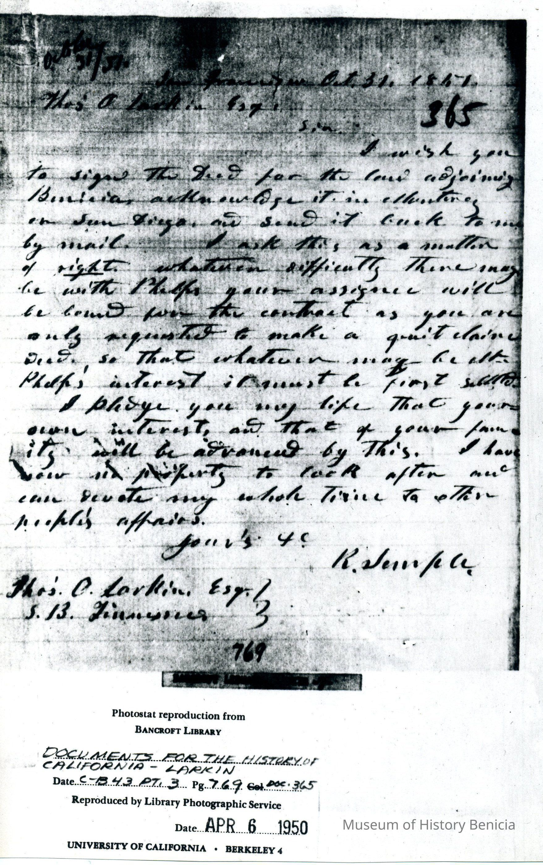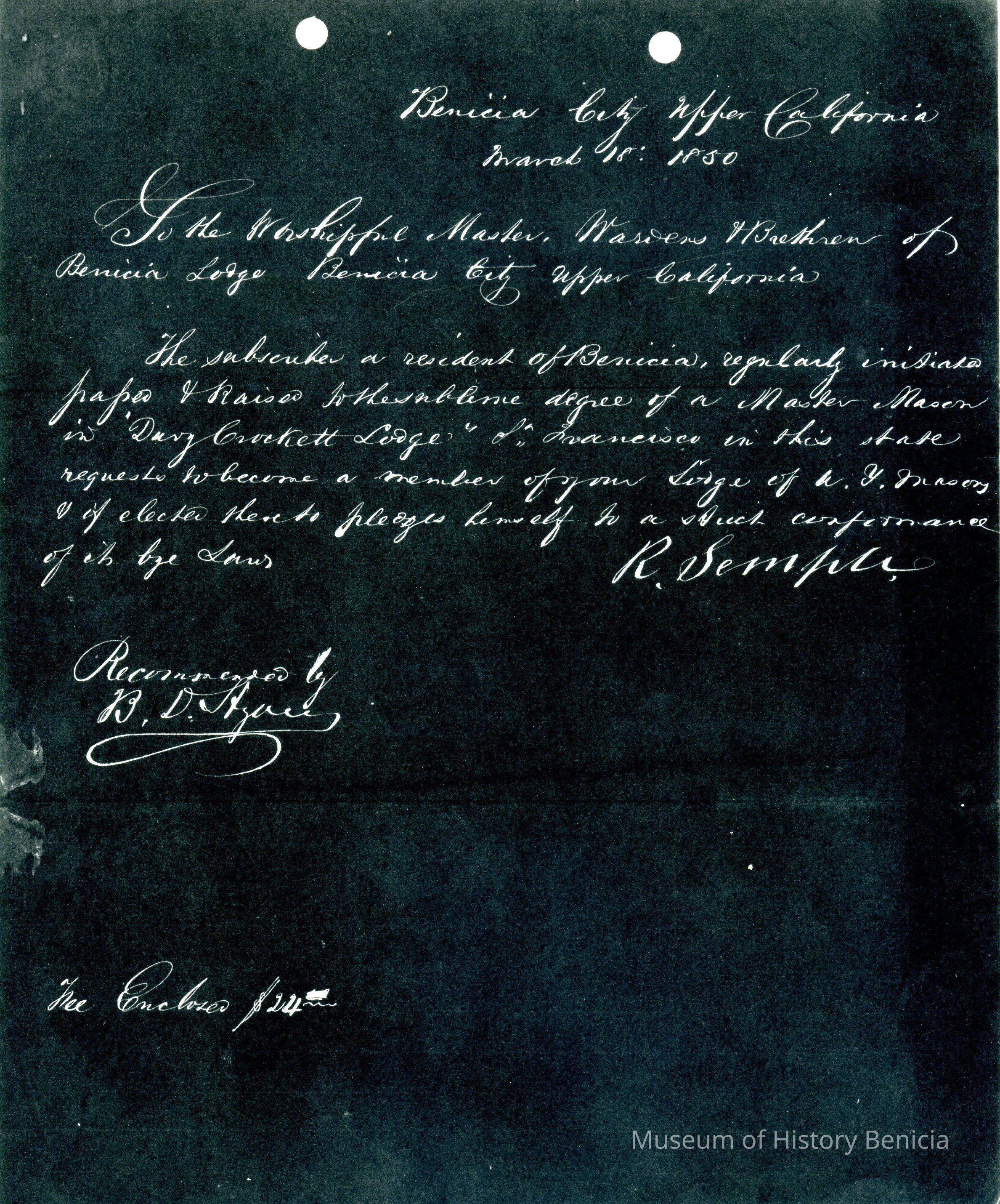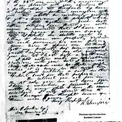 This is included in a collection of letters and documents for a forthcoming book published in 1950. Mr Wohlgemuth was contributing chapters to a four volume history of Free Masonry in California which was published in 1950. He was researching Dr. Robert Semple and events of that era. The volumes are available for reference in the Benicia Public Library.Collection
