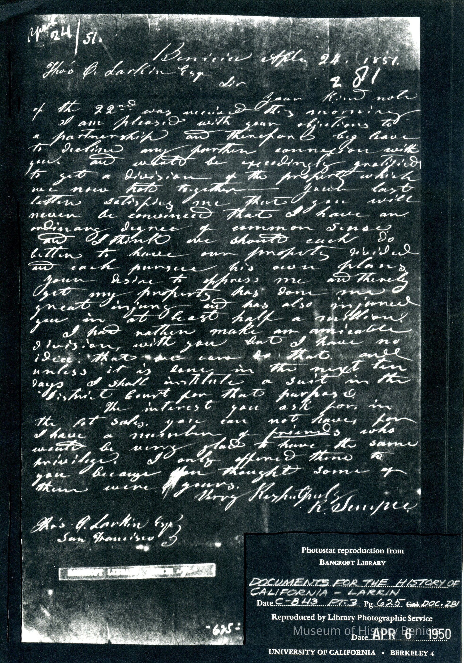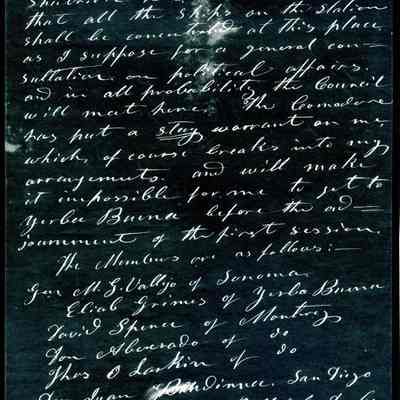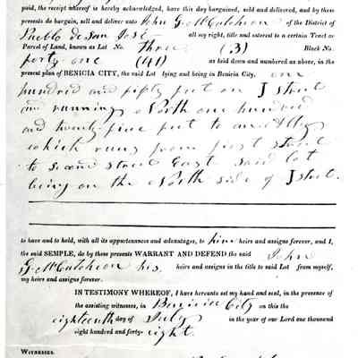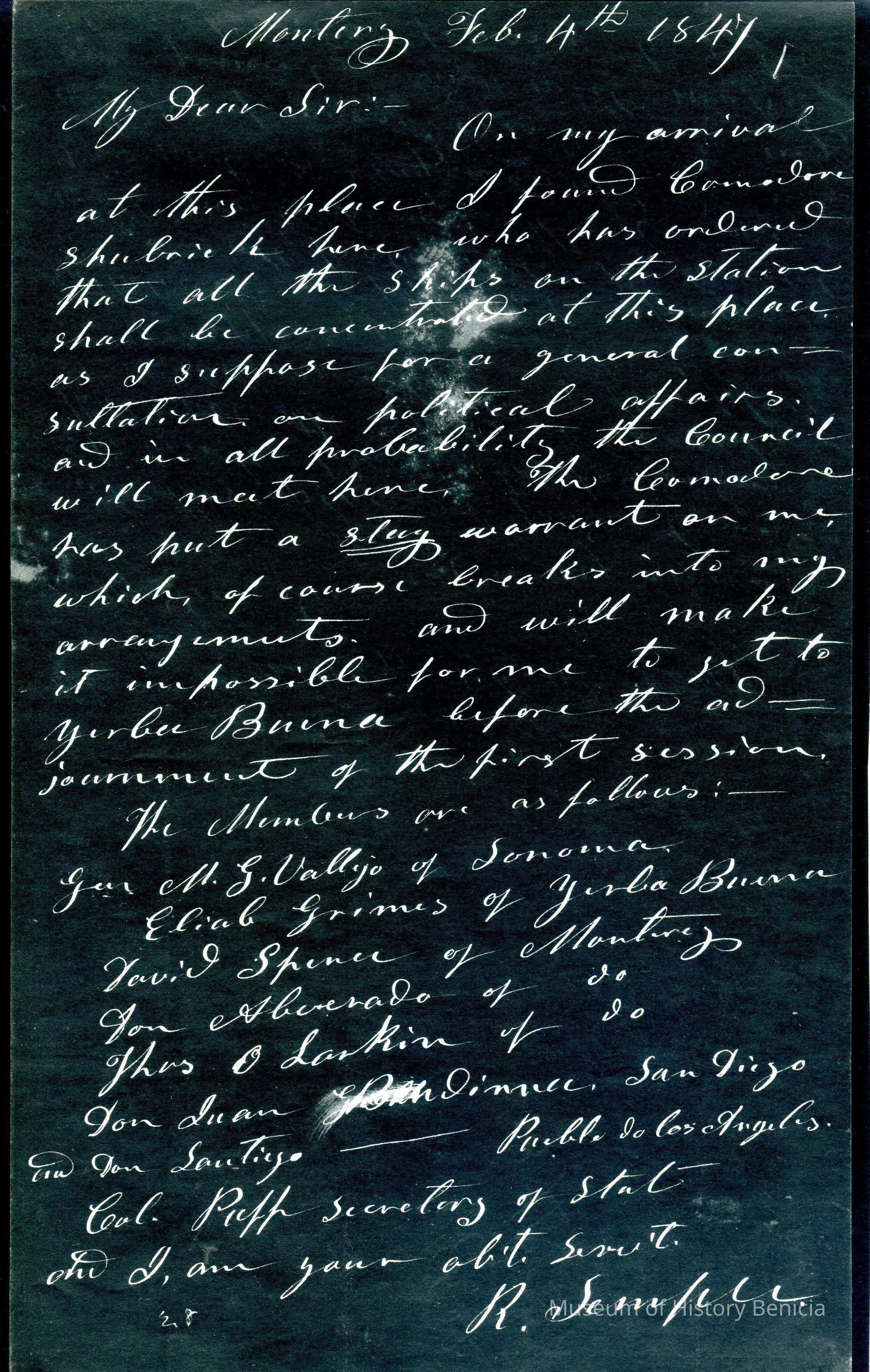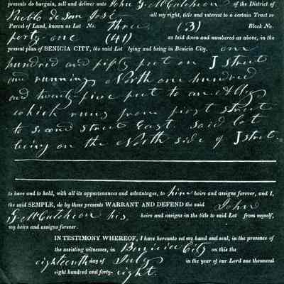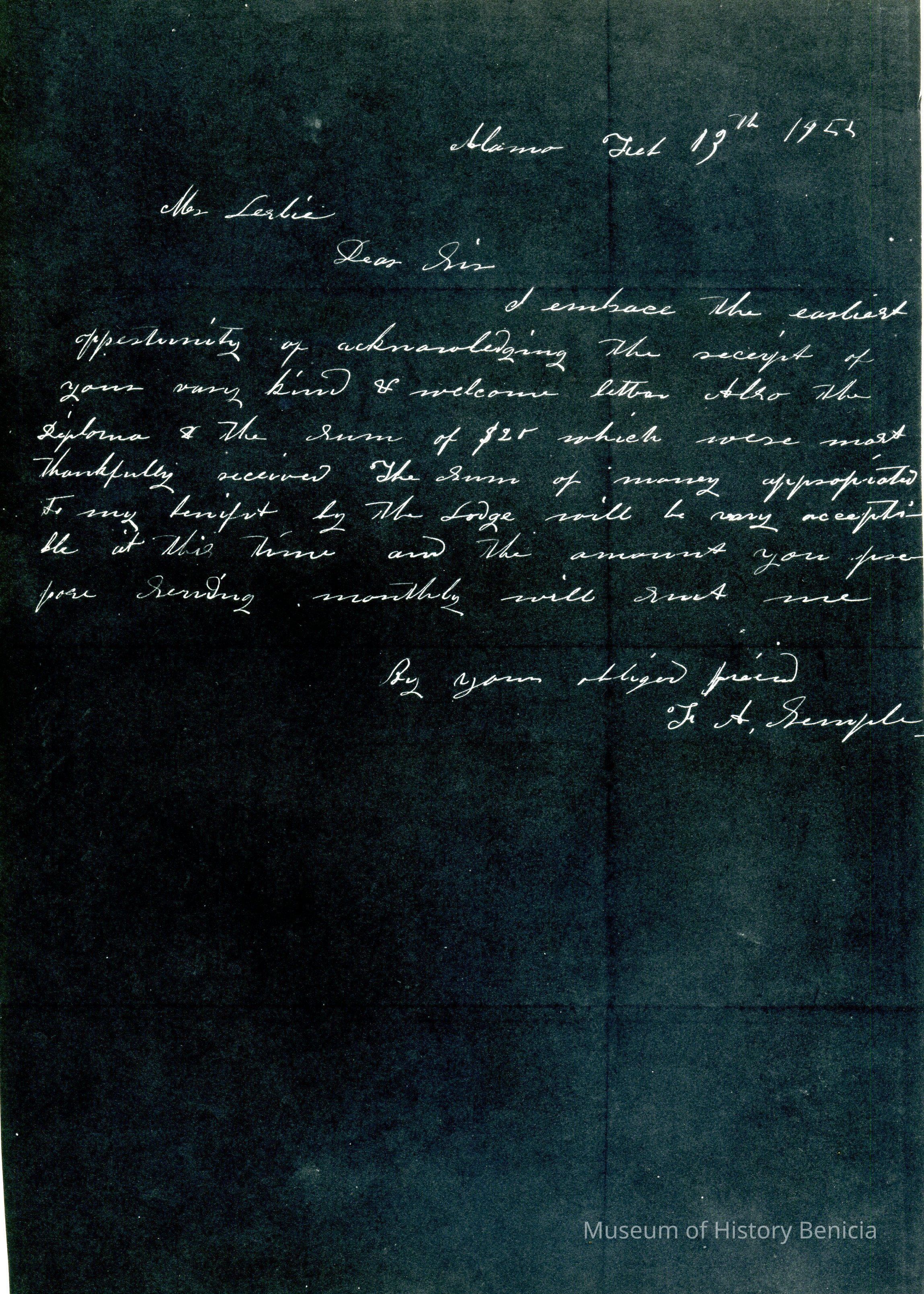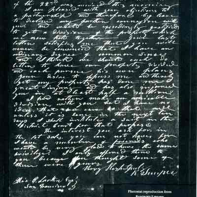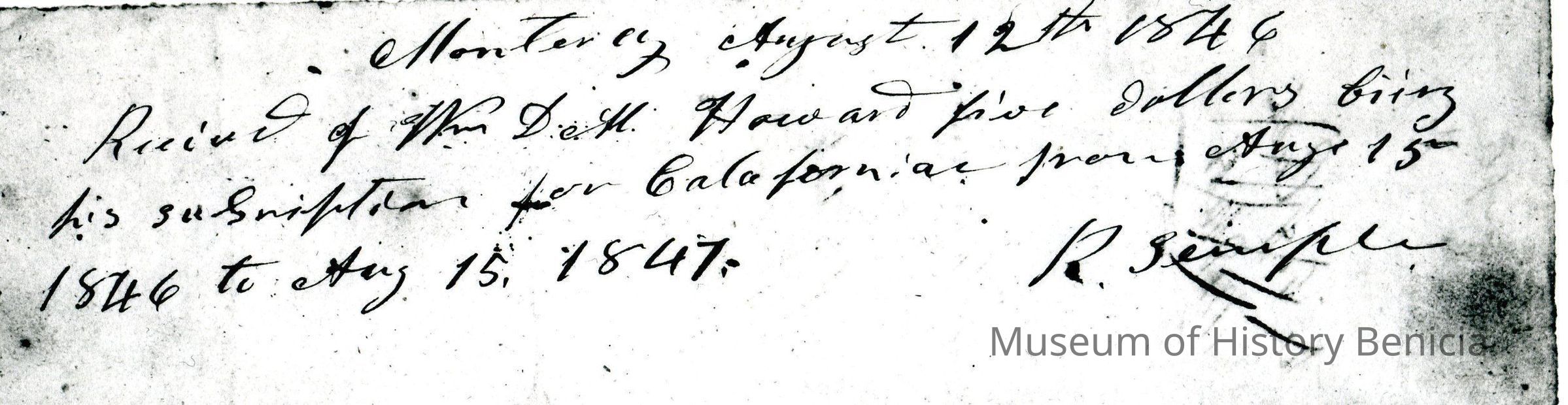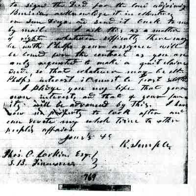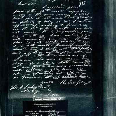 This is included in a collection of letters and documents for a forthcoming book published in 1950. Mr Wohlgemuth was contributing chapters to a four volume history of Free Masonry in California which was published in 1950. He was researching Dr. Robert Semple and events of that era. The volumes are available for reference in the Benicia Public Library.Collection