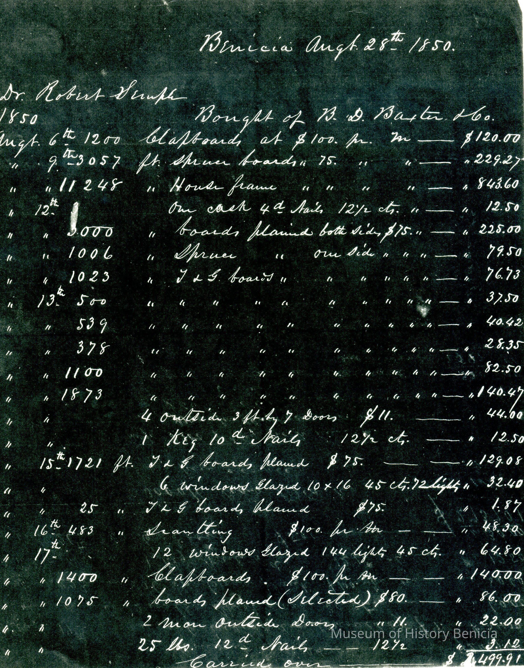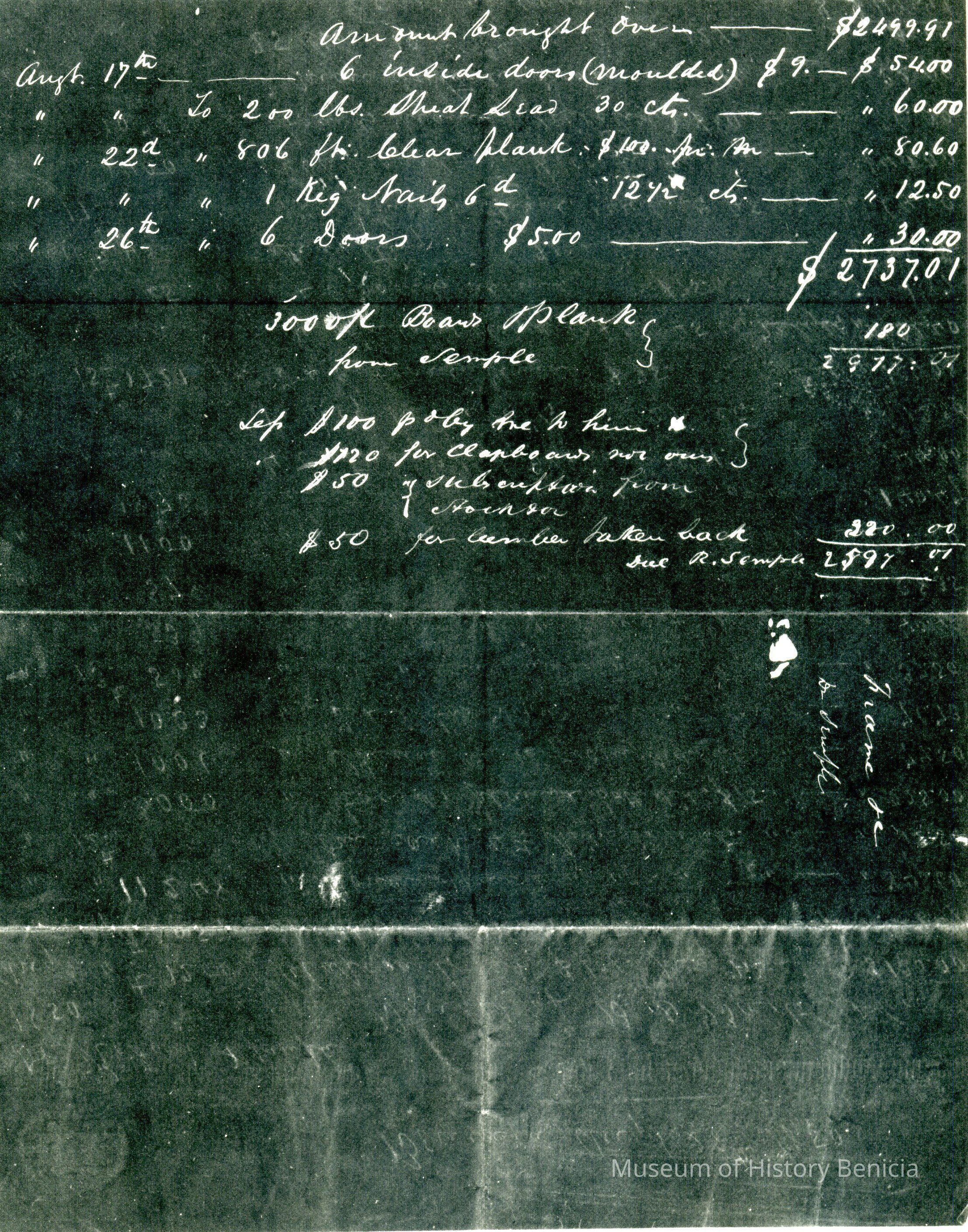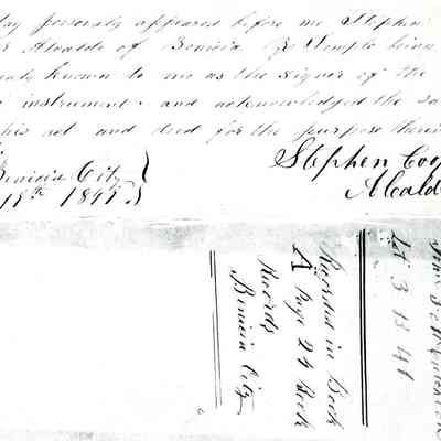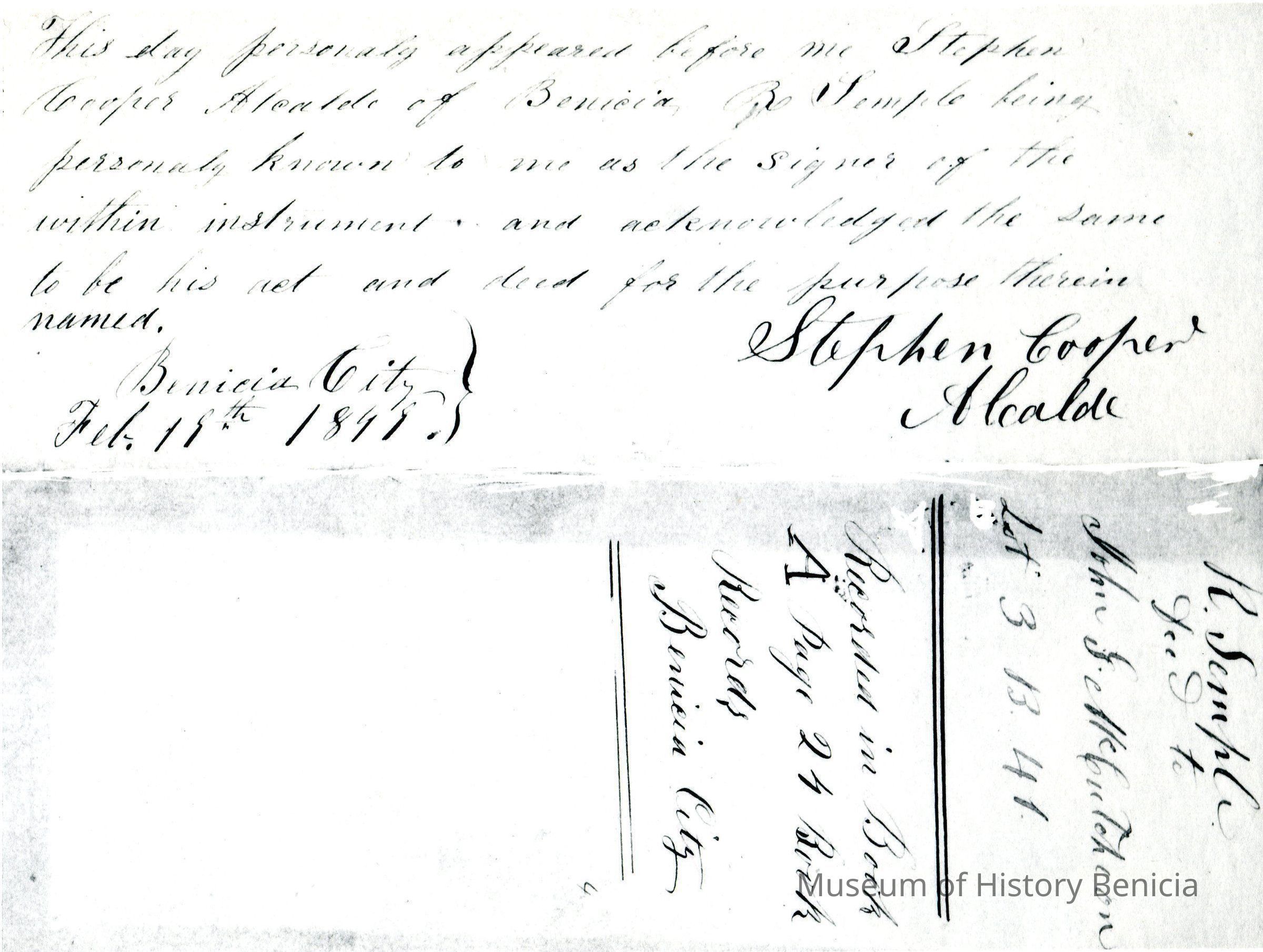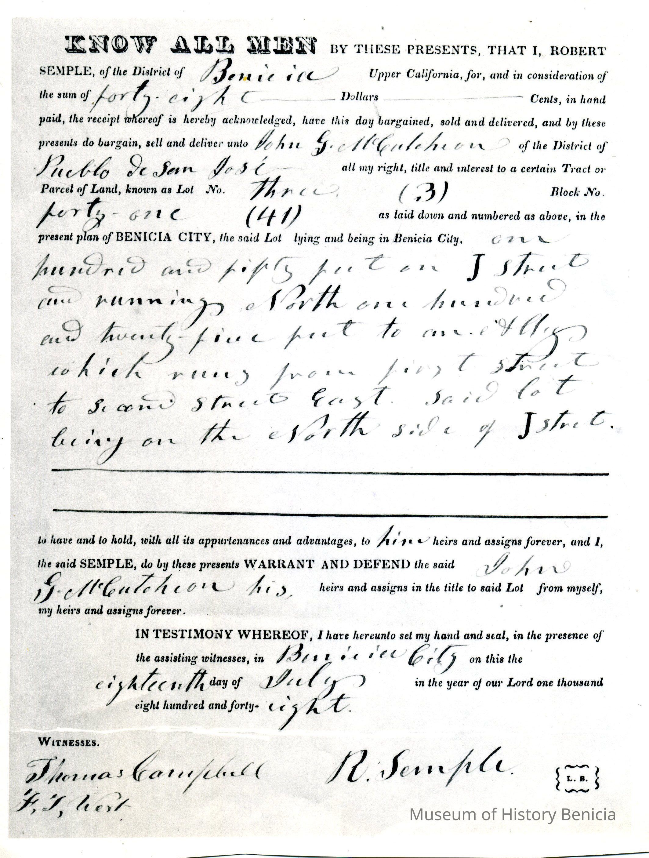This is included in a collection of letters and documents for a forthcoming book published in 1950. Mr Wohlgemuth was contributing chapters to a four volume history of Free Masonry in California which was published in 1950. He was researching Dr. Robert Semple and events of that era. The volumes are available for reference in the Benicia Public Library.Collection