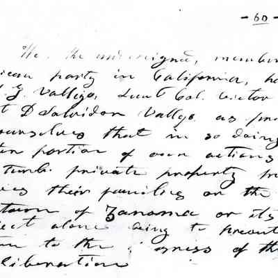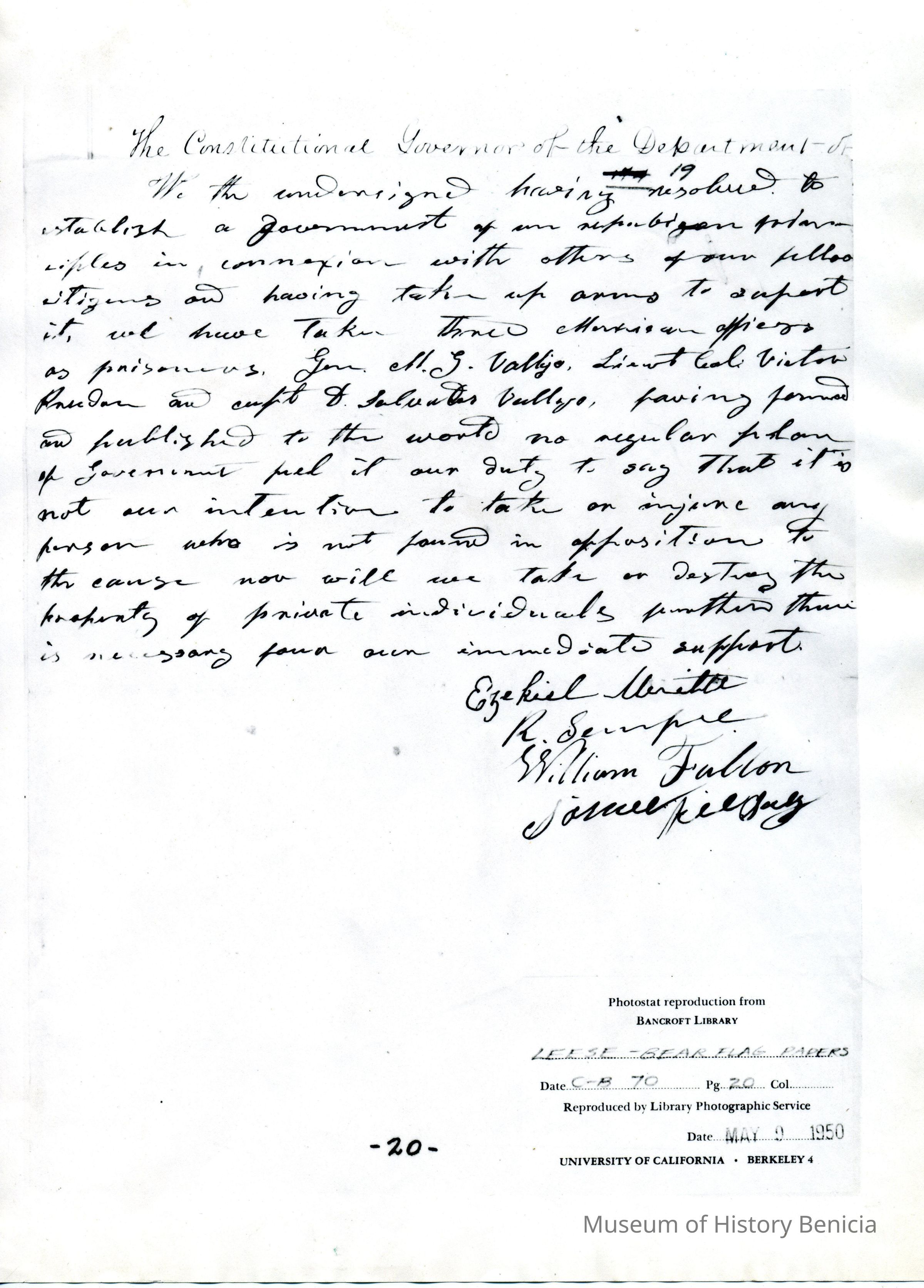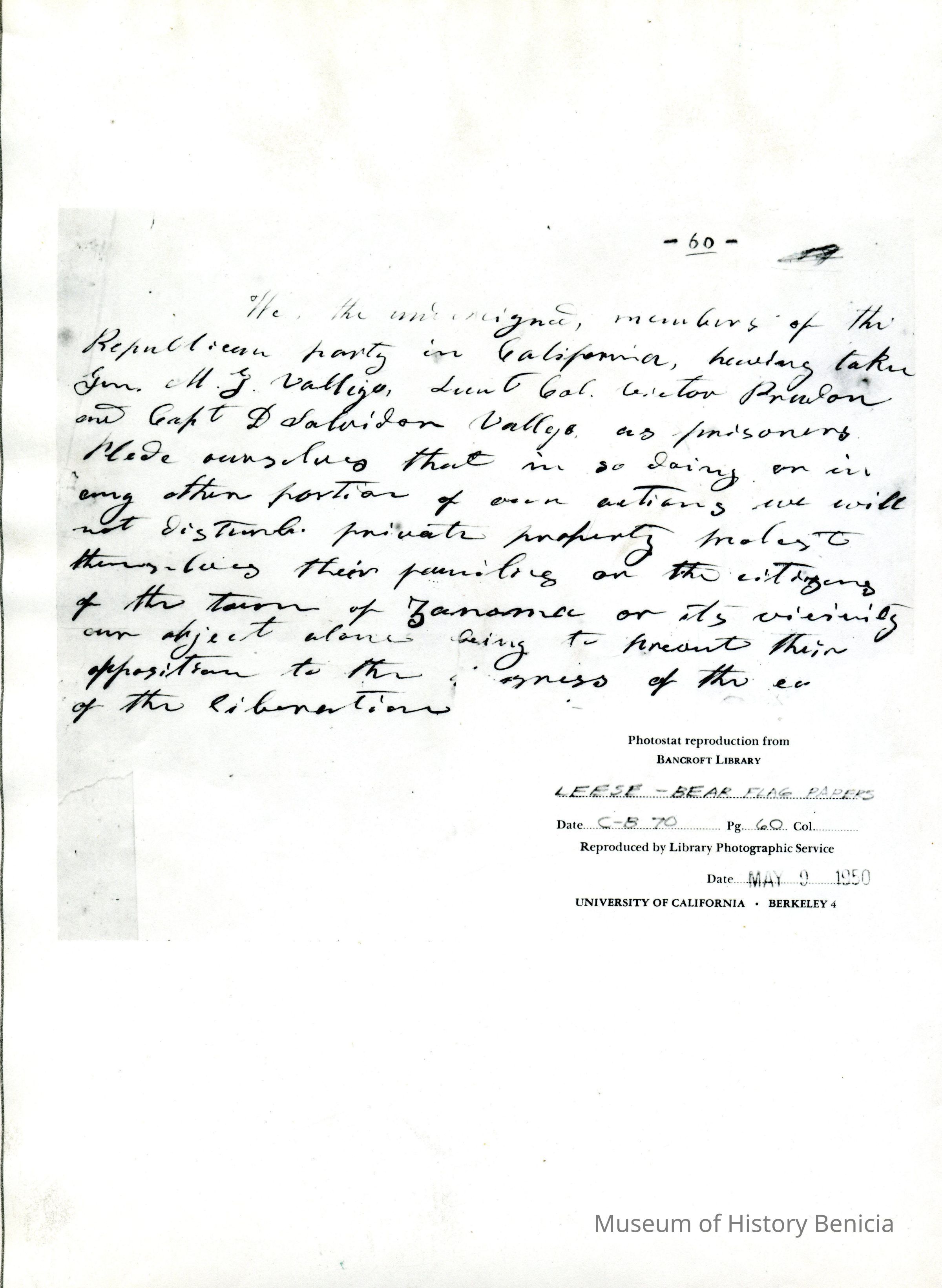 Two pages of copies of photostatic copies of documents from the Bancroft Library, University of California, Berkeley. The are from the 'Leese-Bear Flag Papers, date C-B 70, pages 20 & 60.