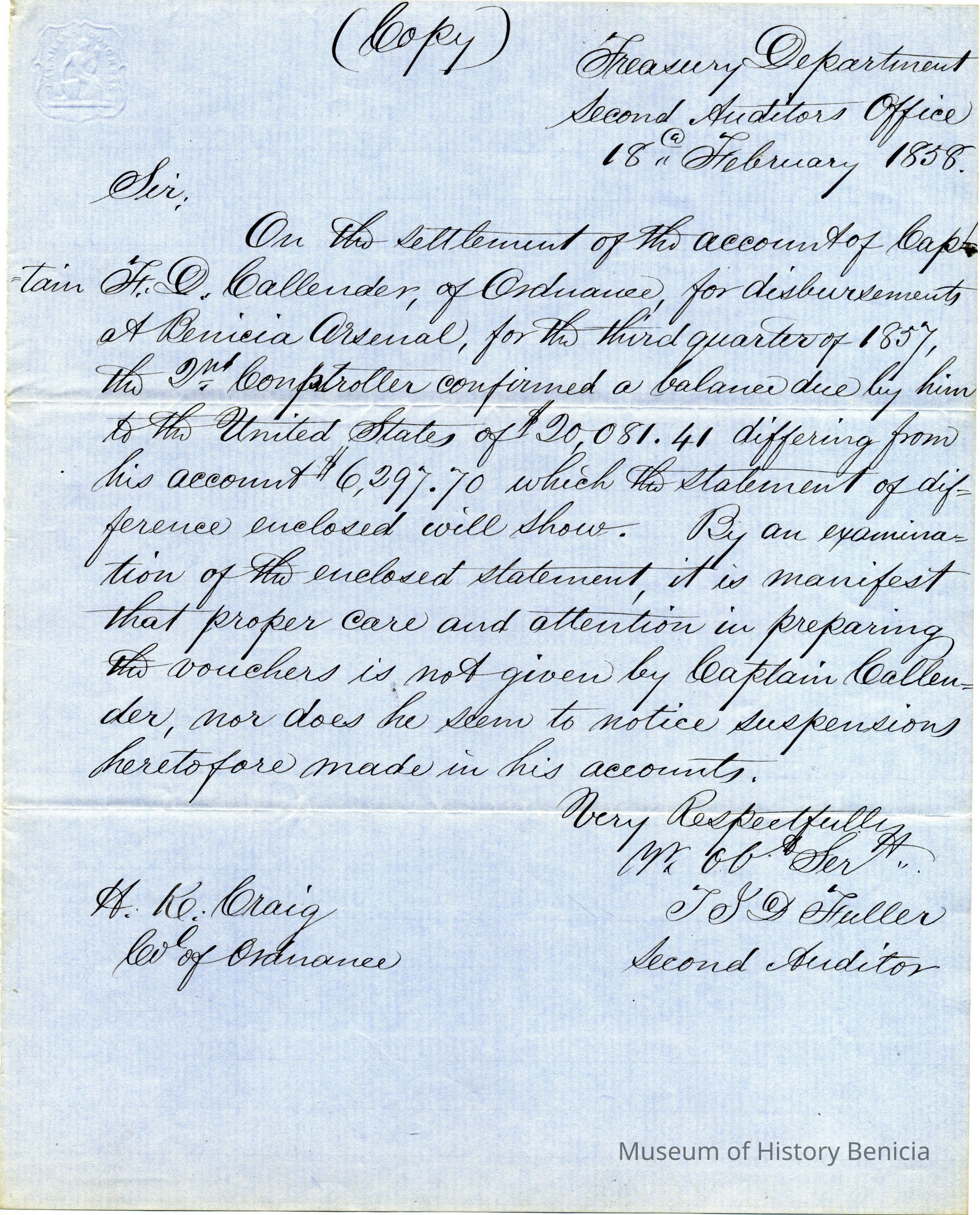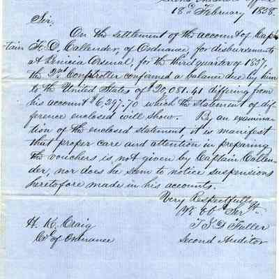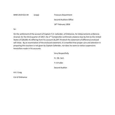This is a letter from an auditor, T.I.D. Fuller, at Treasury in Washington D.C. to the Colonel of Ordnance A.K. Craig. The auditor says that Captain Callender owes the U.S. Government $20,081.41 for unauthorized expenditures. We don't have the details of this decision or the final resolution.Collection