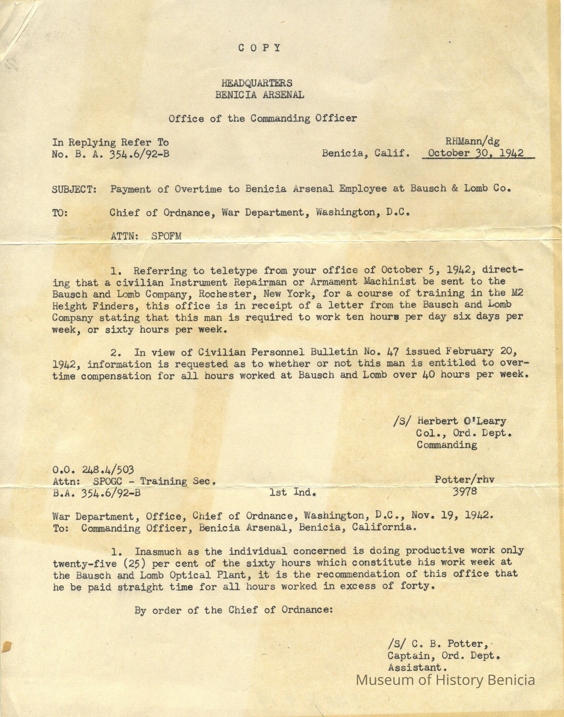 Letter - carbon copy, 8" x 10-1/2", From the Office of Benicia Arsenal Commanding Officer, Herbert O'Leary, regarding the payment of overtime to Benicia Arsenal Employee (R.J. Habeger) temporarily working at Bausch & Lomb Co. in New York. The letter is dated October 30, 1942. He could be required to work twn hours per day for six days per week. It was determined the employee would be paid straight time for all hours worked over forty, not the overtime rate.Collection