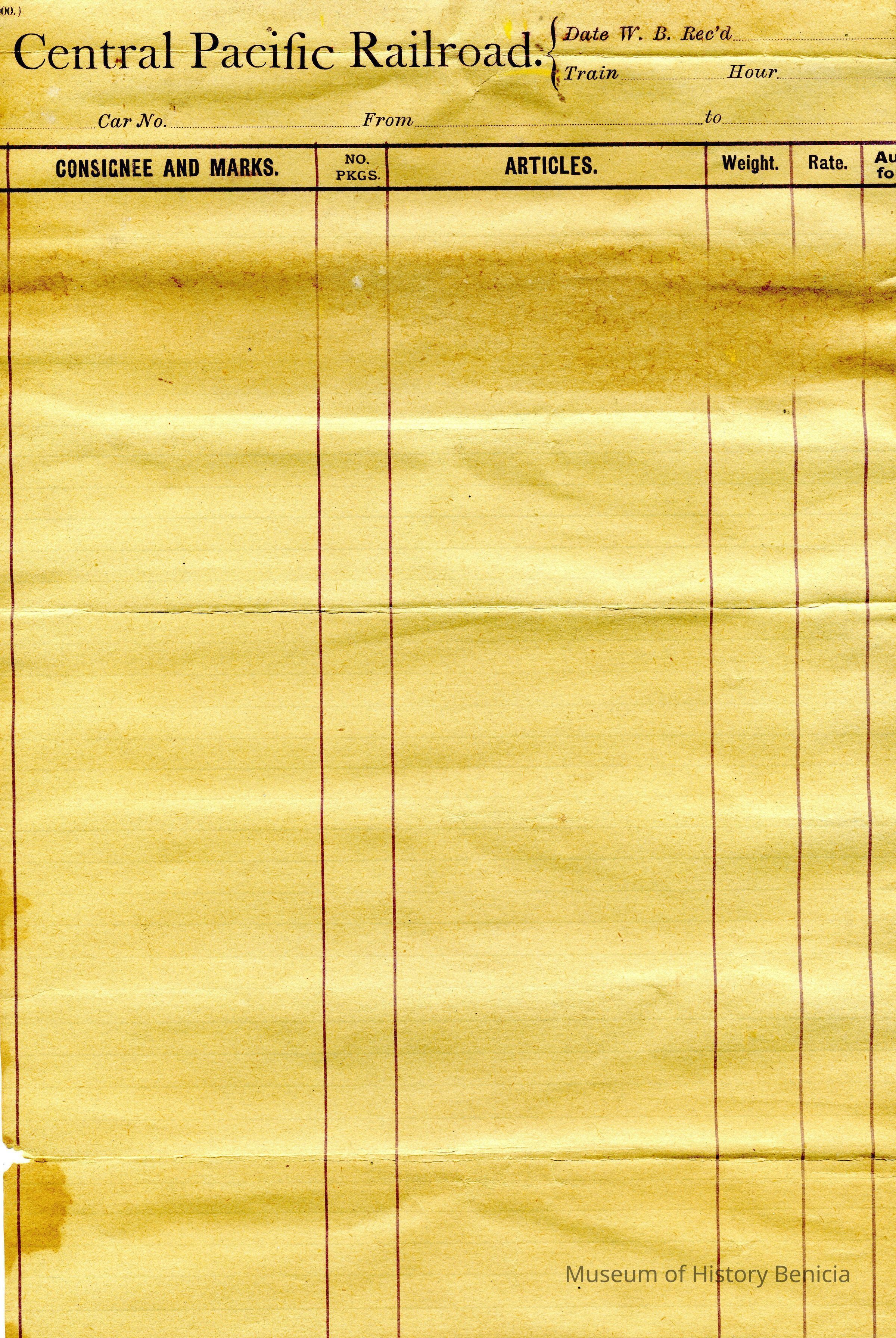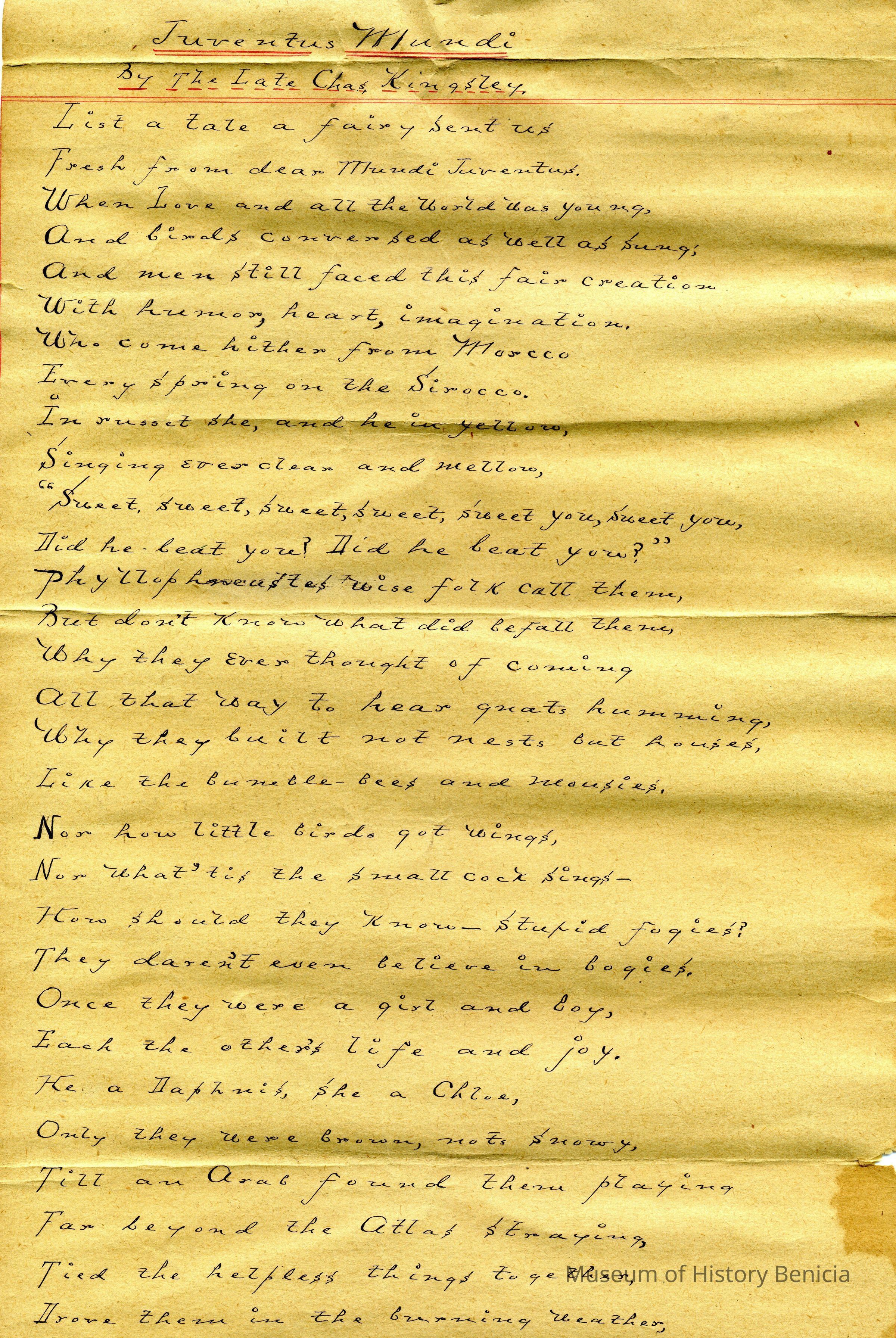 A poem written on the back of a blank Central Pacific Railroad packing list. The title is Juventus Mundi by the late Chas. Kingsley.