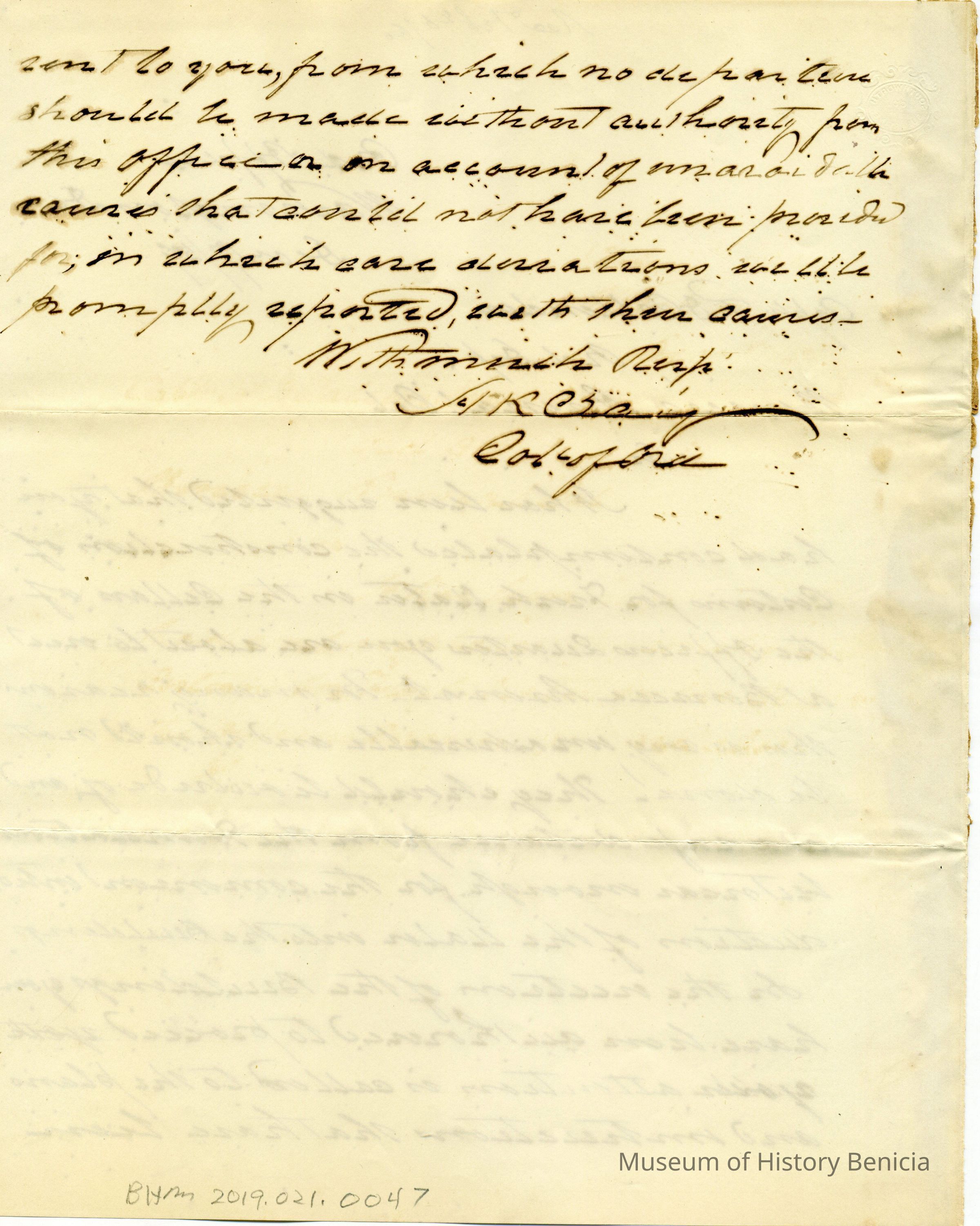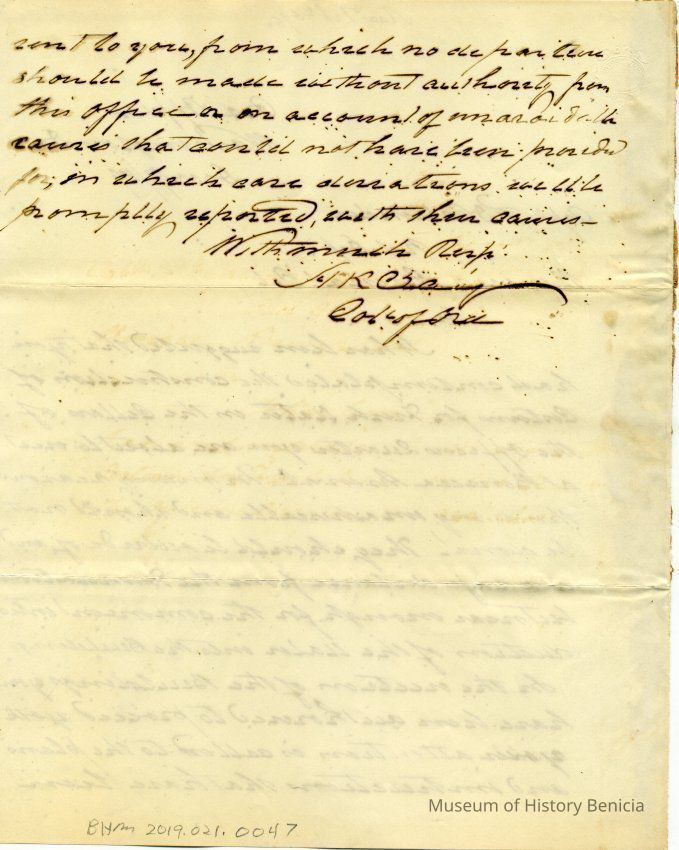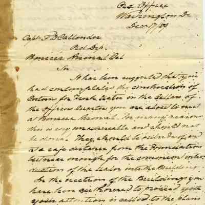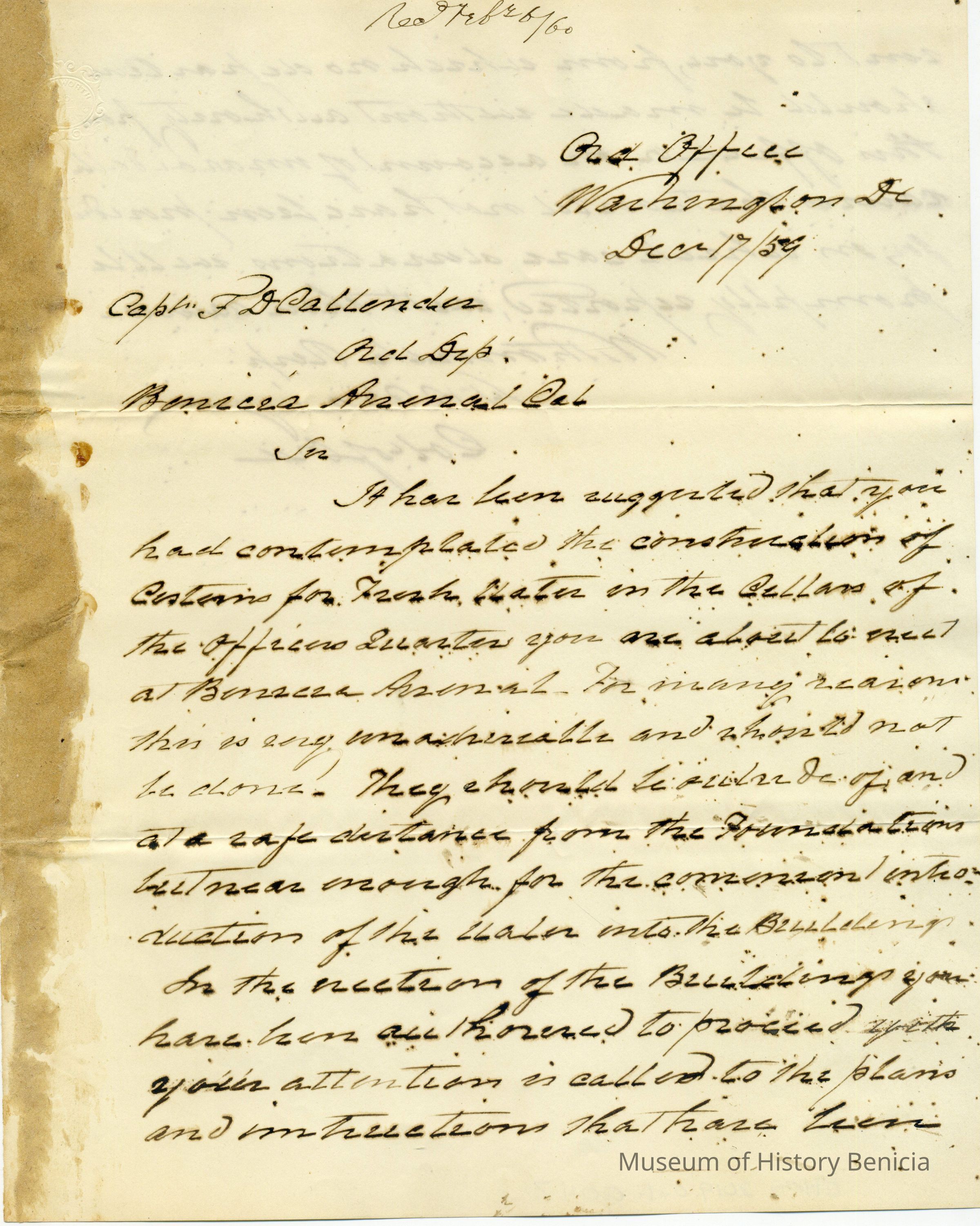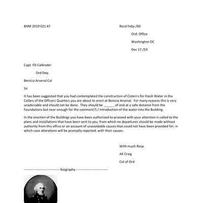 This is a letter from Colonel Craig, Colonel of Ordnance, to Captain Callender in Benicia. He is giving permission for Callender to build the Officer's Quarters but telling him not to put a cistern in the buildings.Collection