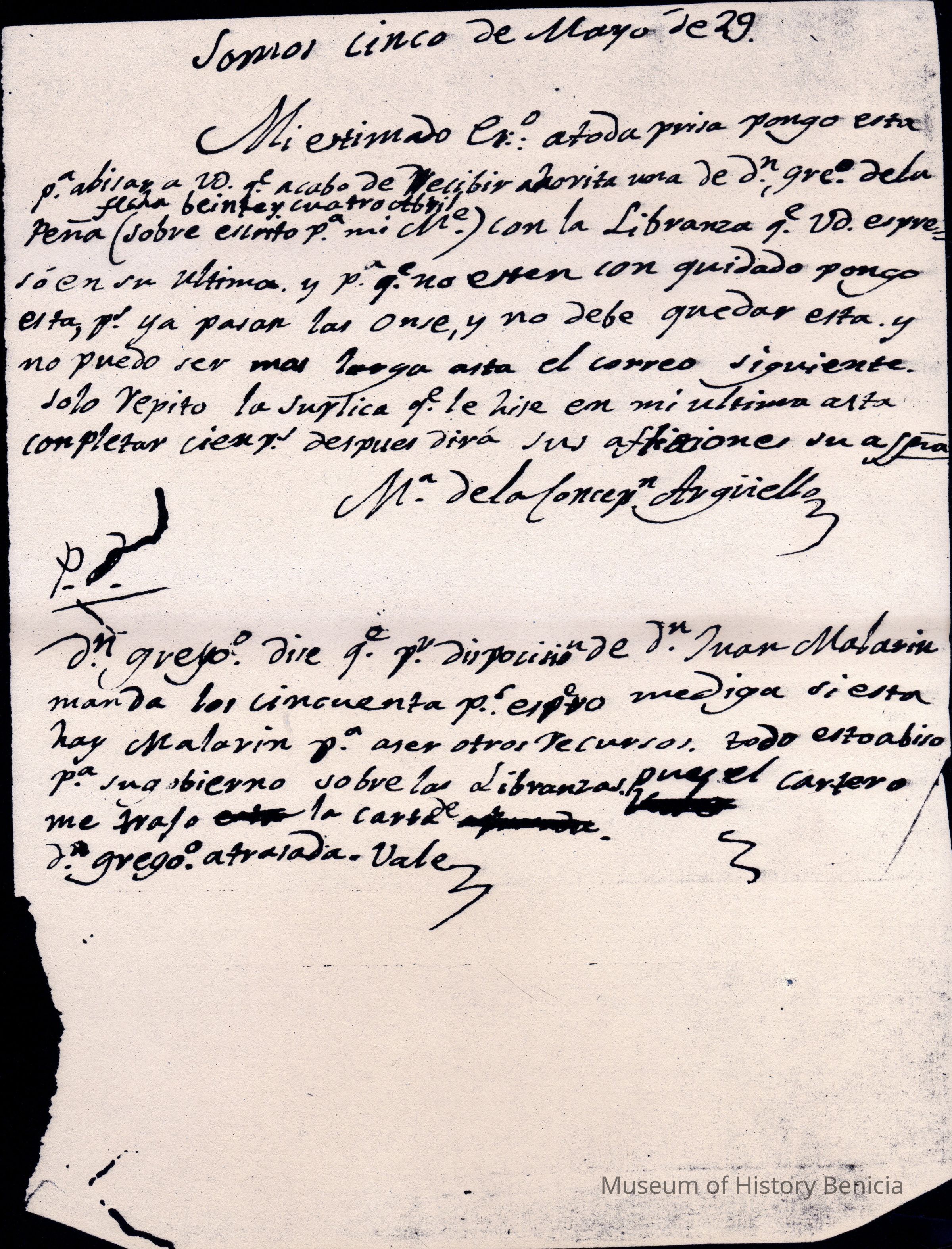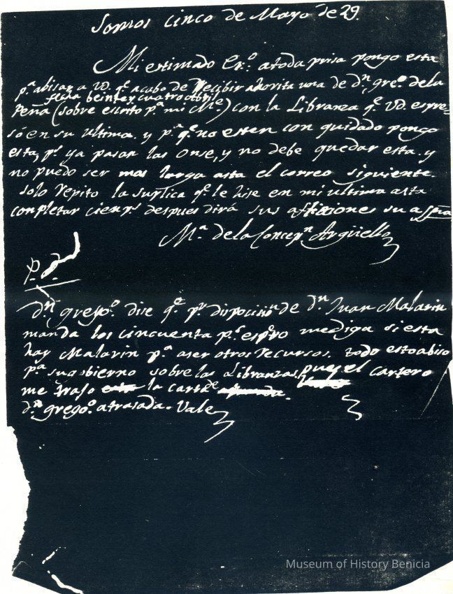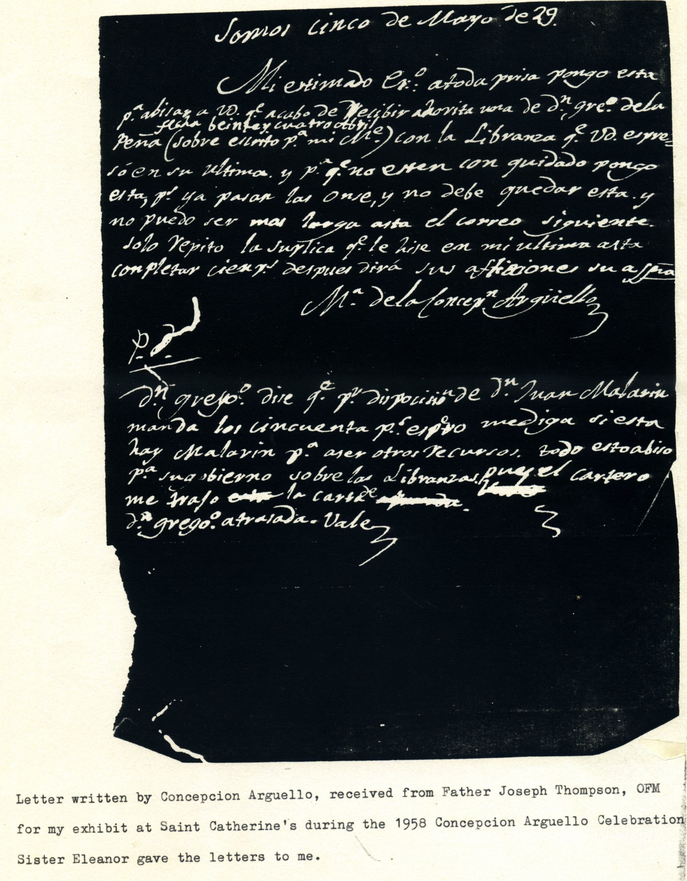 This is a copy of a letter written from Concepcion Arguello to Father Joseph Thompson, OFM. It was used in an exhibit at Saint Catherine's in 1958. It came from Sister Eleanor.Collection