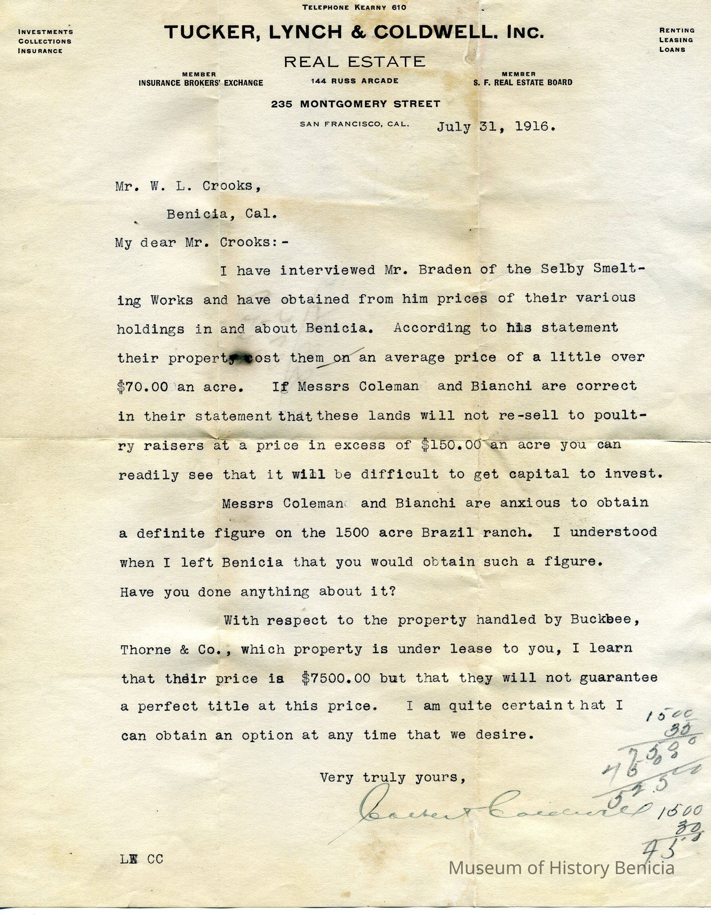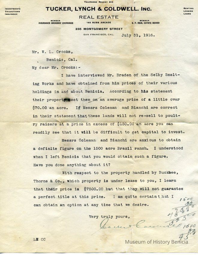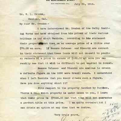 It is sent in regards to property held in Benicia by Mr. Braden of the Selby Smelting Works; also concern the price of 1500 acre Brazil Ranch. Mr. Coldwell is asking Mr. Crooks if he has done what was asked of him in regards to some real estate transactions.