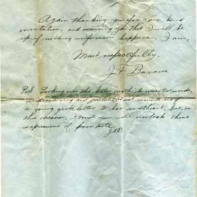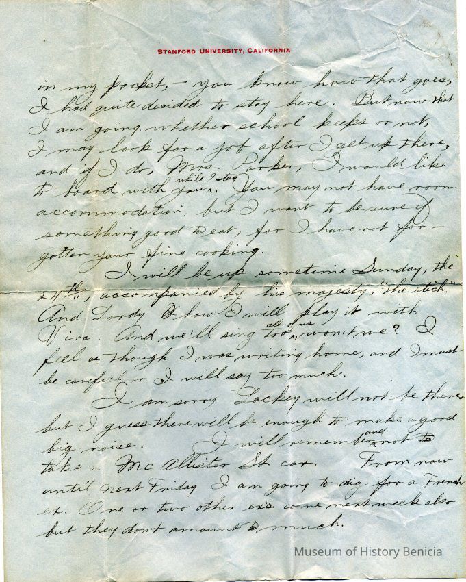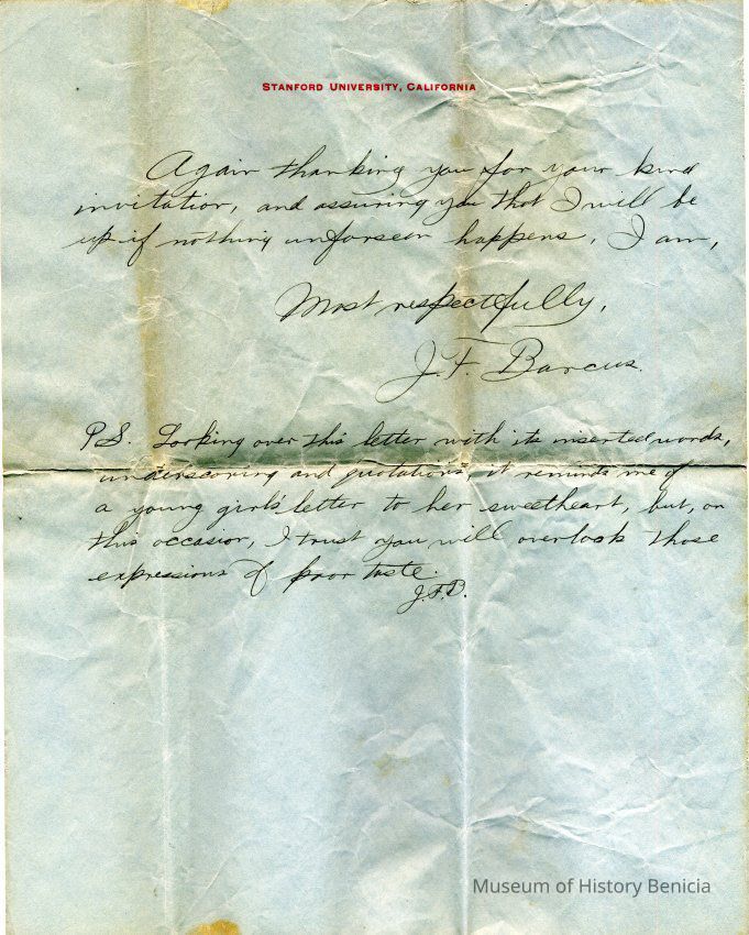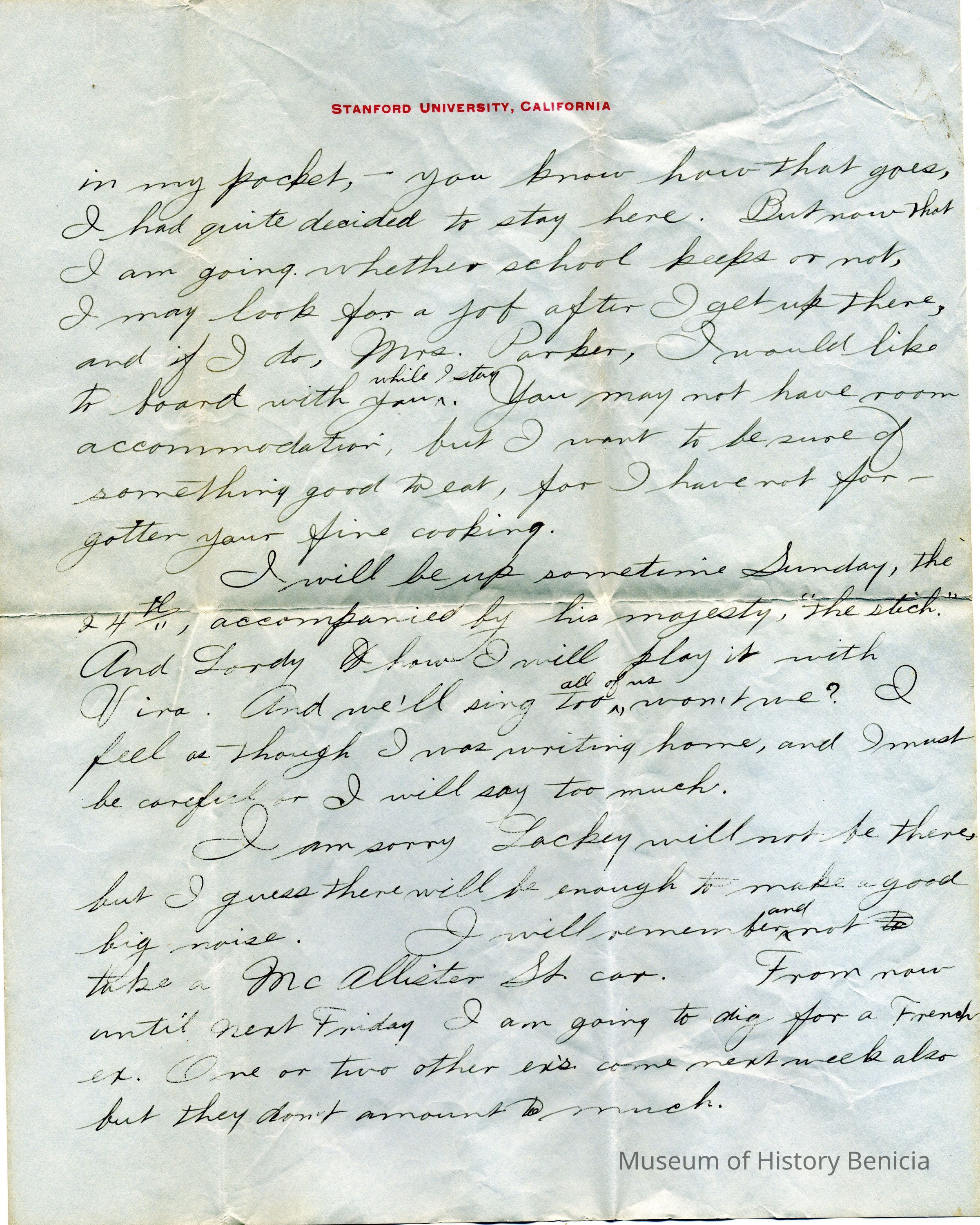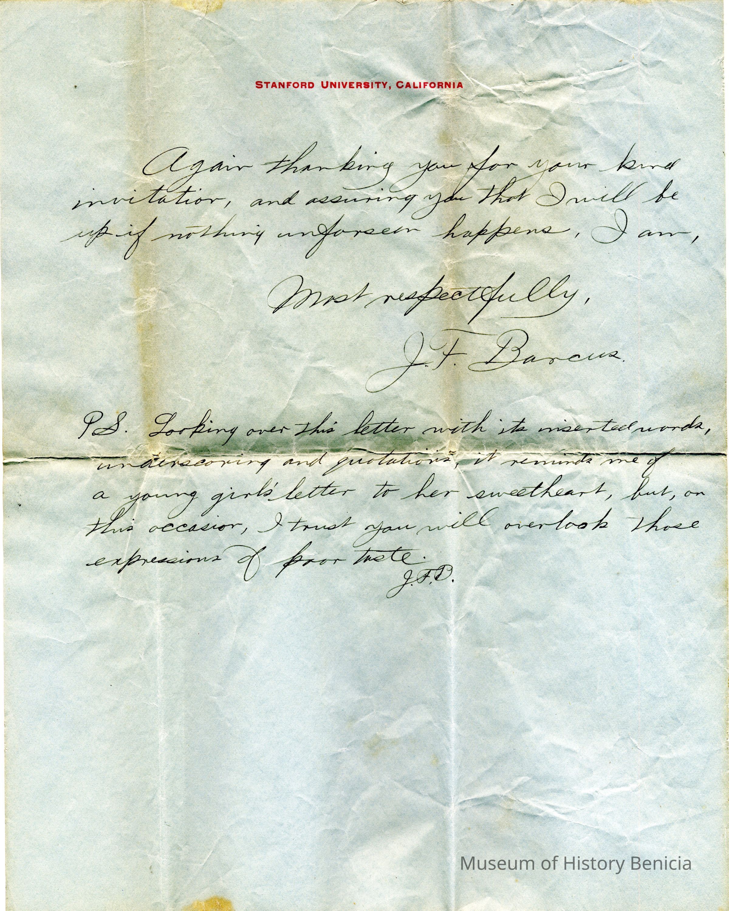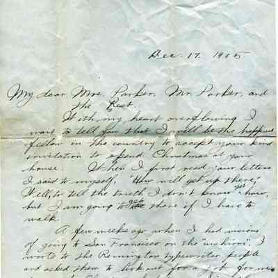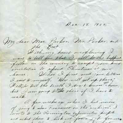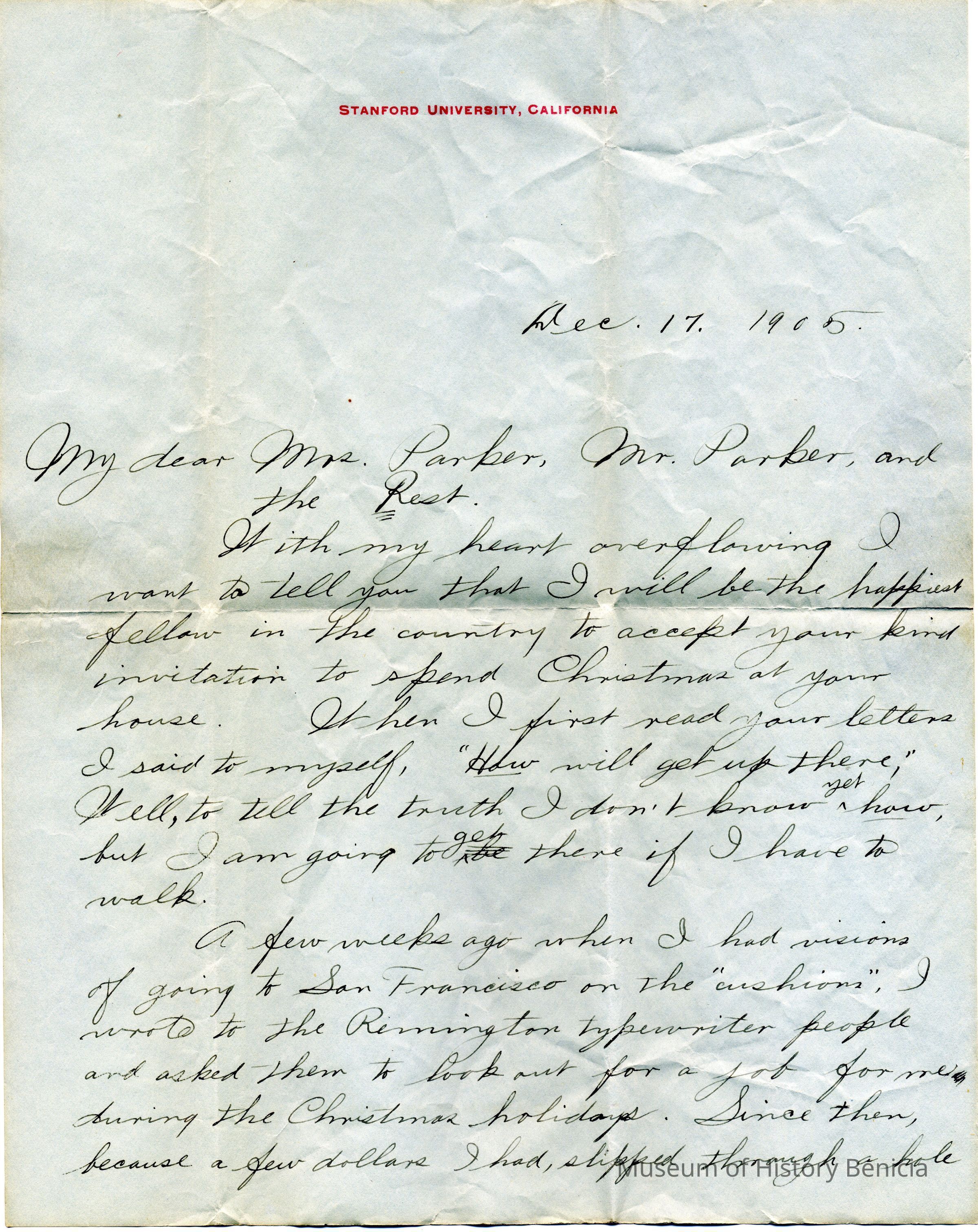A personal letter written on December 17, 1905 to Mr. & Mrs. Parker of Benicia from J.F. Barcus who was a student at Stanford at the time. The letter is written on Stanford letterhead paper. The letter concerns J.F. Barcus' plans for having Christmas with the Parker's in Benicia.Collection