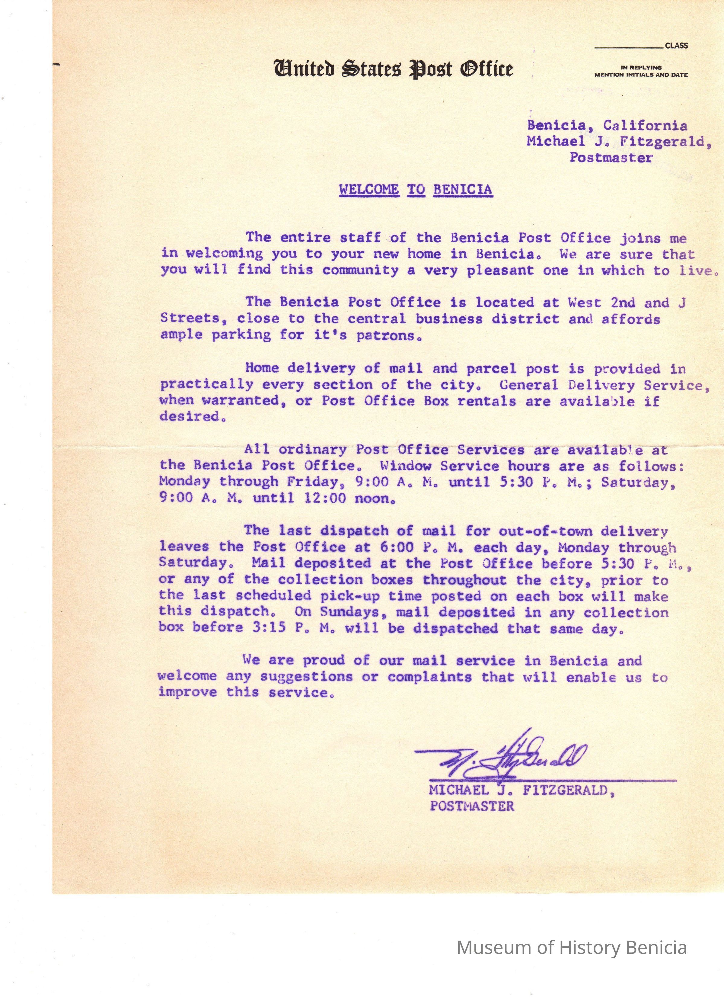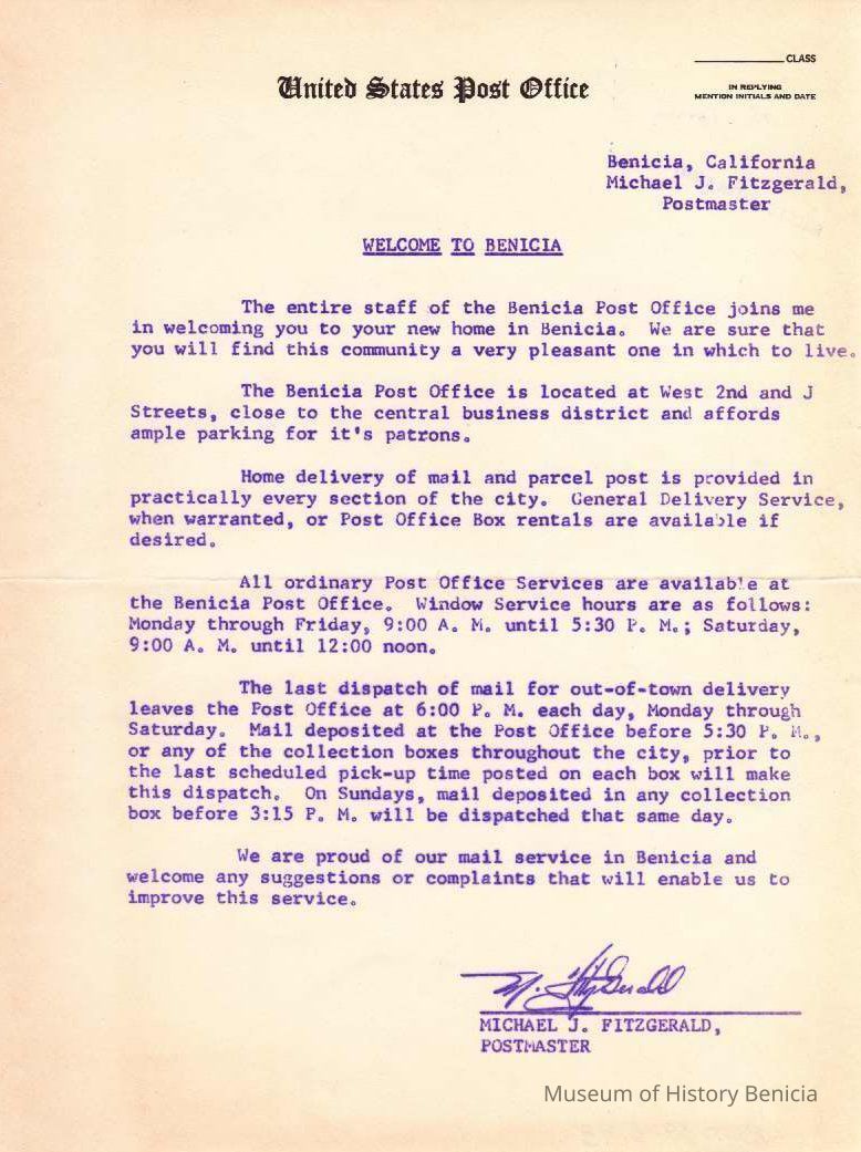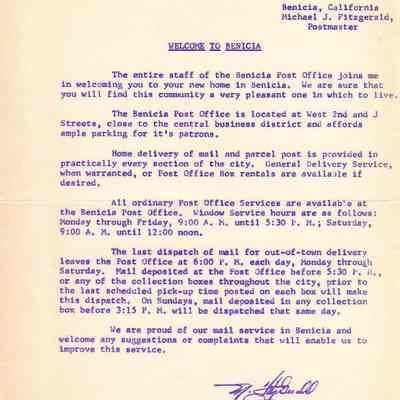 "Welcome to Benicia" - describes postal srvice in Benicia to new Benicia residents