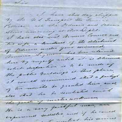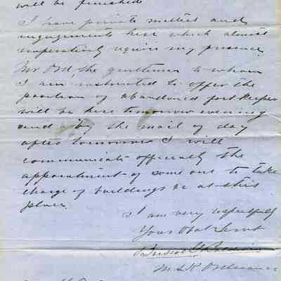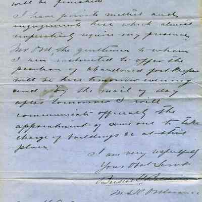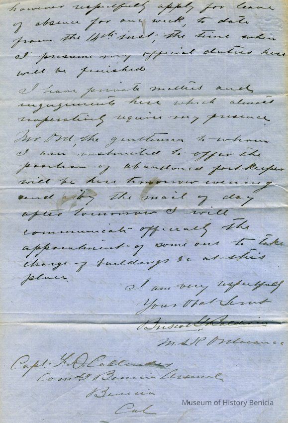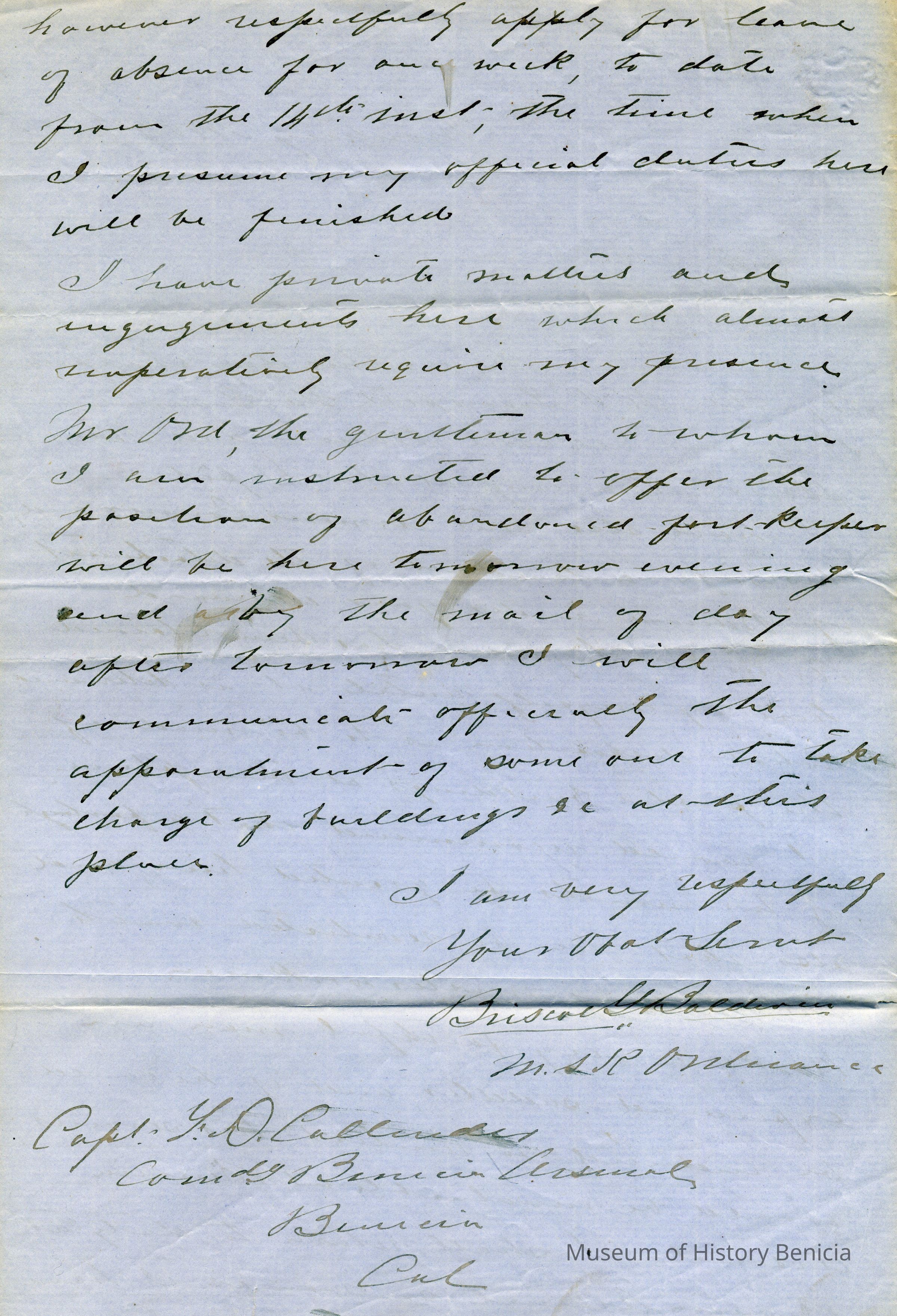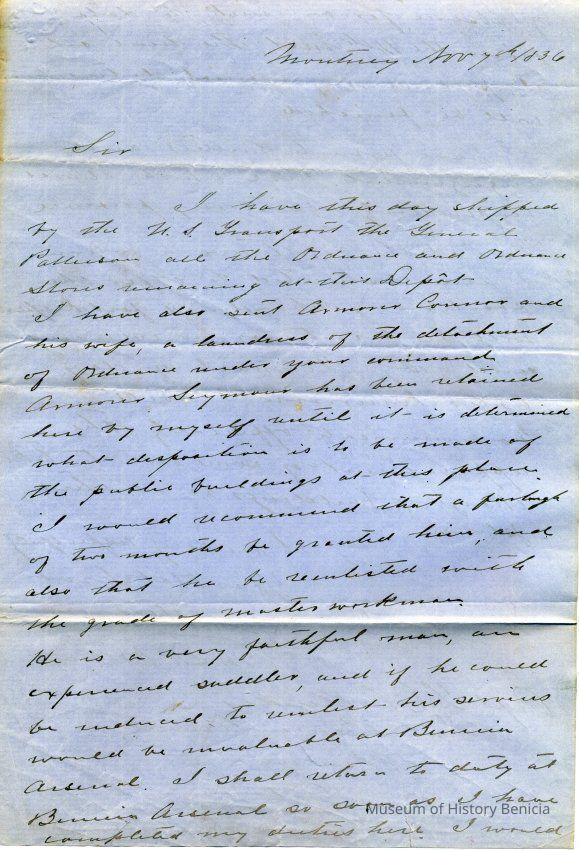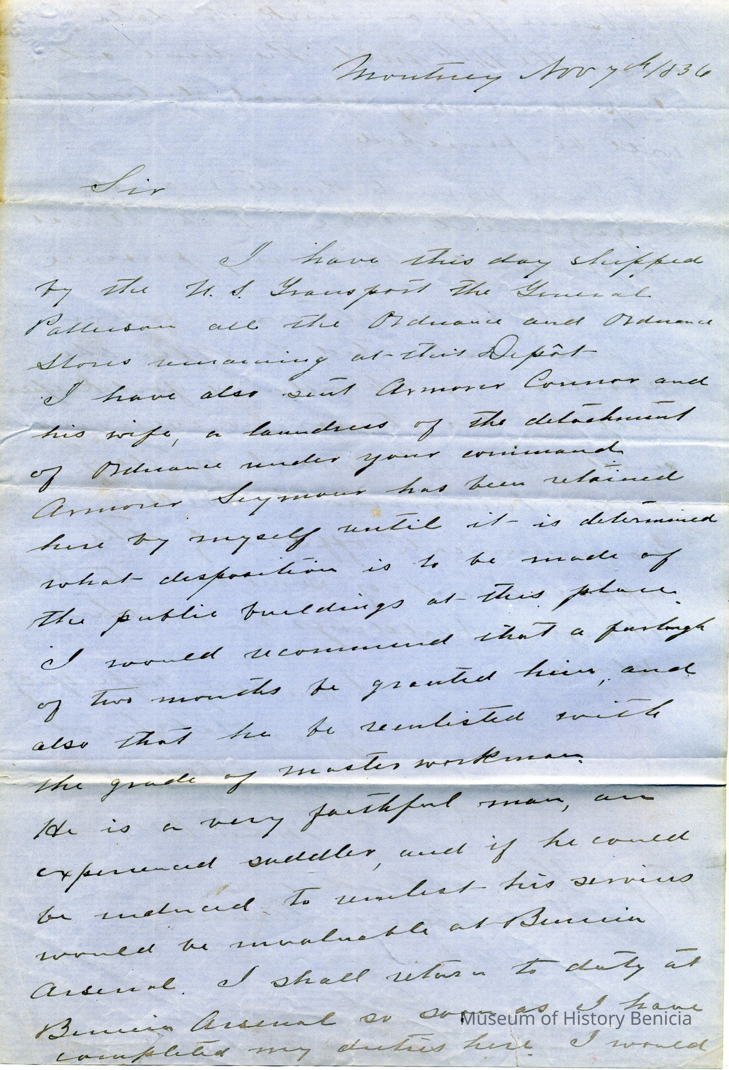 This is a letter from Briscoe Baldwin in Monterey to Captain Callender in Benicia regarding the closing of the Monterey Ordnace Depot. He mentions the changes in personnel and the fact that he is waiting for Mr. Ord who will be the post keeper of the abandoned base.Collection