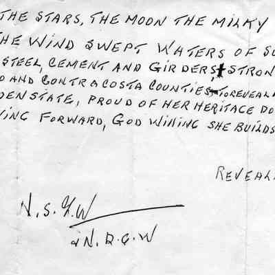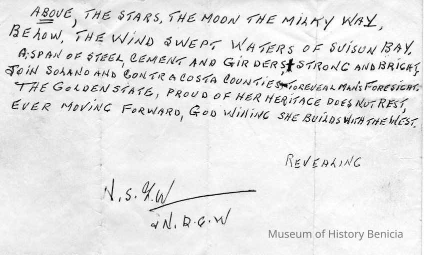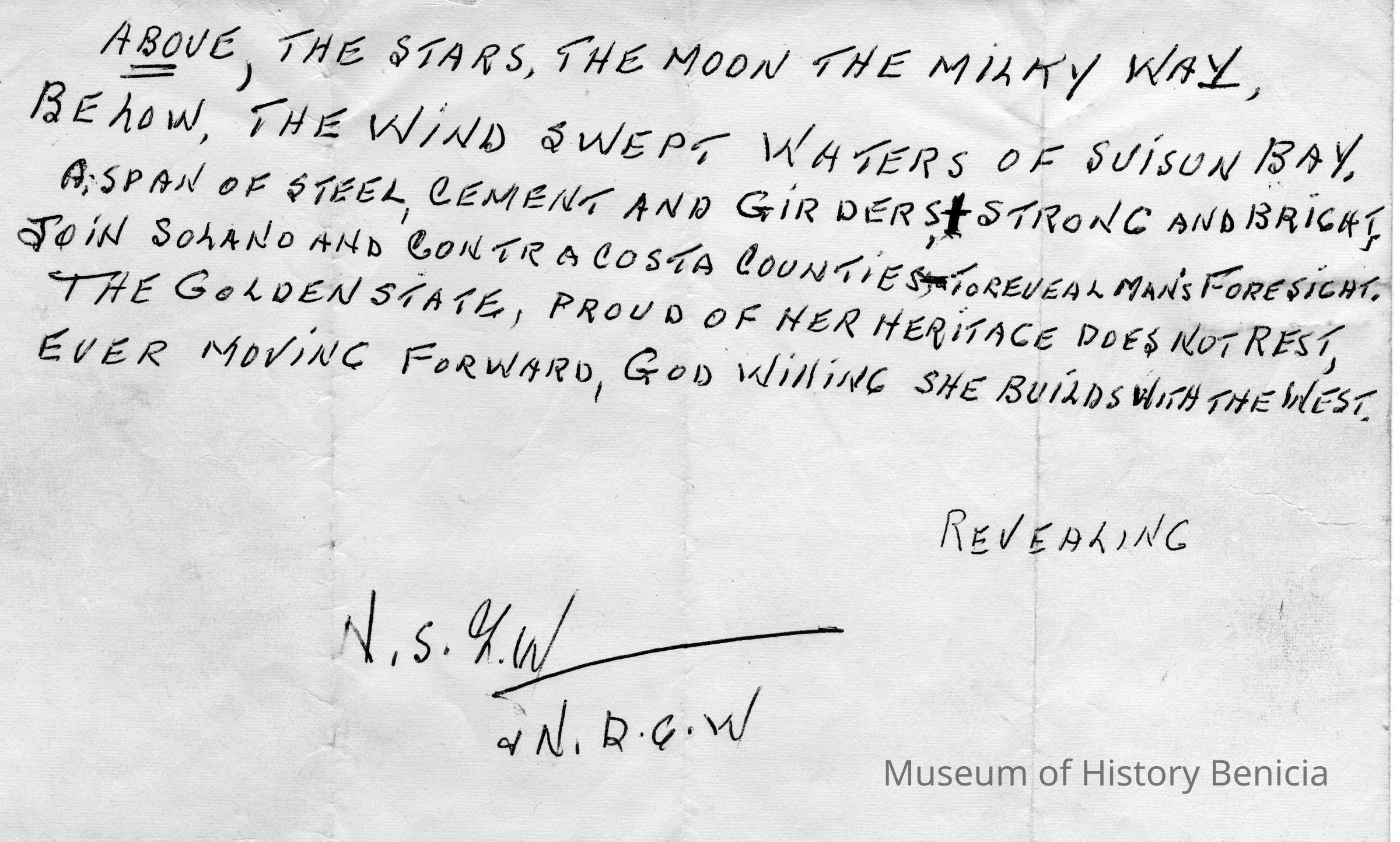 Notes on a poem about Solano county and the bridges across the Carquinez Straits. It says N.S.G.W / N.D.G.W on the bottom. I assume this is Native Sons / Daughters of the Golden West.
