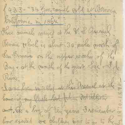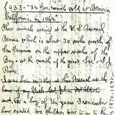 I was born in 1861 at this Arsenal at the home of my uncle Col. Julian McAllister. As a boy of ten years I remember how excited we children were to go to the corral and sit on the fence and see these great camels with their rough and shaggy coats and contentedly chewing their cuds. They were all sold to circuses and gone by 1870-1871."