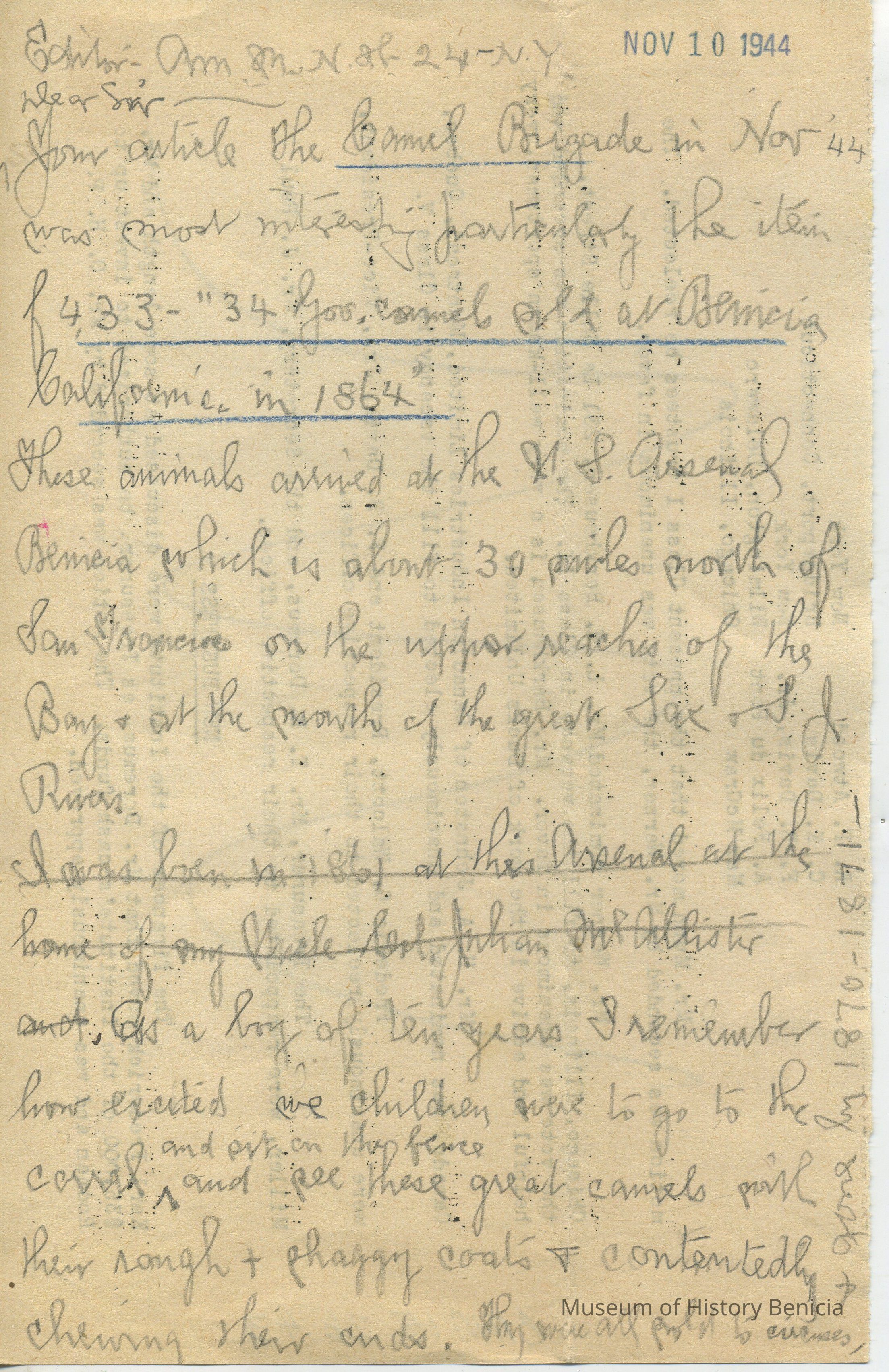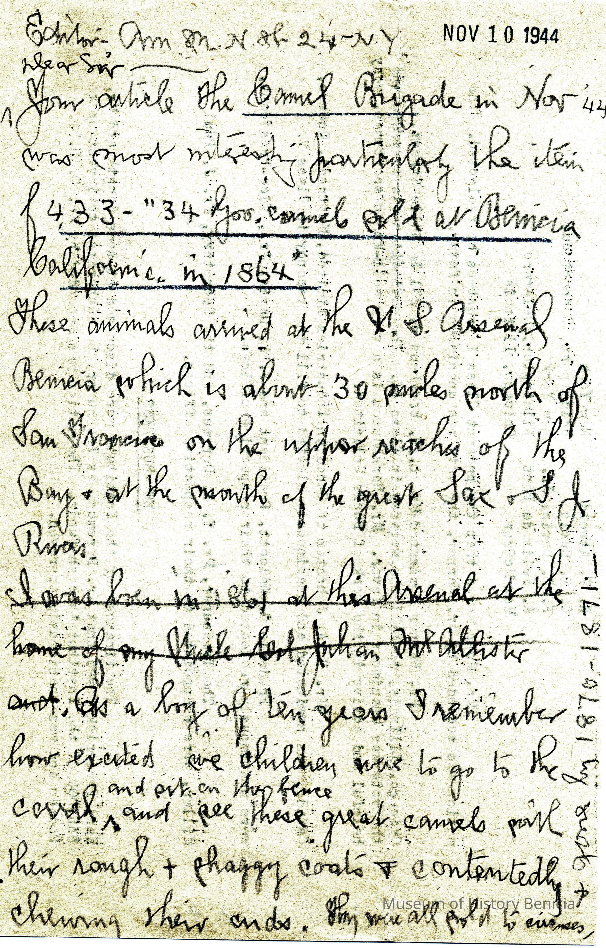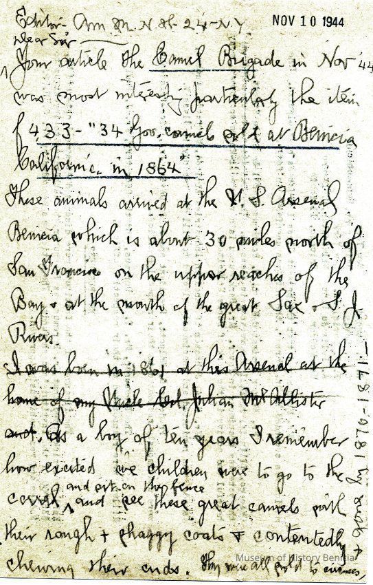 Your article The Camel Brigade in Nov, 44 was most interesting particularly the item 433 - "34 gov. camels sold at Benicia California in 1864"