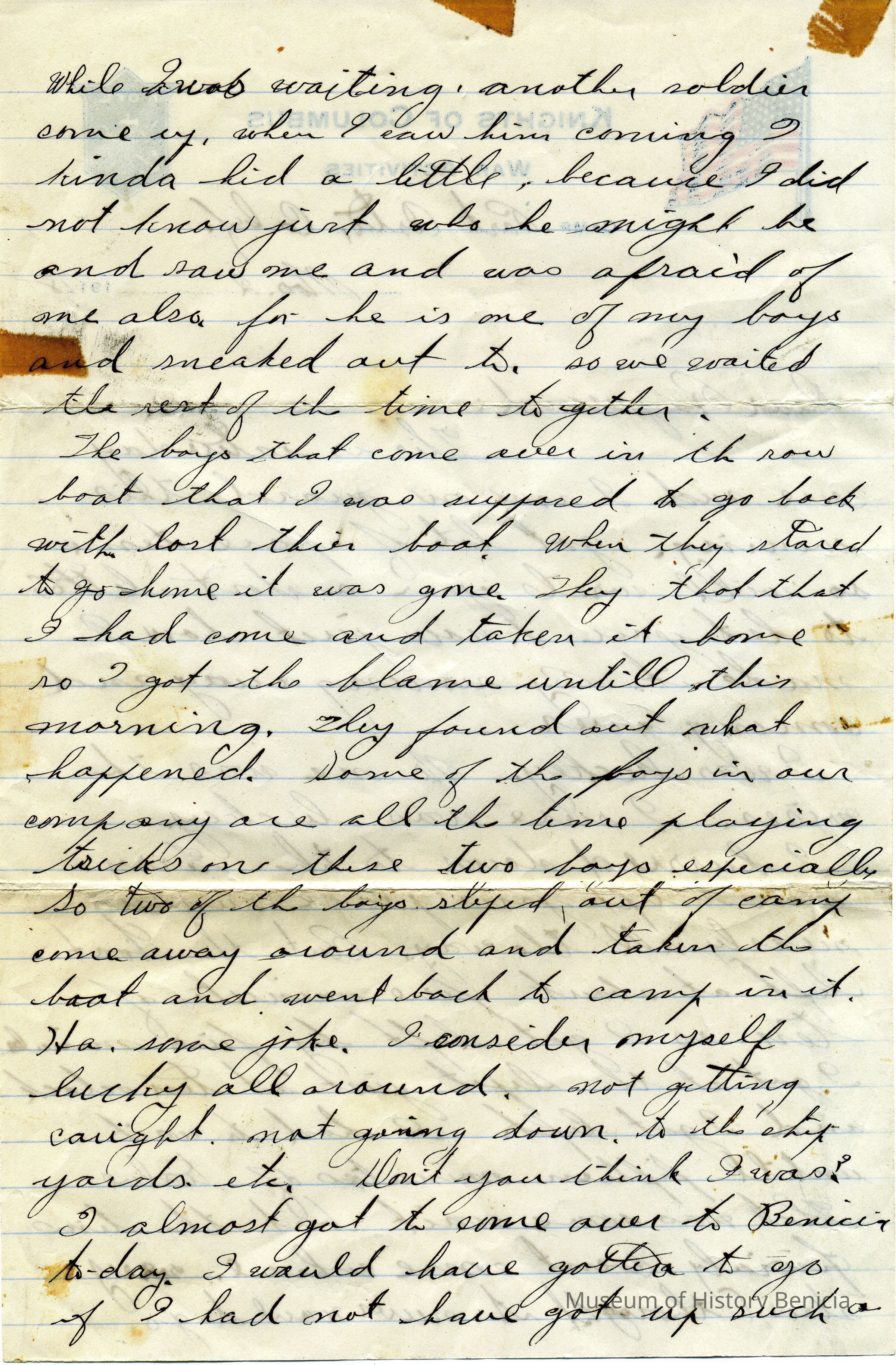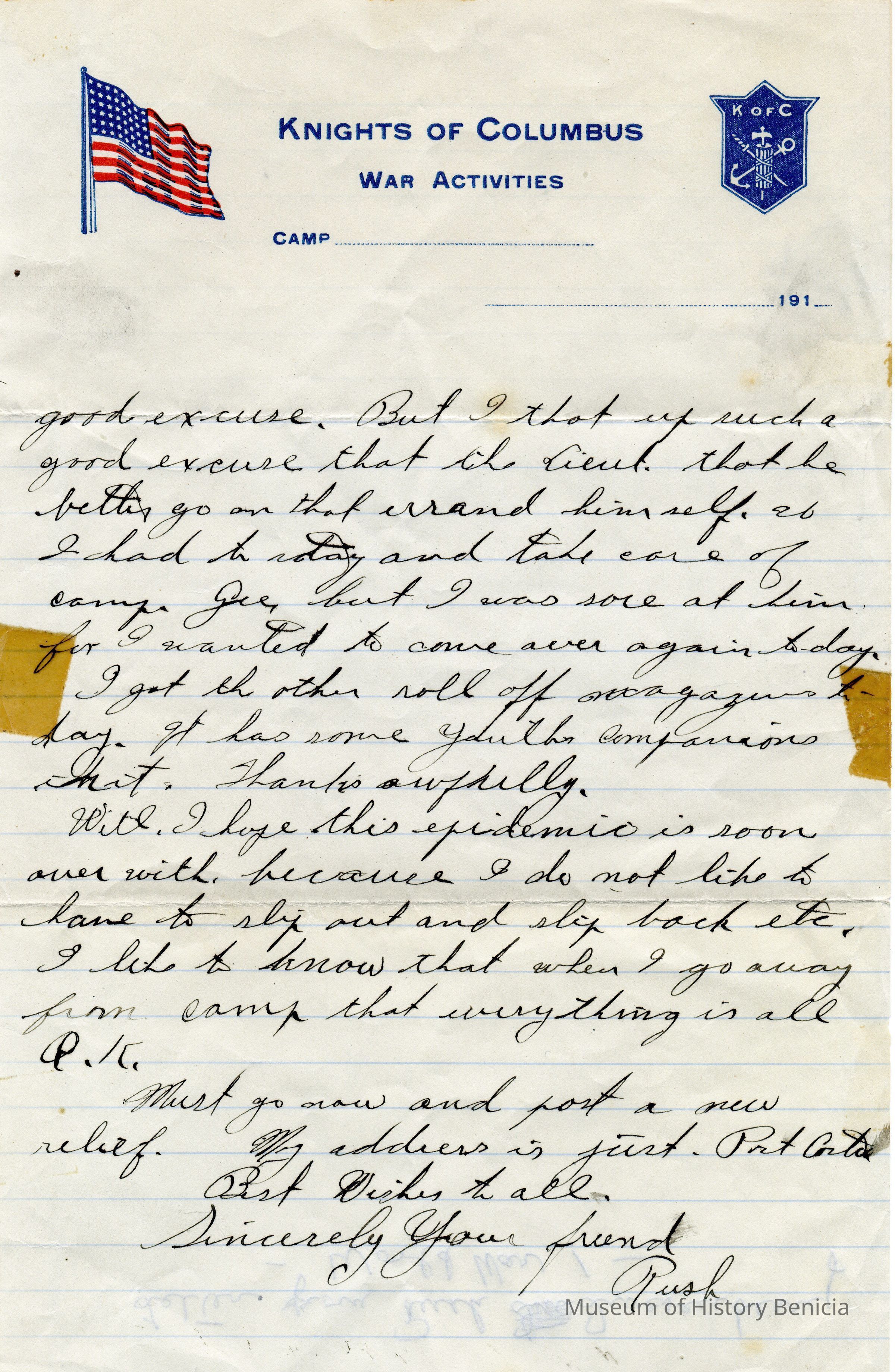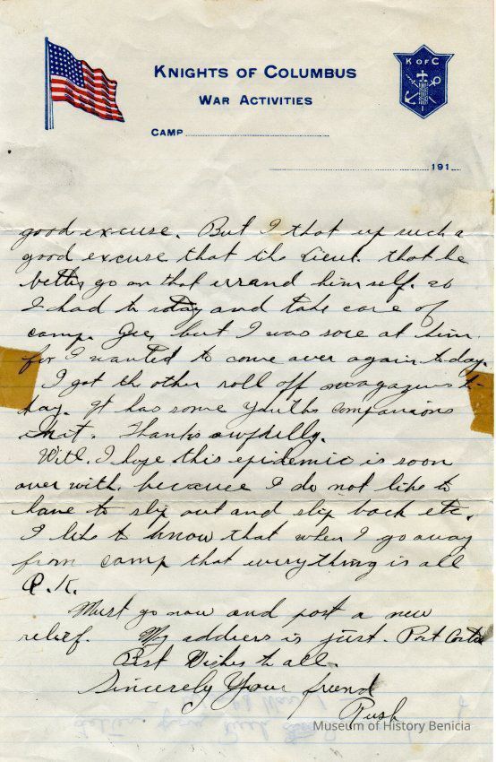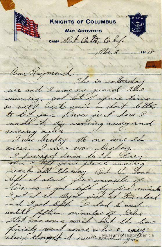 This is letter from a man named Rush who is stationed in Port Costa to his friend in Benicia, Raymond. (This may be Raymond Rankin since the bulk of items in this donation are from the Rankin family.). It is written on Knights of Columbus stationary.