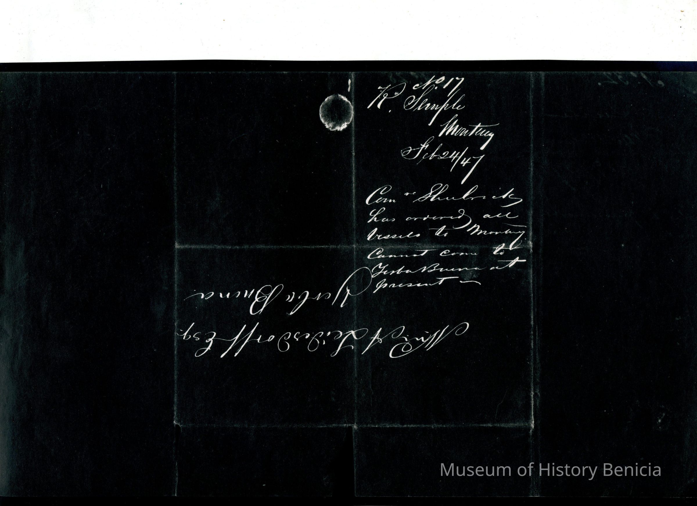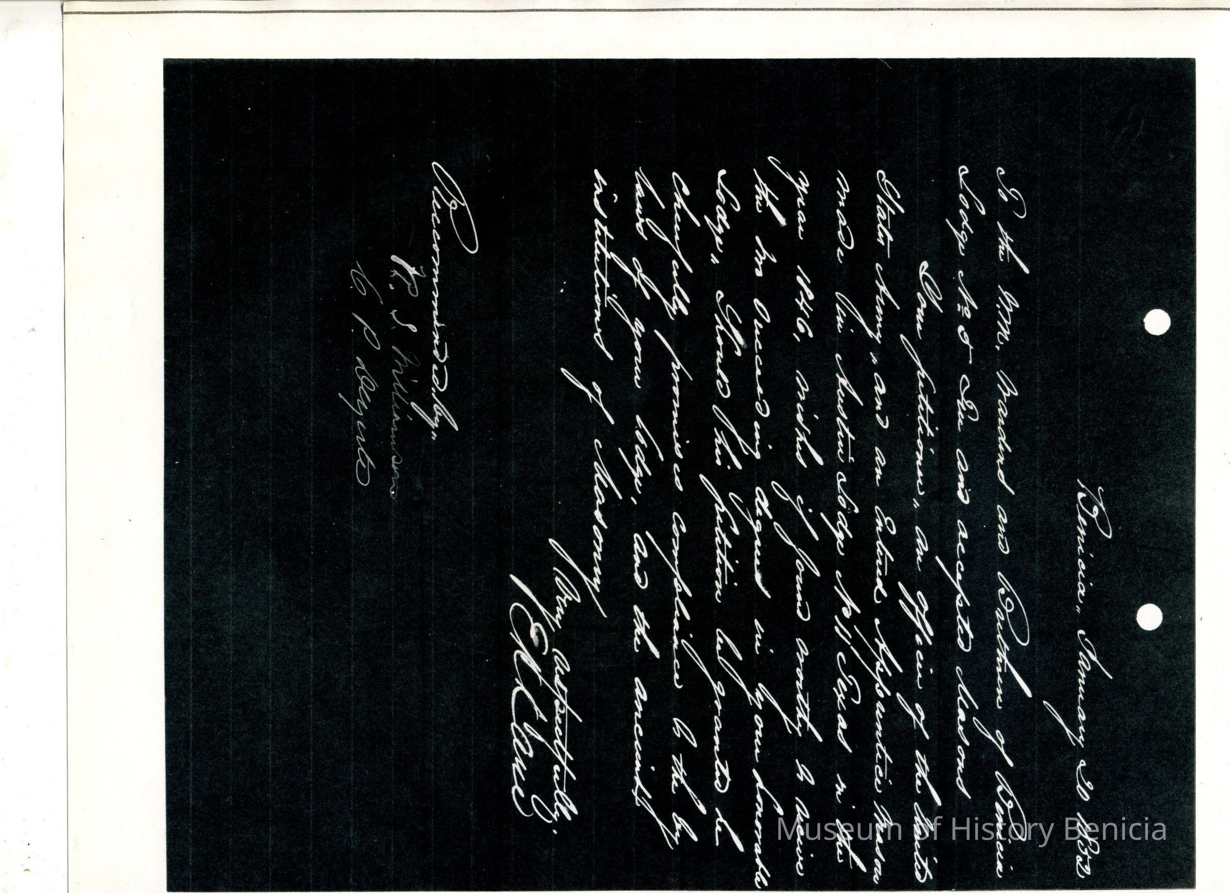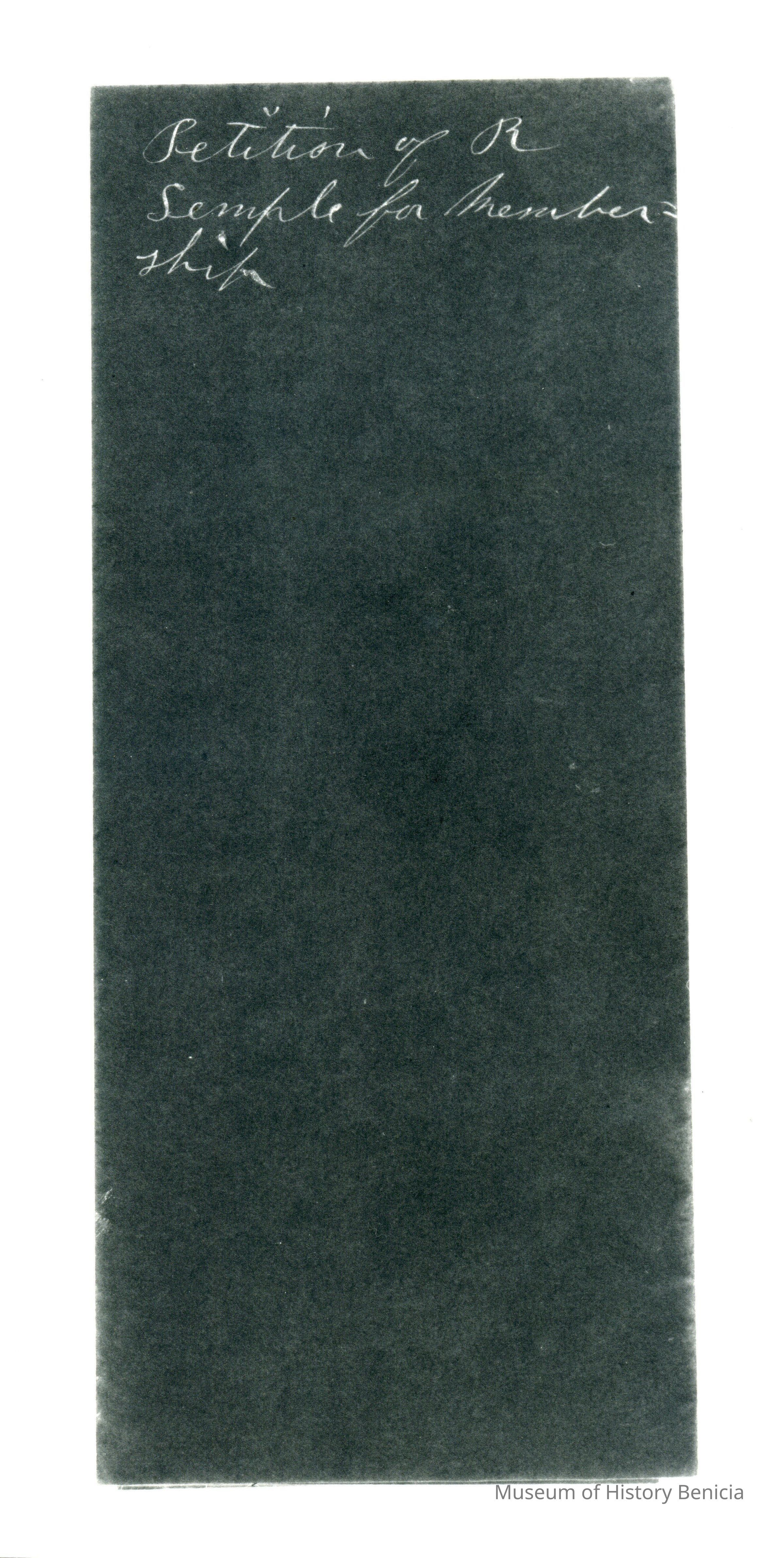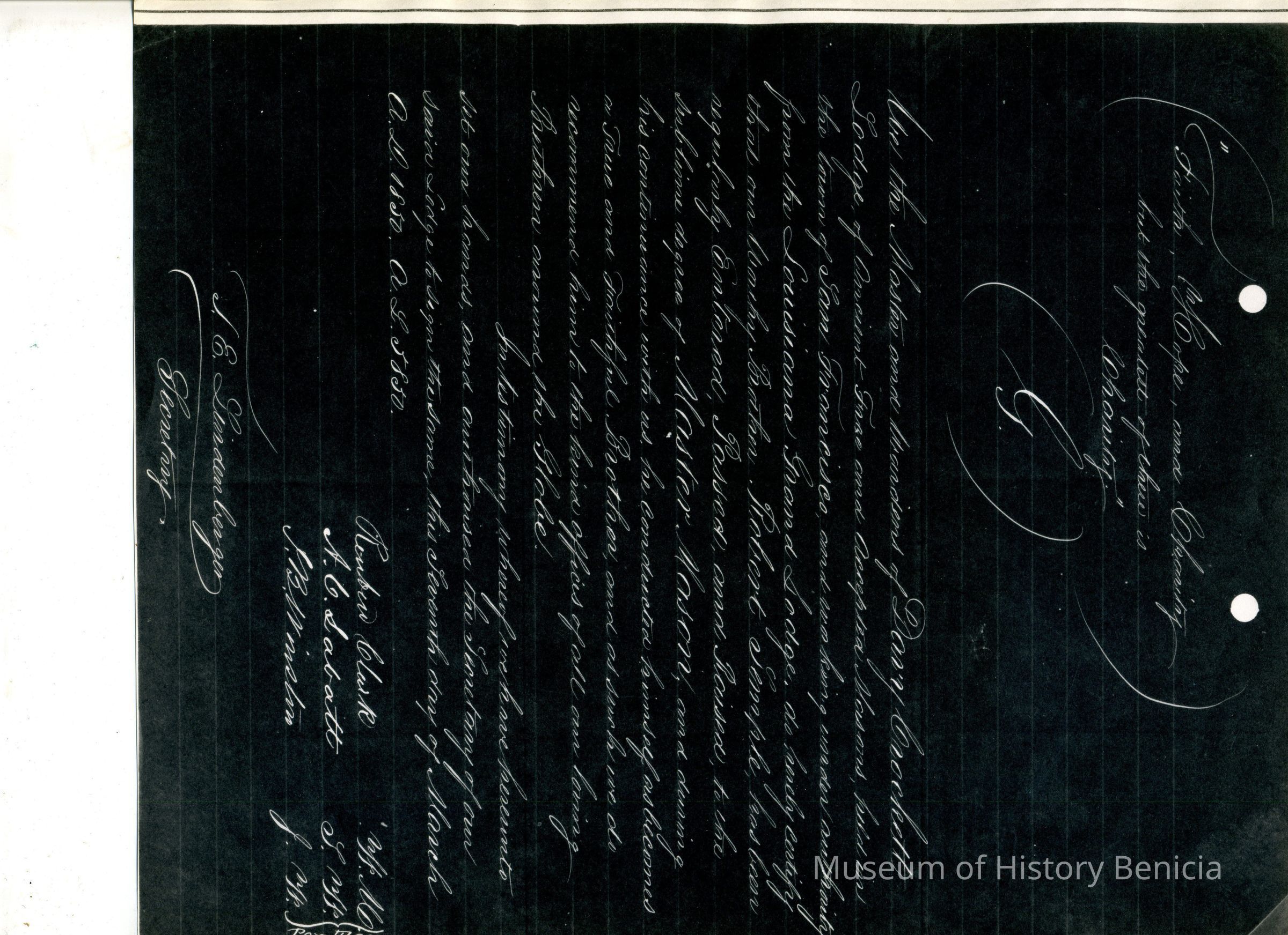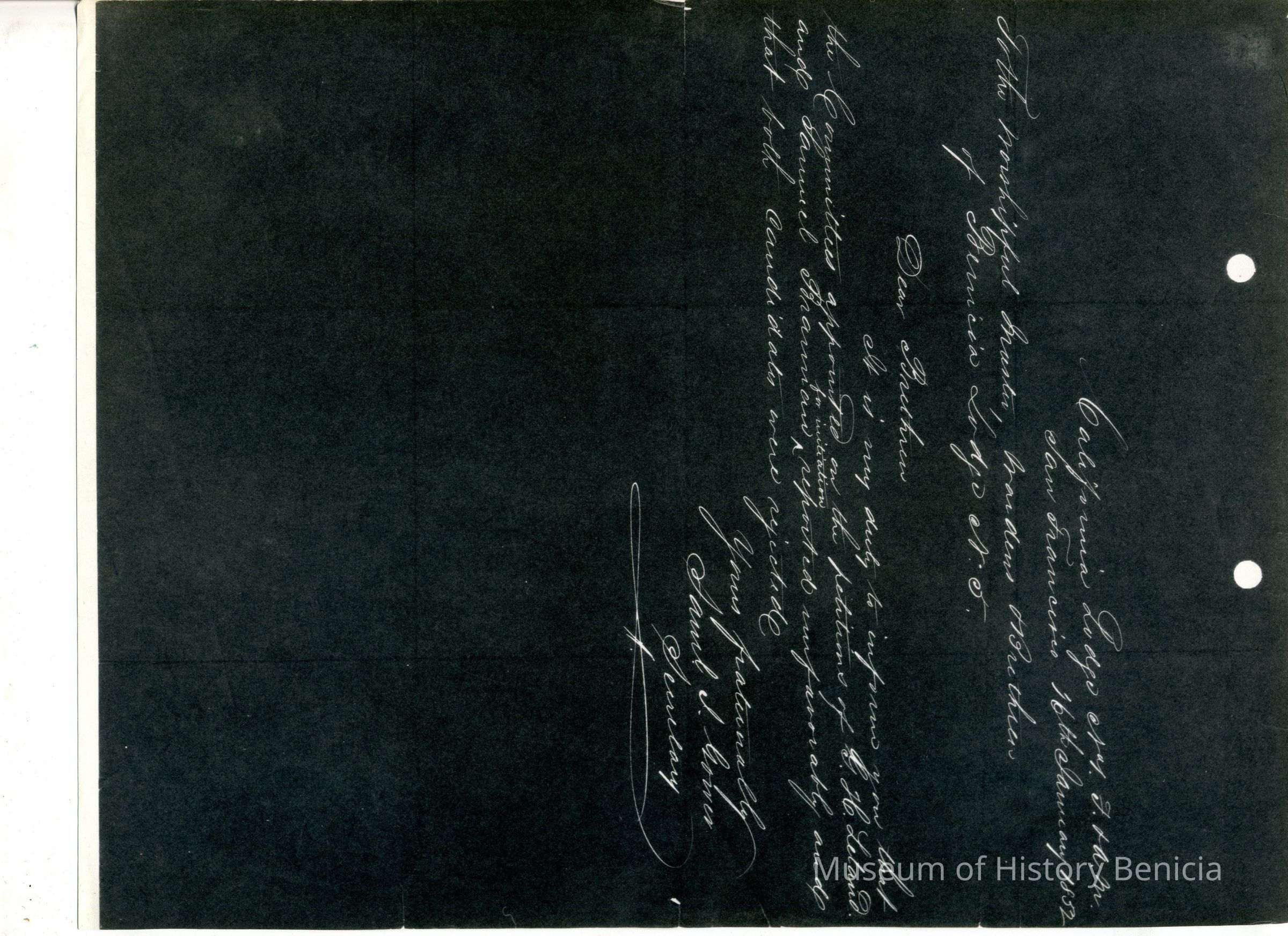 This is included in a collection of letters and documents for a forthcoming book published in 1950. Mr Wohlgemuth was contributing chapters to a four volume history of Free Masonry in California which was published in 1950. He was researching Dr. Robert Semple and events of that era. The volumes are available for reference in the Benicia Public Library.Collection