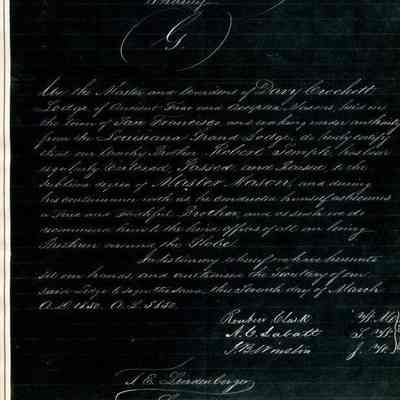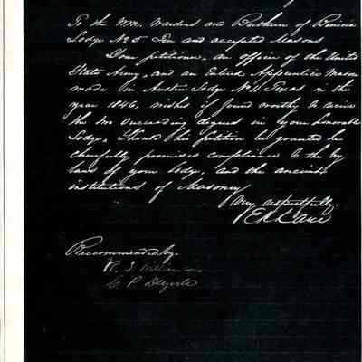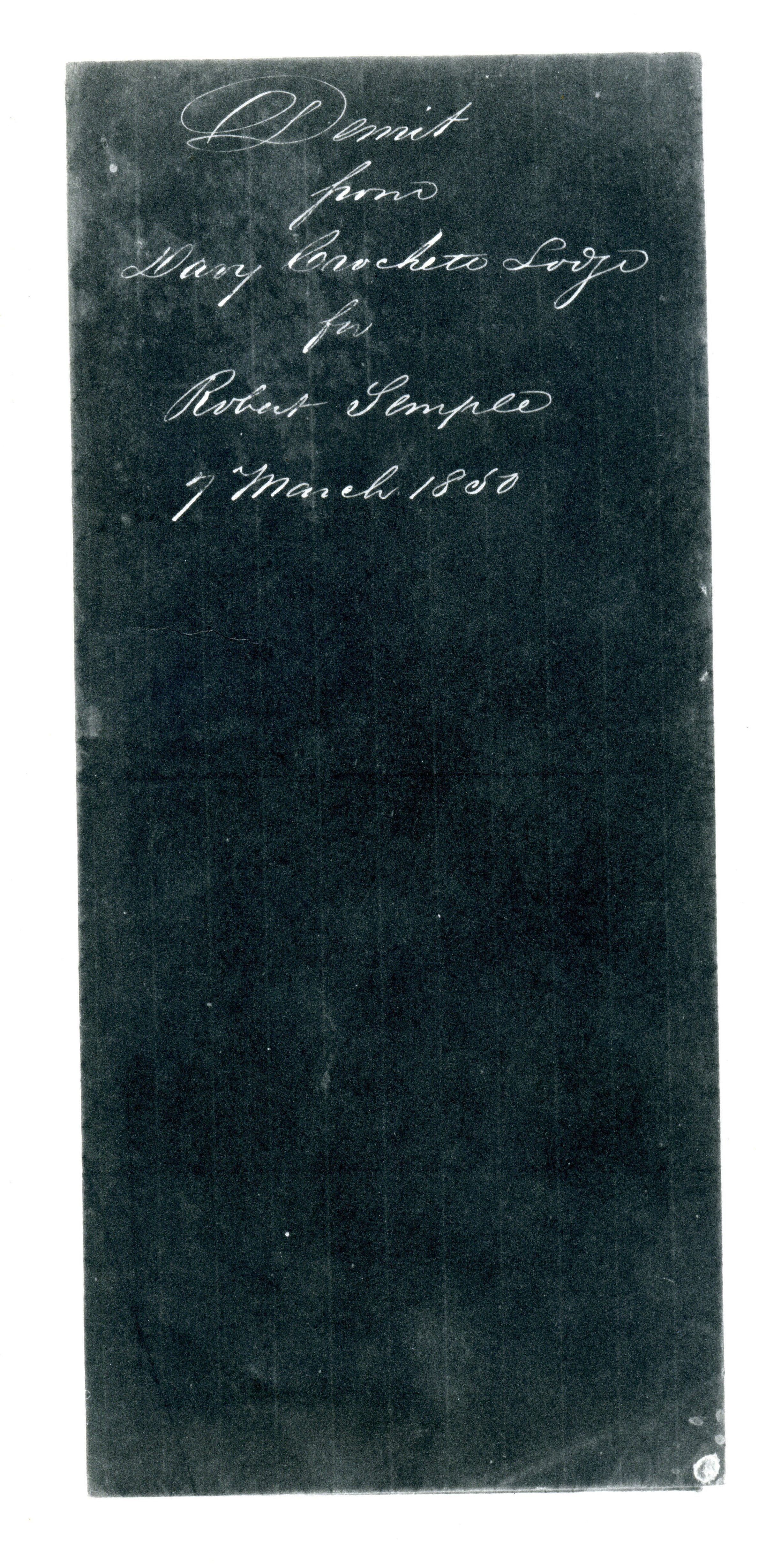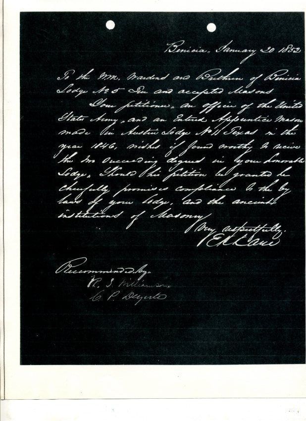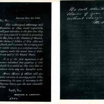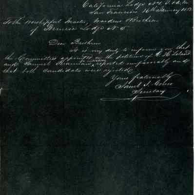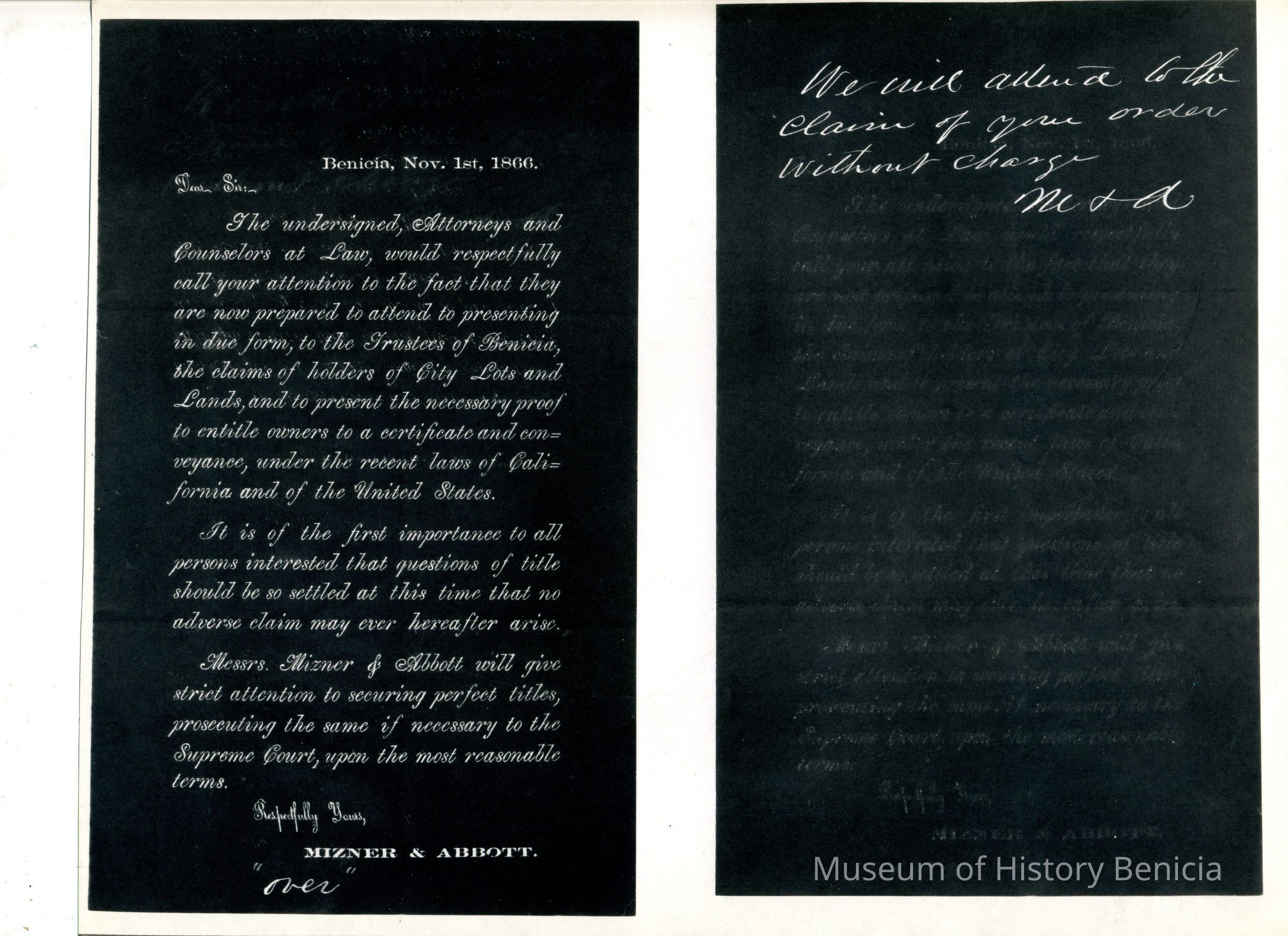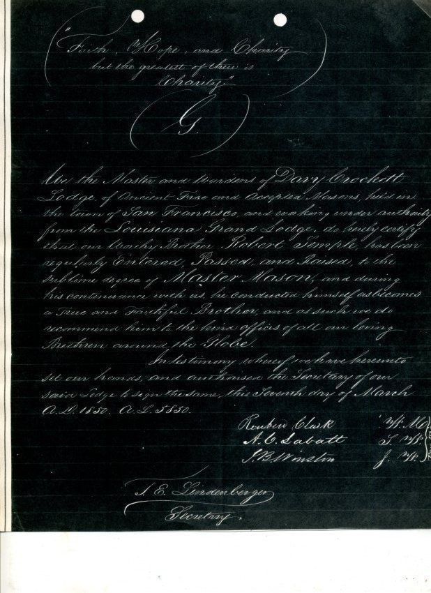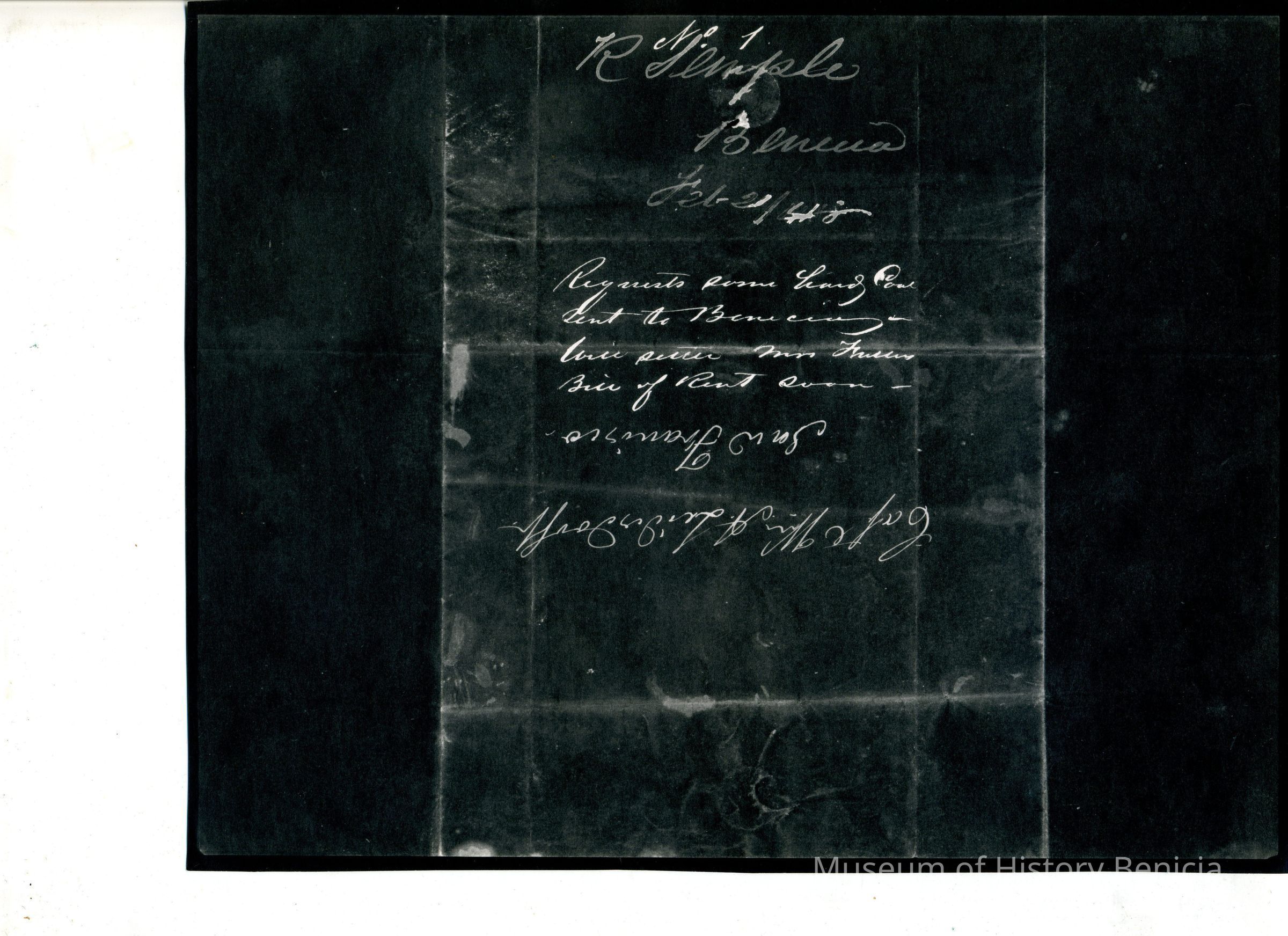This is included in a collection of letters and documents for a forthcoming book published in 1950. Mr Wohlgemuth was contributing chapters to a four volume history of Free Masonry in California which was published in 1950. He was researching Dr. Robert Semple and events of that era. The volumes are available for reference in the Benicia Public Library.Collection